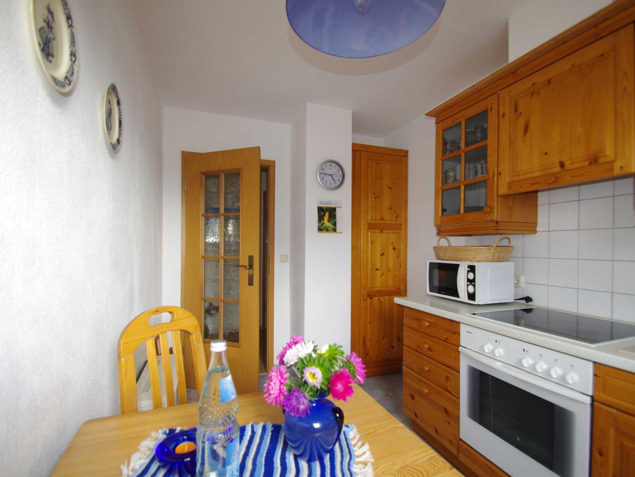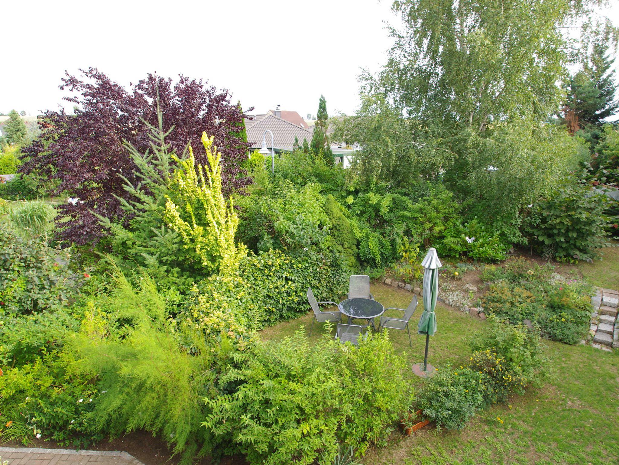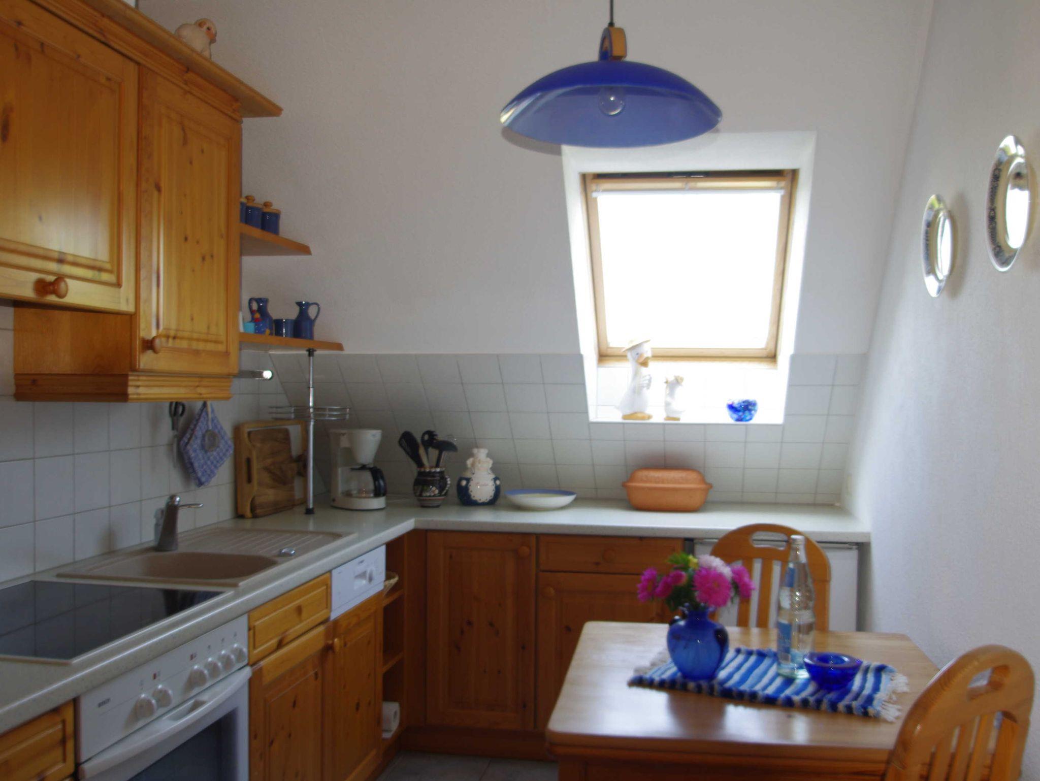 Die Dachgeschoßwohnung mit 65 qm Wohnfläche für 2-4 Personen besteht aus einem Wohnzimmer, 2 Schlafzimmern mit Doppelbetten (Kinderbett, Kinderstuhl, vorhanden auf Anfrage), komplett eingerichtete Küche, Bad mit Dusche/WC. Der Balkon mit Tisch, Stühlen und Sonnenschirm ist vom Wohnzimmer aus begehbar. Die Wohnung ist mit TV, Radio (CD,DVD) Fön und WLAN ausgestattet. Im Garten ist ein Bereich zum Sonnen, Grillen und Spielen. PKW Parkplatz und Unterstellmöglichkeit für Fahrräder ist vorhanden.