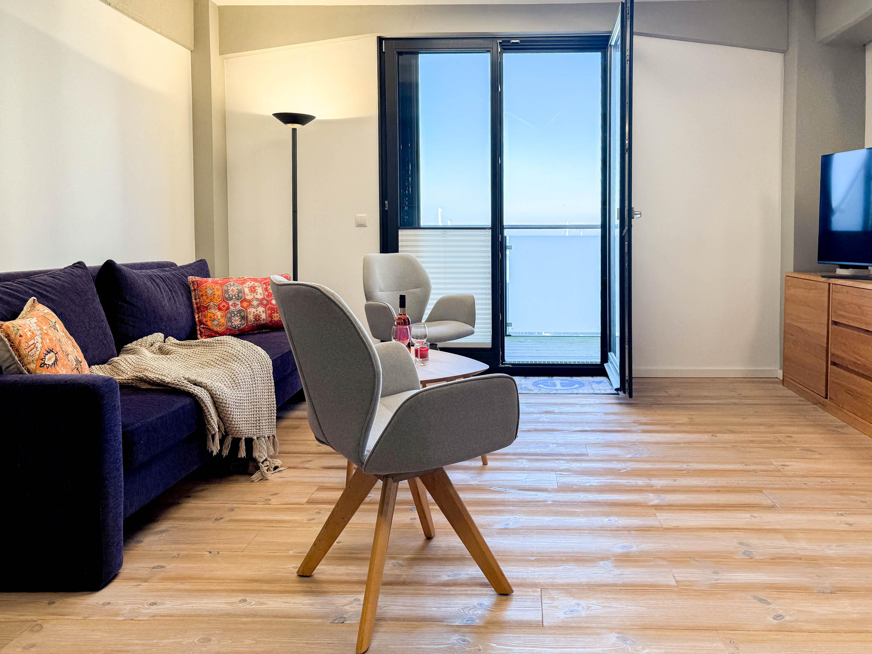 Die Speicherresidenz App. 3.1 empfängt Sie mit einer einladenden Atmosphäre. Der großzügige Wohnbereich mit Schlafcouch und Essplatz lädt zu gemütlichen Abenden ein. In der voll ausgestatteten Küche können Sie Ihre Lieblingsgerichte zubereiten, die Sie anschließend auf dem Balkon mit Wasserblick genießen können. Die Schlafzimmer bieten komfortable Ruhe, während das moderne Badezimmer mit ebenerdiger Dusche und ein zusätzliches Gäste-WC zusätzlichen Komfort bieten.