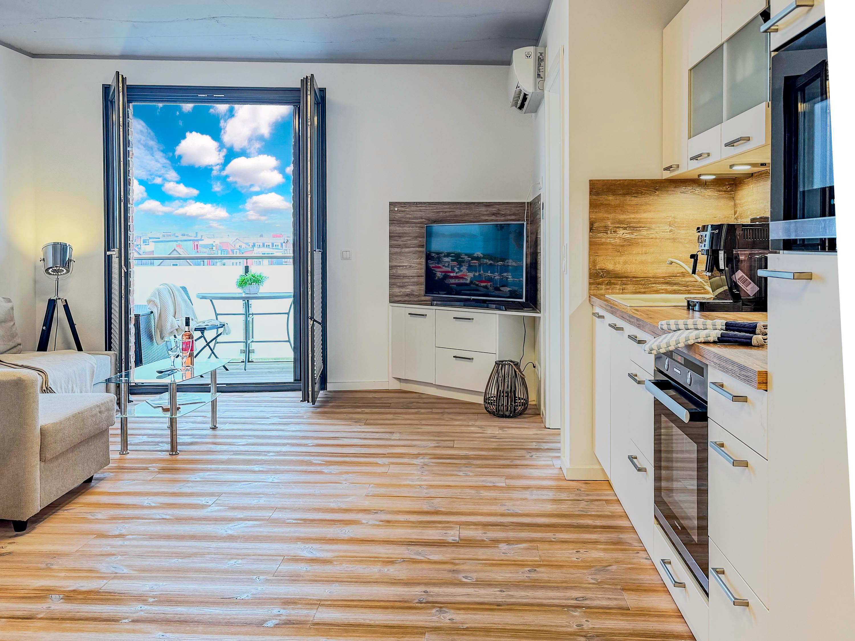 Die Speicherresidenz App. 3.7 empfängt Sie mit einer einladenden Atmosphäre. Der Wohnbereich mit Schlafcouch und Essplatz lädt zu gemütlichen Abenden ein. In der voll ausgestatteten Küchenzeile können Sie Ihre Lieblingsgerichte zubereiten, die Sie anschließend auf dem Balkon mit seitlichem Wasserblick genießen können. Das separate Schlafzimmer bietet komfortable Ruhe, während das moderne Badezimmer mit Dusche zusätzlichen Komfort bietet.