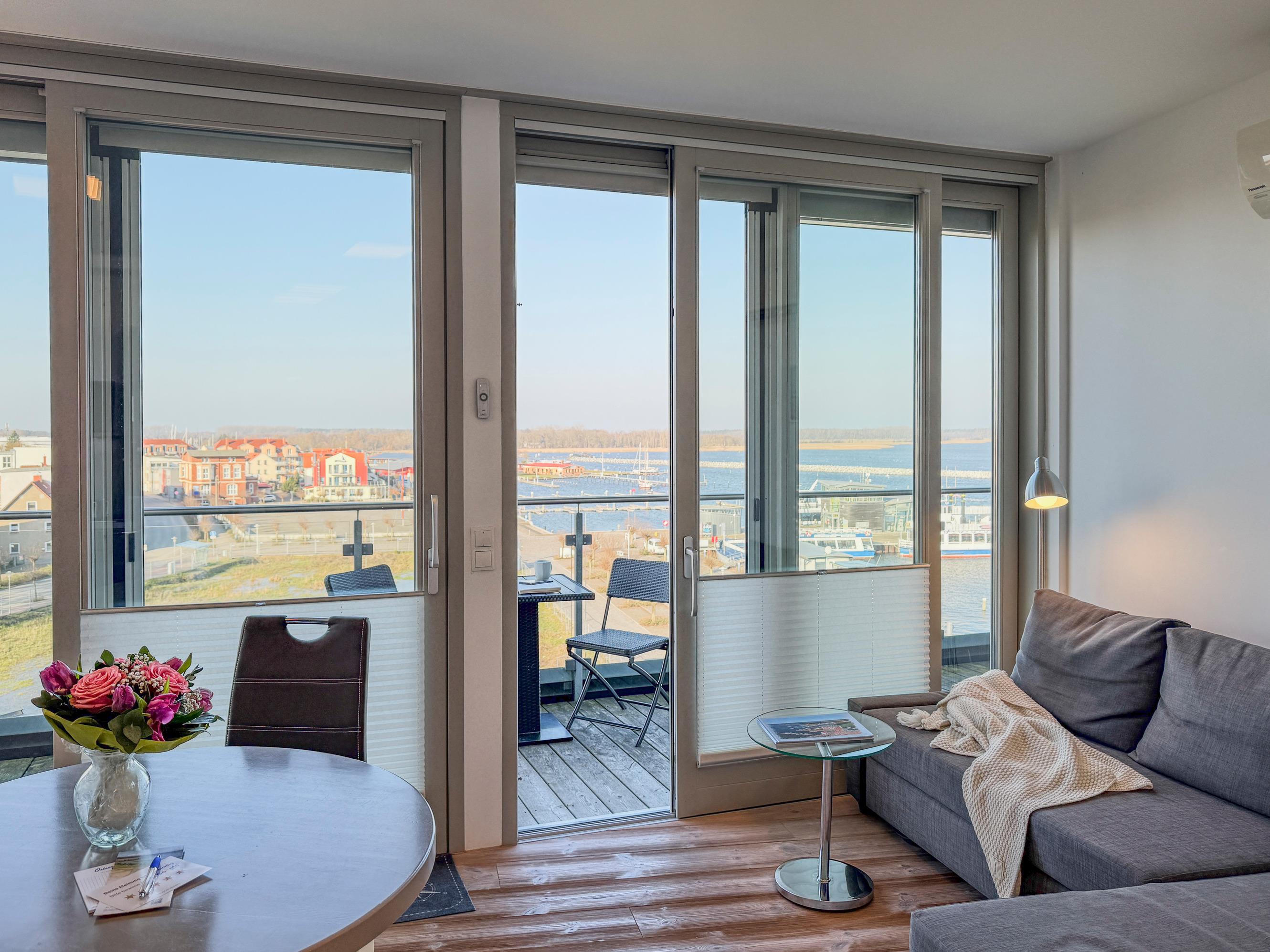 Dieses stilvolle Apartment im 5. Obergeschoss bietet auf 55 m² Platz für bis zu 3 Personen und besticht durch eine Dachterrasse mit seitlichem Wasserblick.