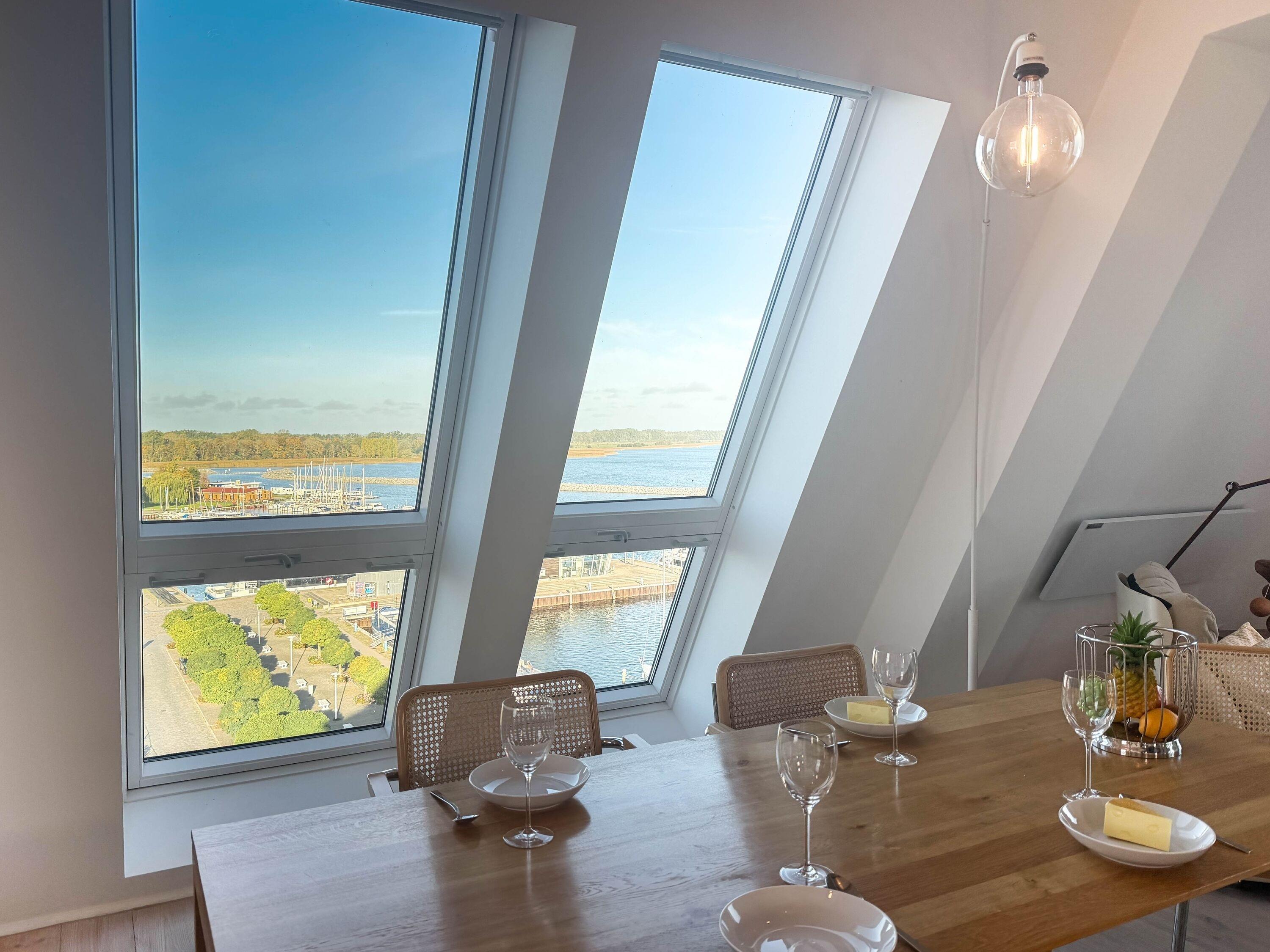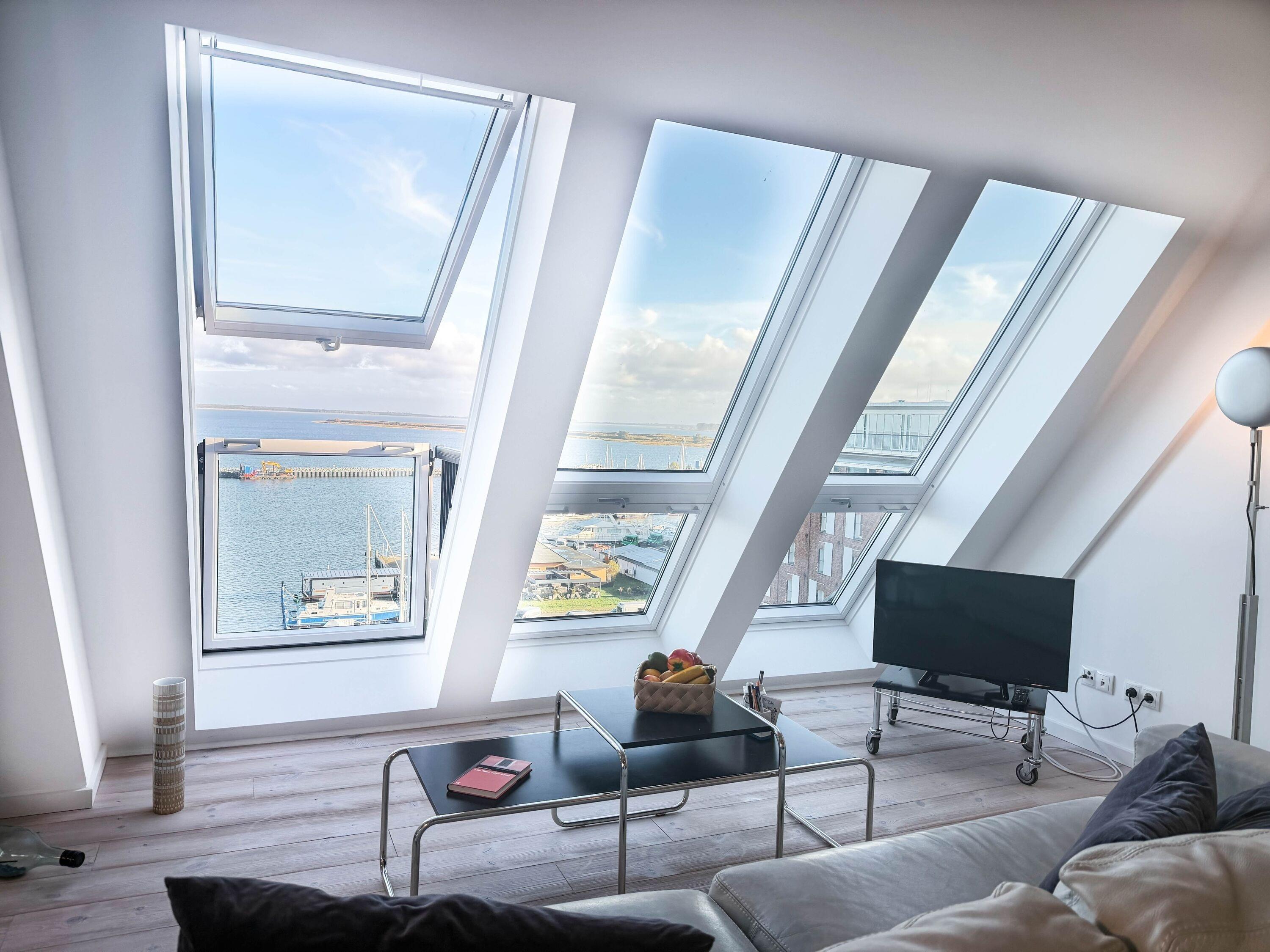 Balkon/Loggia: Besonderes Highlight – ein ausklappbares Fenster mit Loggia, das den Blick über den Hafen in Szene setzt und frische Seeluft hereinlässt