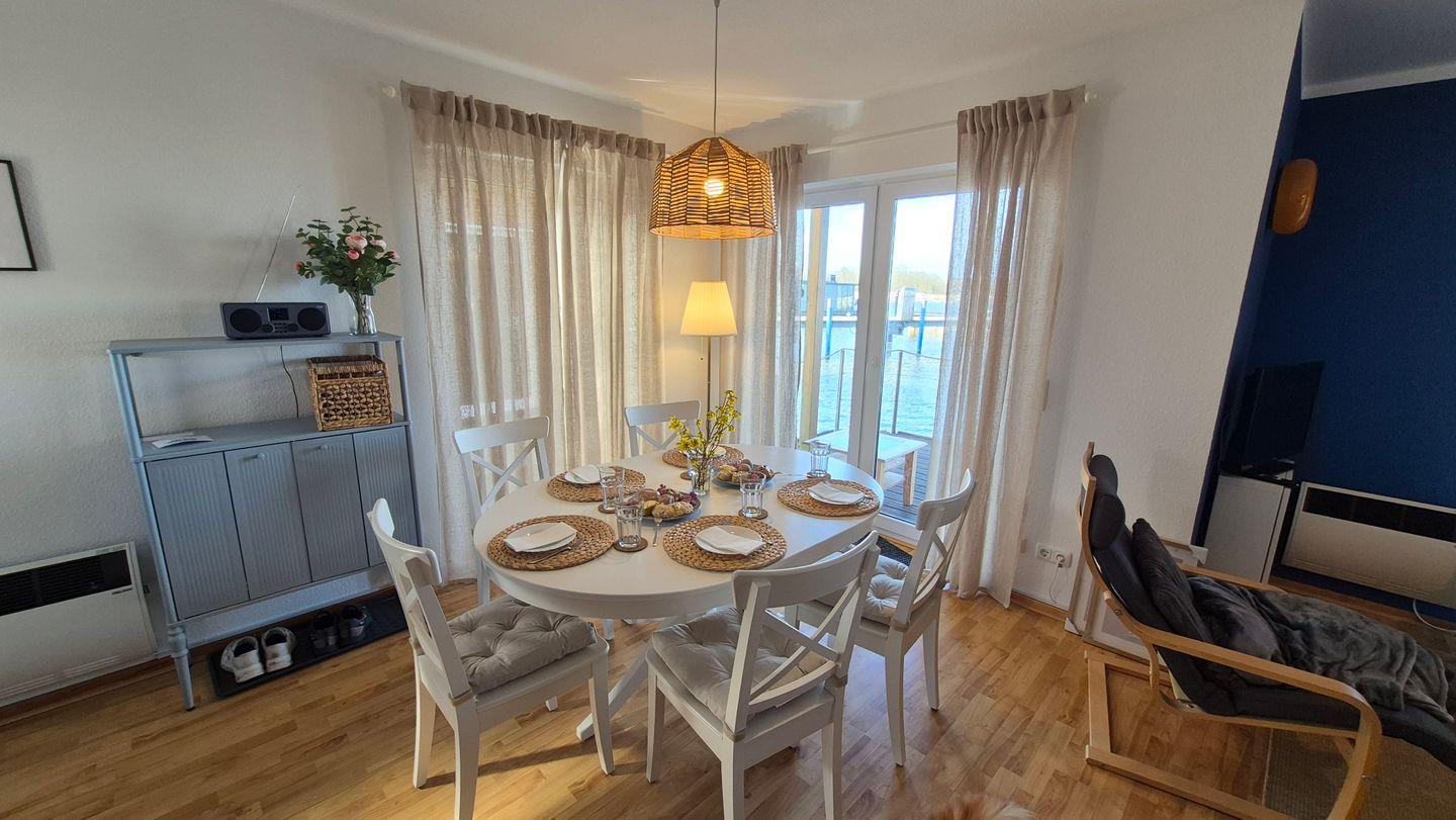 Im 1. Deck befindet sich das geräumige Wohnzimmer mit Essecke und Küchenzeile. Das Wohnzimmer ist modern-maritim eingerichtet mit einem Sofa und Schwing-Sessel. Der Esstisch bietet Sitzgelegenheiten für bis zu 6 Personen, ein Kinderhochstuhl steht Ihnen kostenlos zur Verfügung. An das Wohnzimmer schließt sich eine Terrasse an, hier stehen 4 Gartenstühle und ein Tisch für Sie bereit.