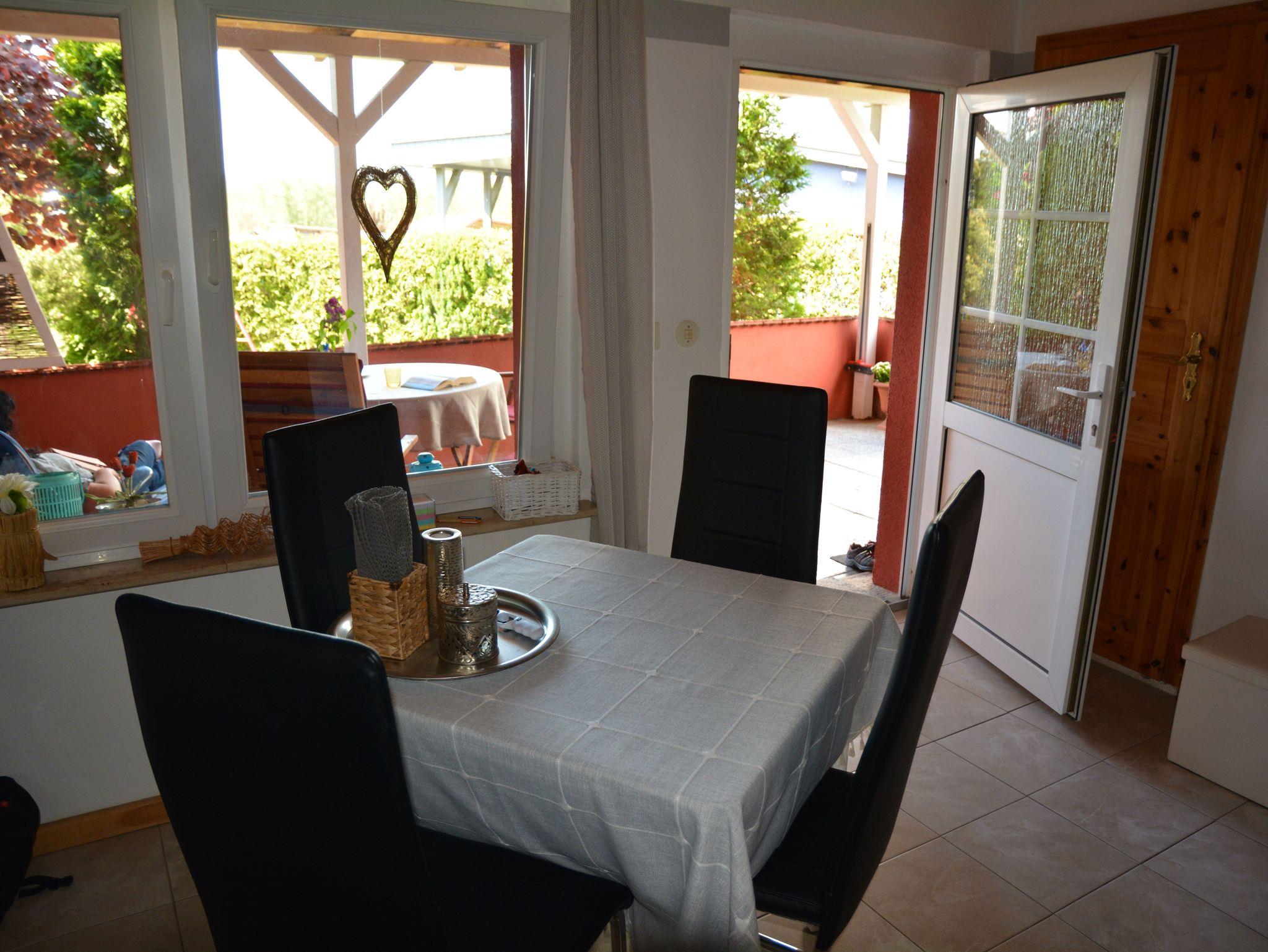 Die überdachte Terrasse mit der gemütlichen kleinen Sitzgruppe mit 4 Stühlen lädt zu einem entspannten Frühstück oder einem ruhigen Abend mit Blick Richtung See ein.