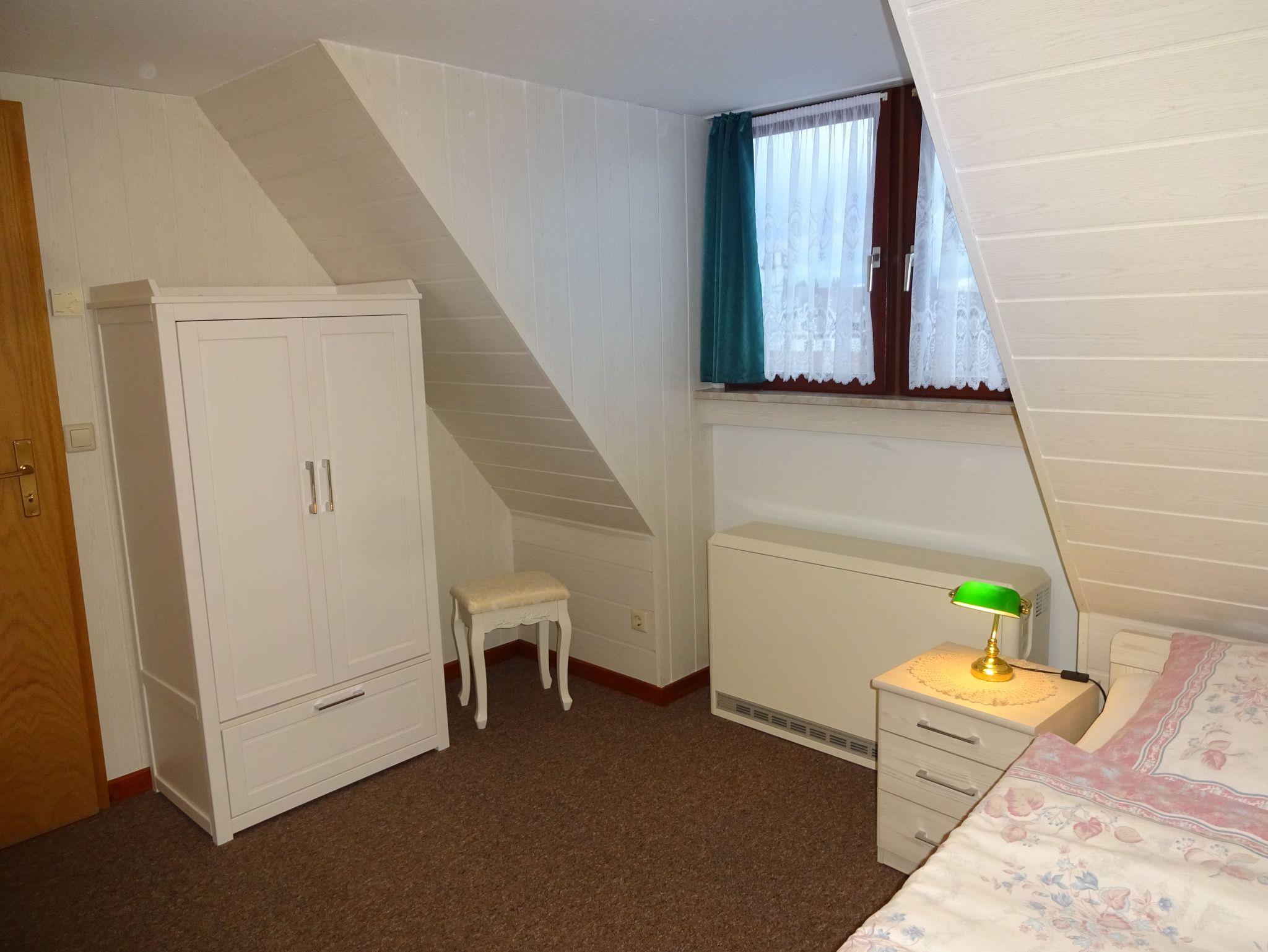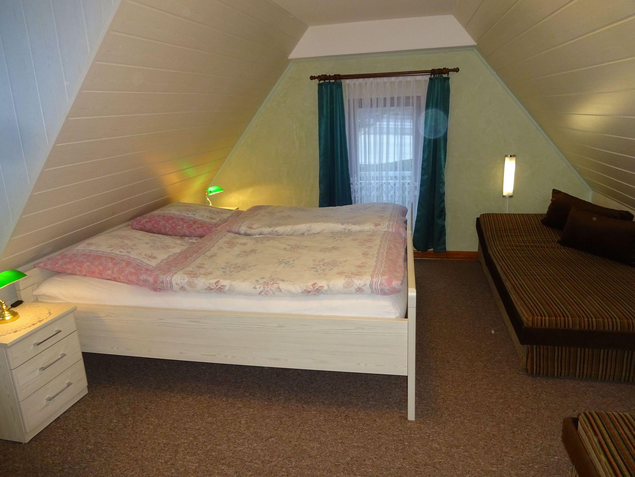 • 1 Schlafzimmer im Obergeschoss mit 1 Doppelbett und 2 Einzelbetten (zu erreichen über eine Raumspar-Treppe mit breiter Auftrittsfläche.