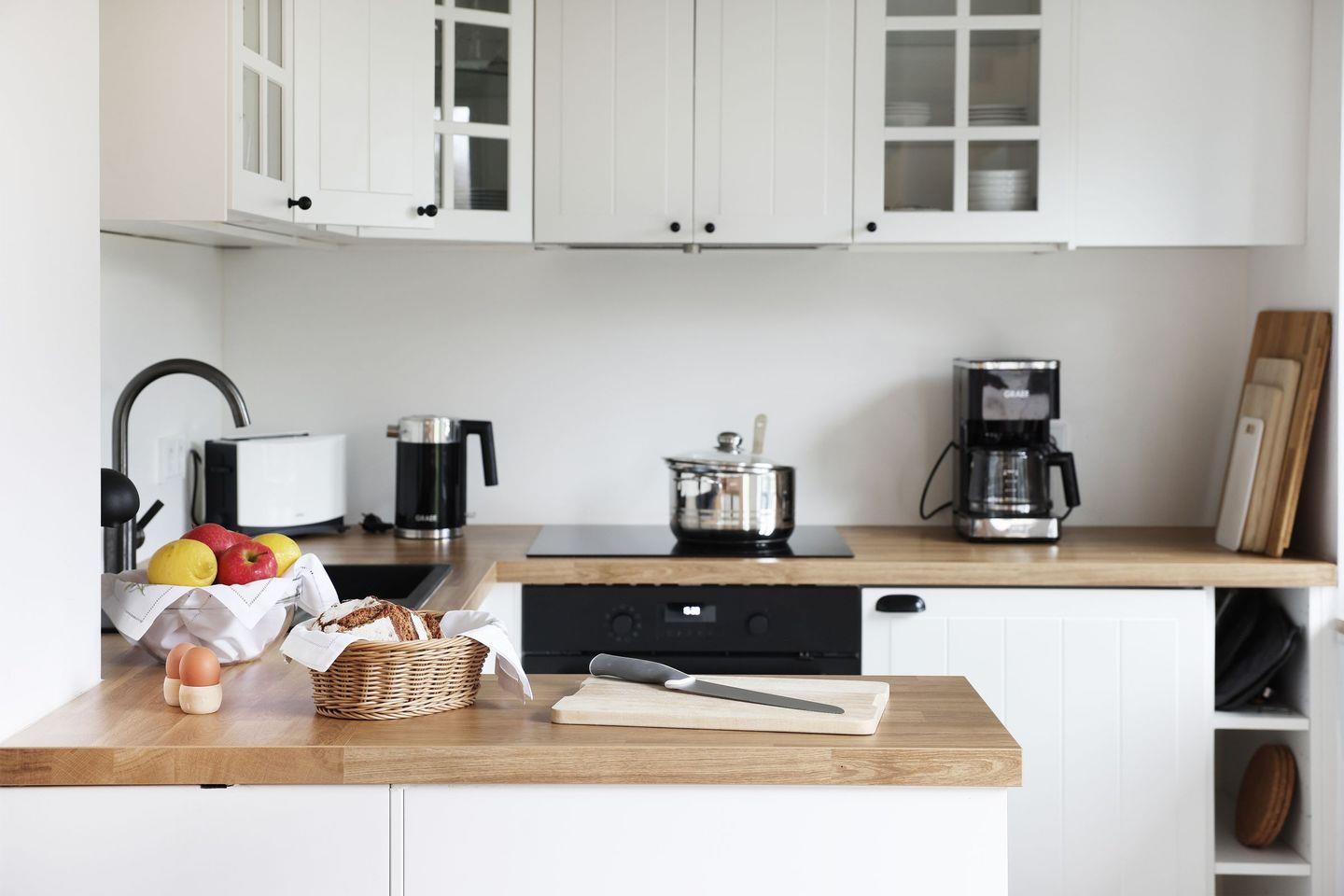 Die moderne, voll ausgestattete Küche mit Tresen, Herd, Backofen und Geschirrspüler lädt zum gemeinsamen Kochen ein. Im Obergeschoss befinden sich zwei komfortable Schlafzimmer. Eine Fußbodenheizung sorgt auch an kühleren Tagen für angenehme Wärme.