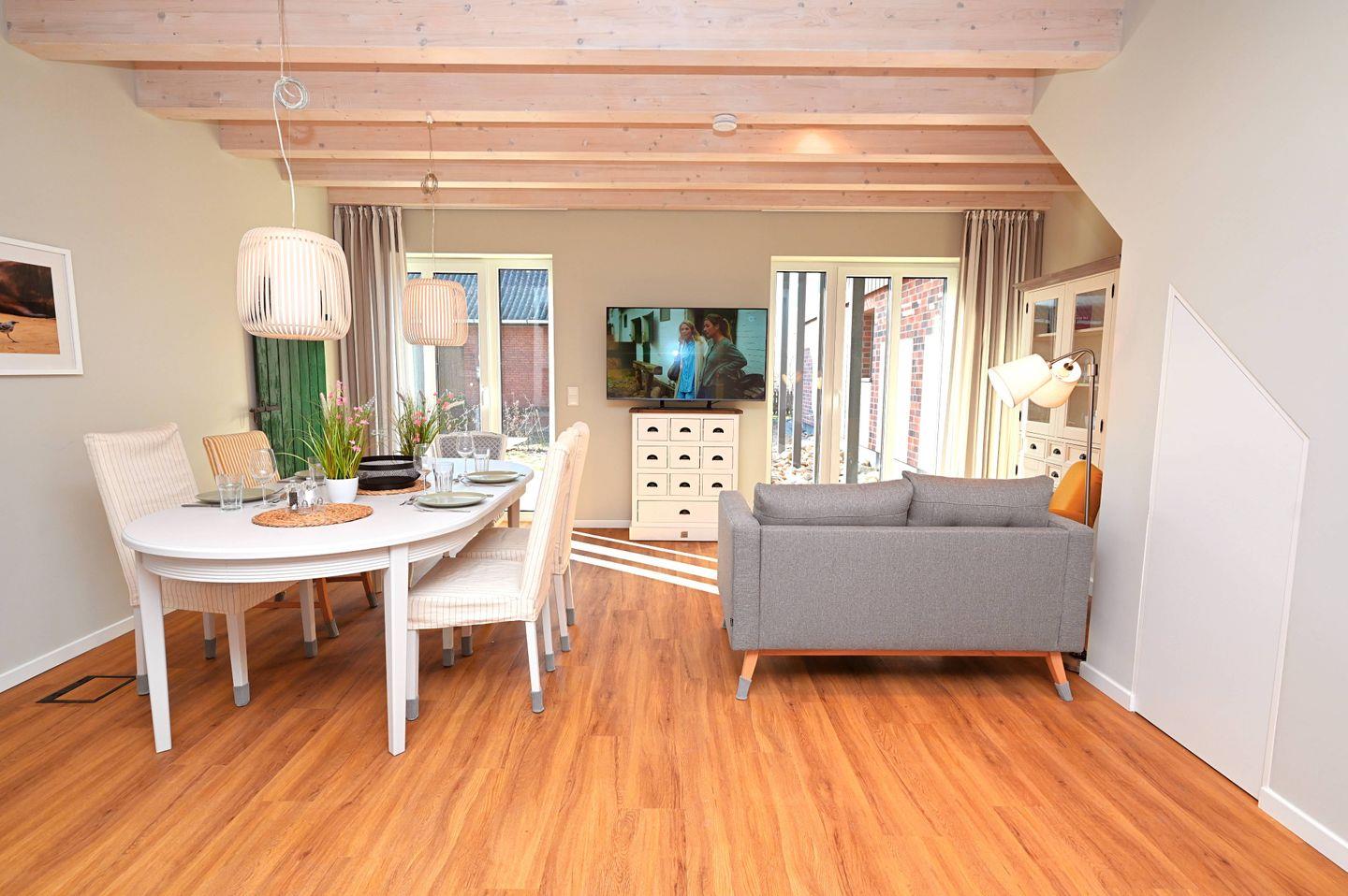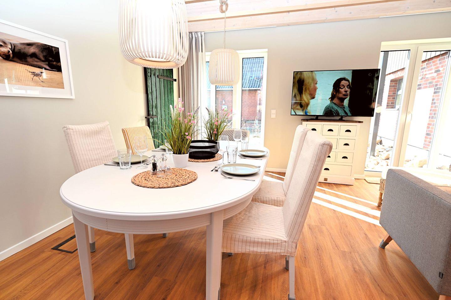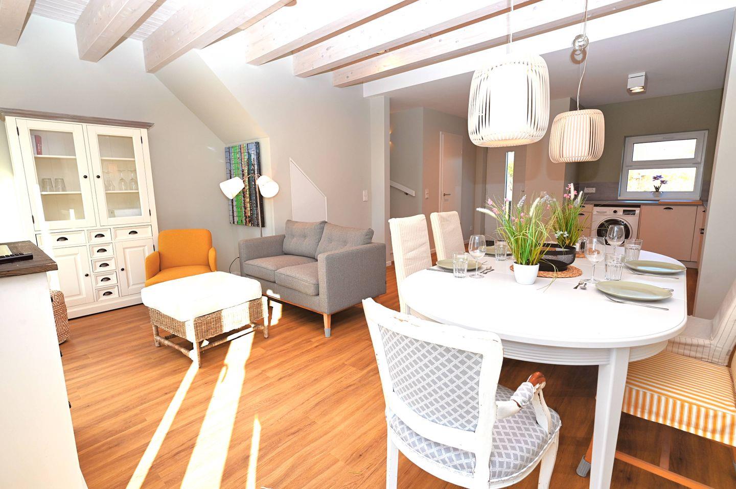 Der Wohnbereich ist mit Sofaecke, Sofa, Sessel, TV und WLAN ausgestattet und lädt zu entspannten Stunden nach einem Tag am Strand oder bei Ausflügen ein. Bücher stehen ebenfalls zur Verfügung. Die offene Küche ist direkt mit dem Wohnzimmer verbunden und praktisch in den Essbereich integriert. Zur Ausstattung gehören Cerankochfeld, Backofen, Kühlschrank mit Gefrierfach, Spülmaschine, Kaffeemaschine, Wasserkocher, Toaster, Mixer sowie Geschirr, Besteck und Küchenutensilien. Ein Esstisch ergänzt den Bereich für gemeinsame Mahlzeiten.