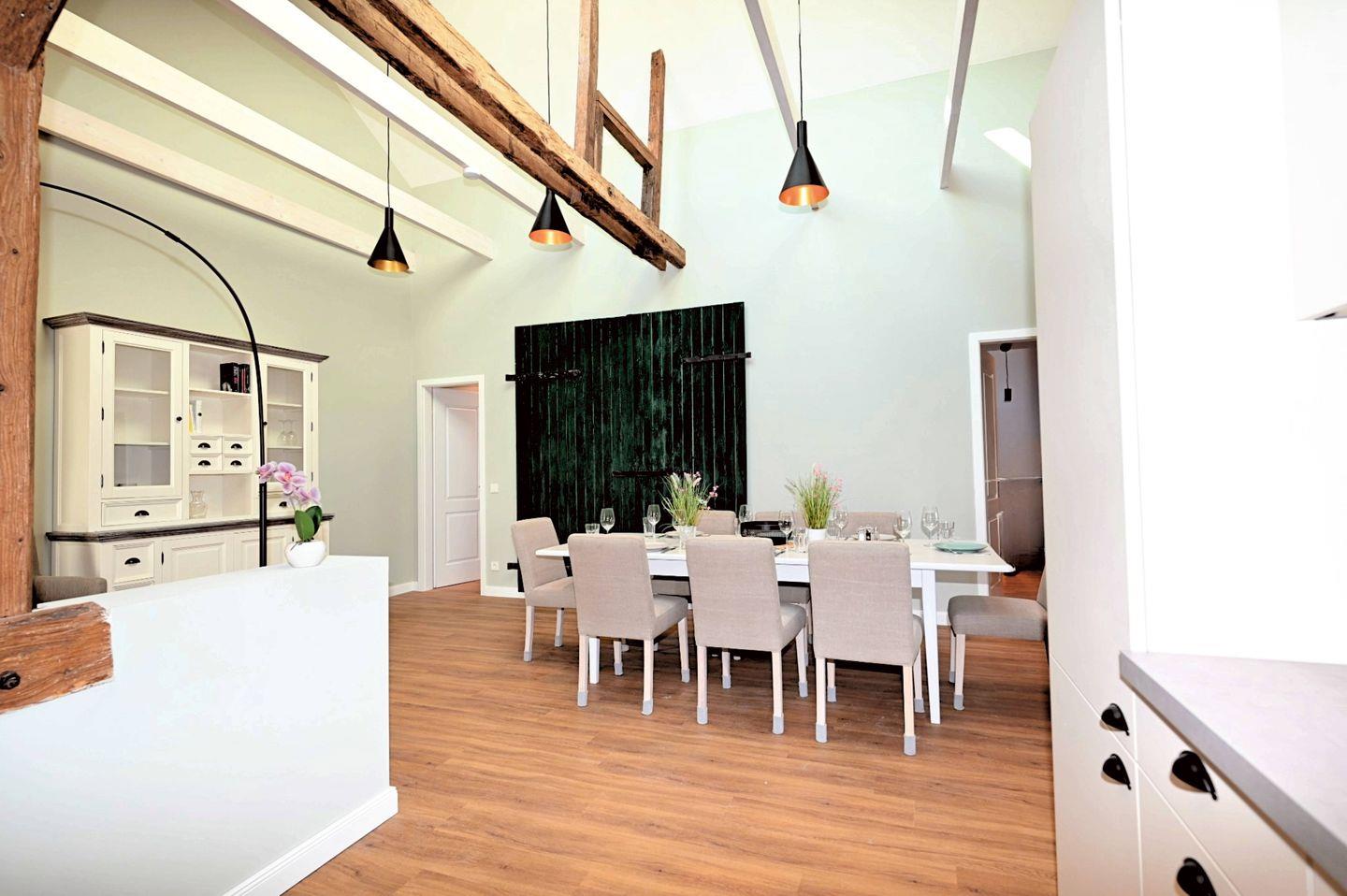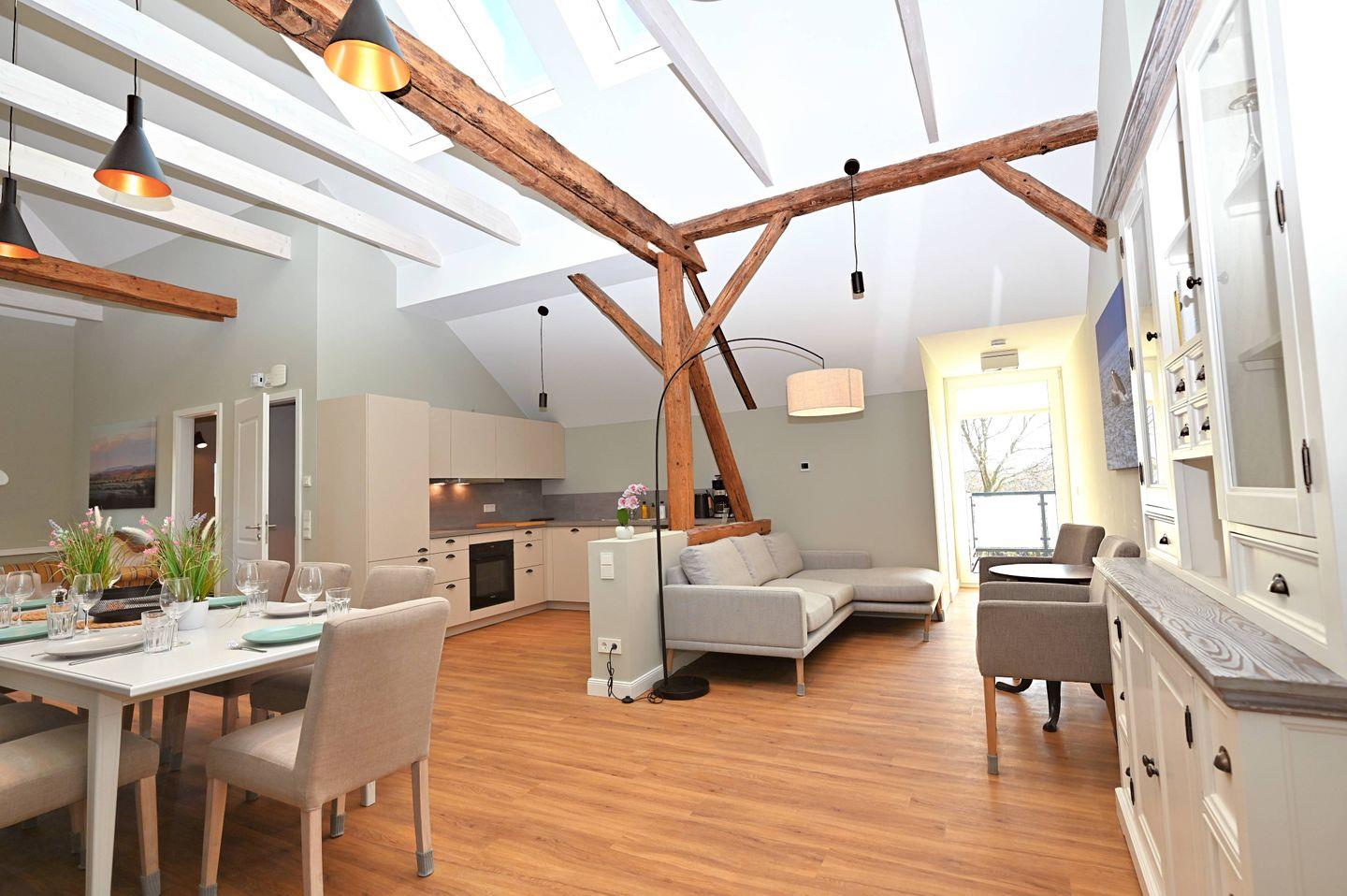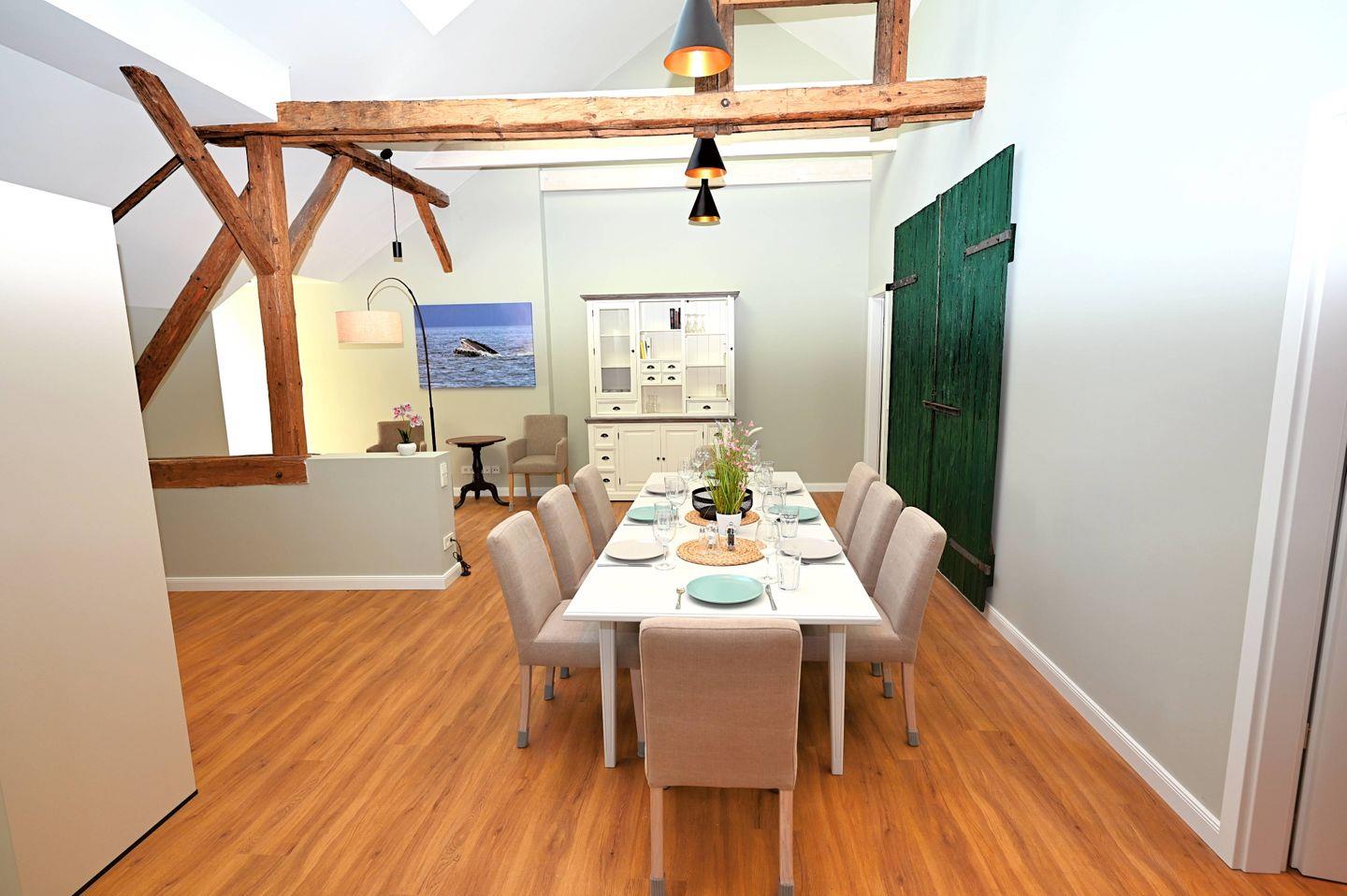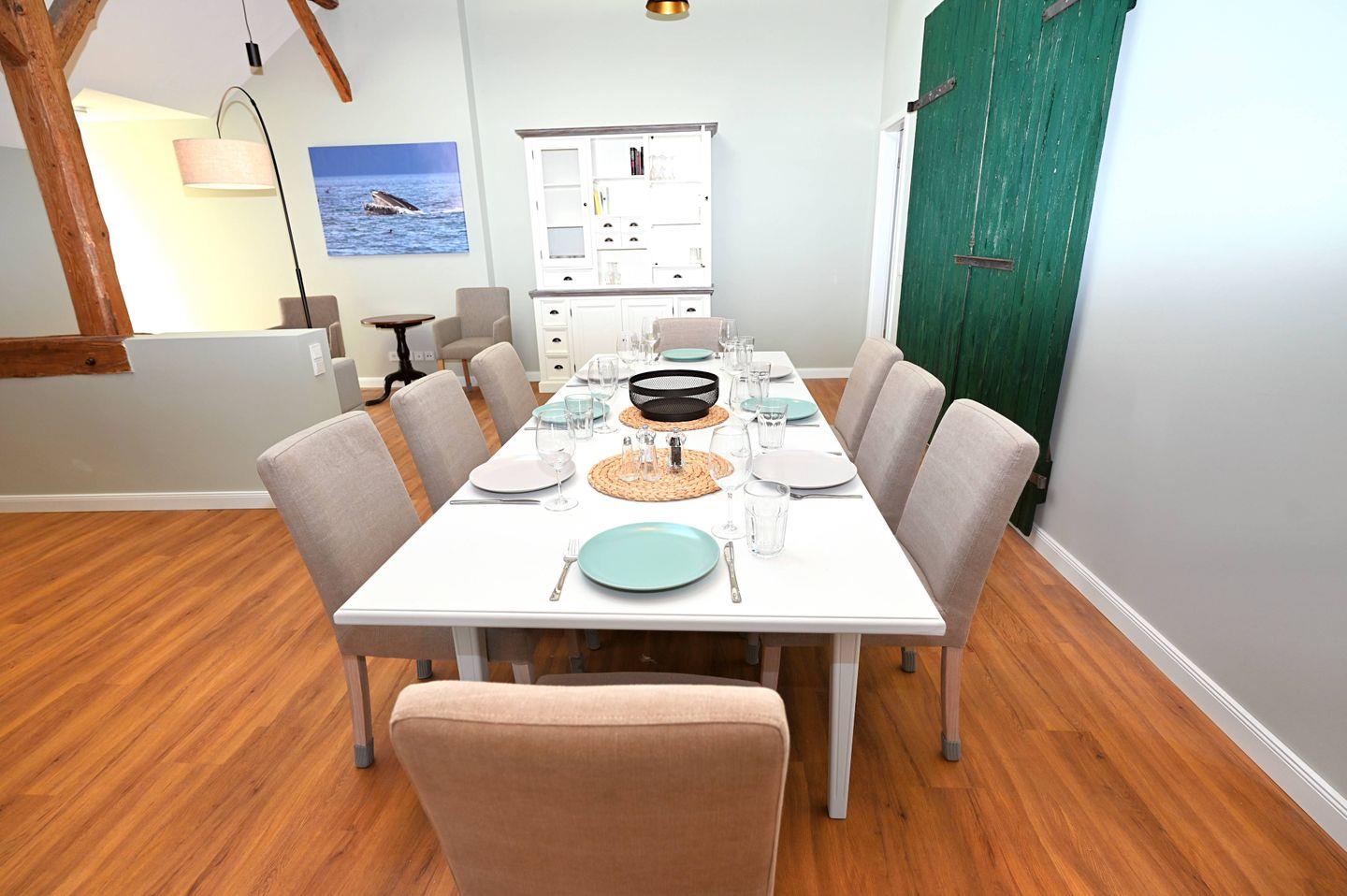 Die offene Küche ist direkt mit dem Wohnbereich verbunden und praktisch auf den Aufenthalt mehrerer Personen ausgerichtet. Zur Ausstattung gehören Cerankochfeld, Backofen, Kühlschrank mit Gefrierfach, Spülmaschine, Wasserkocher, Toaster, Kaffeemaschine, Mixer sowie Küchenutensilien, Geschirr und Besteck. Ein Essbereich mit Esstisch ergänzt das Raumangebot und schafft gute Voraussetzungen für gemeinsame Mahlzeiten.