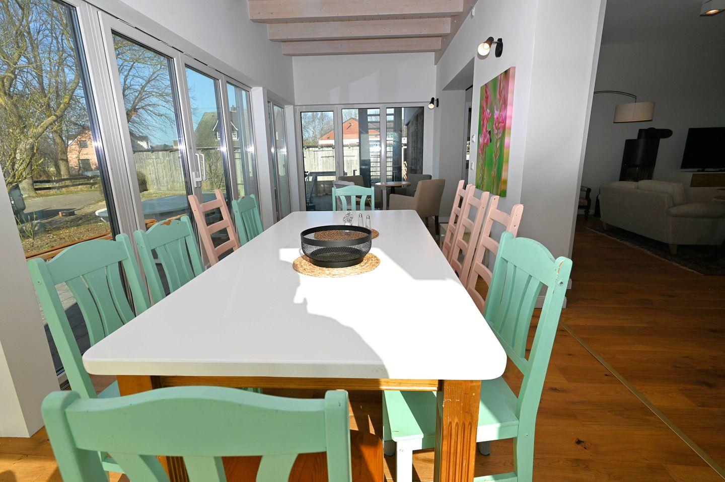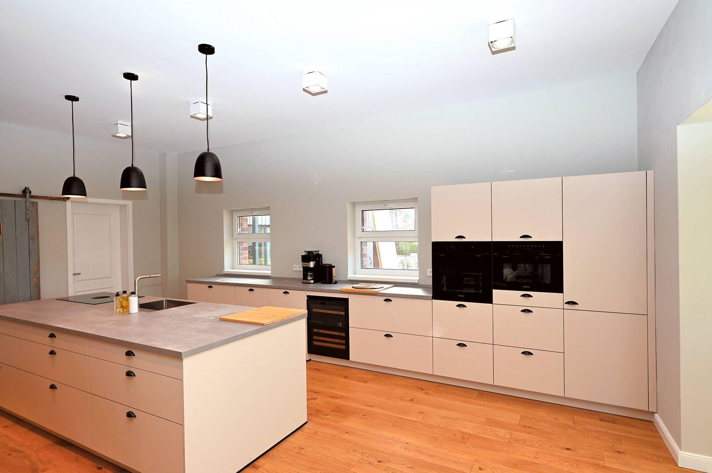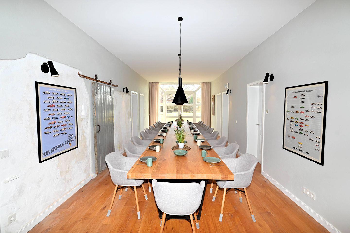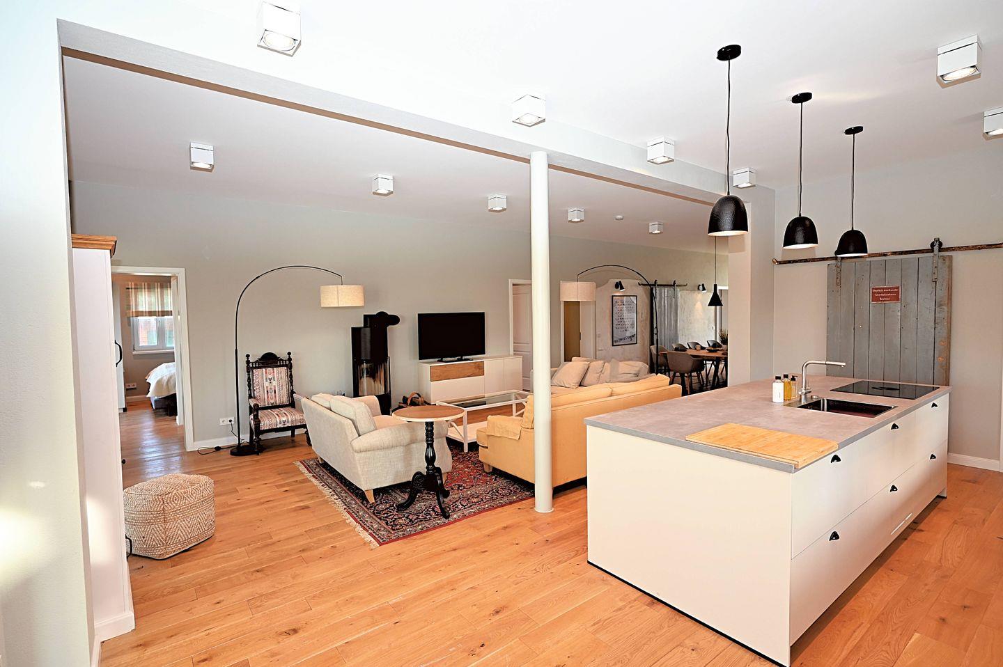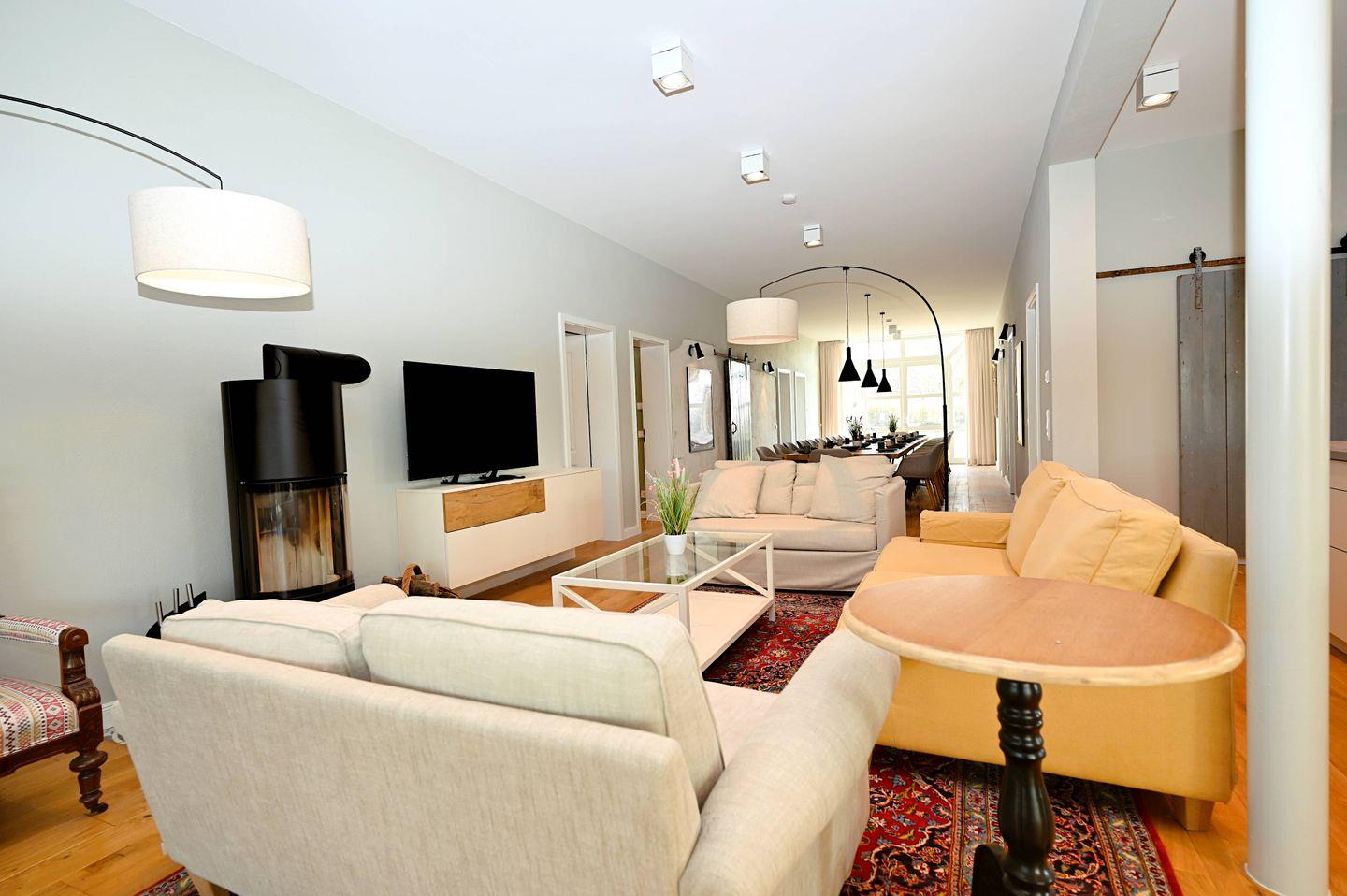 Der Wohnbereich ist offen gestaltet und mit Sofaecke, Sofa, Sesseln, Esstisch für 24 Personen, Essbereich und TV ausgestattet. Die offene Küche ist direkt zum Wohnzimmer hin angelegt und bietet mit Cerankochfeld in einer sehr großen Kochinsel, Backofen, Mikrowelle, Kühlschrank mit Gefrierfach, Weinkühlschrank, Spülmaschine, Wasserkocher, Toaster, Kaffeemaschine, Mixer sowie Geschirr und Besteck eine praktische Grundlage für die Selbstversorgung. Auch Gewürze sind vorhanden. Ein Schreibtisch, Bücher, Garderobe, Kommode, Ganzkörperspiegel und Wäscheständer ergänzen die Ausstattung sinnvoll. Für längere Aufenthalte stehen Ihnen zudem eine Waschmaschine zur Eigennutzung, Staubsauger sowie WLAN und Internet zur Verfügung.