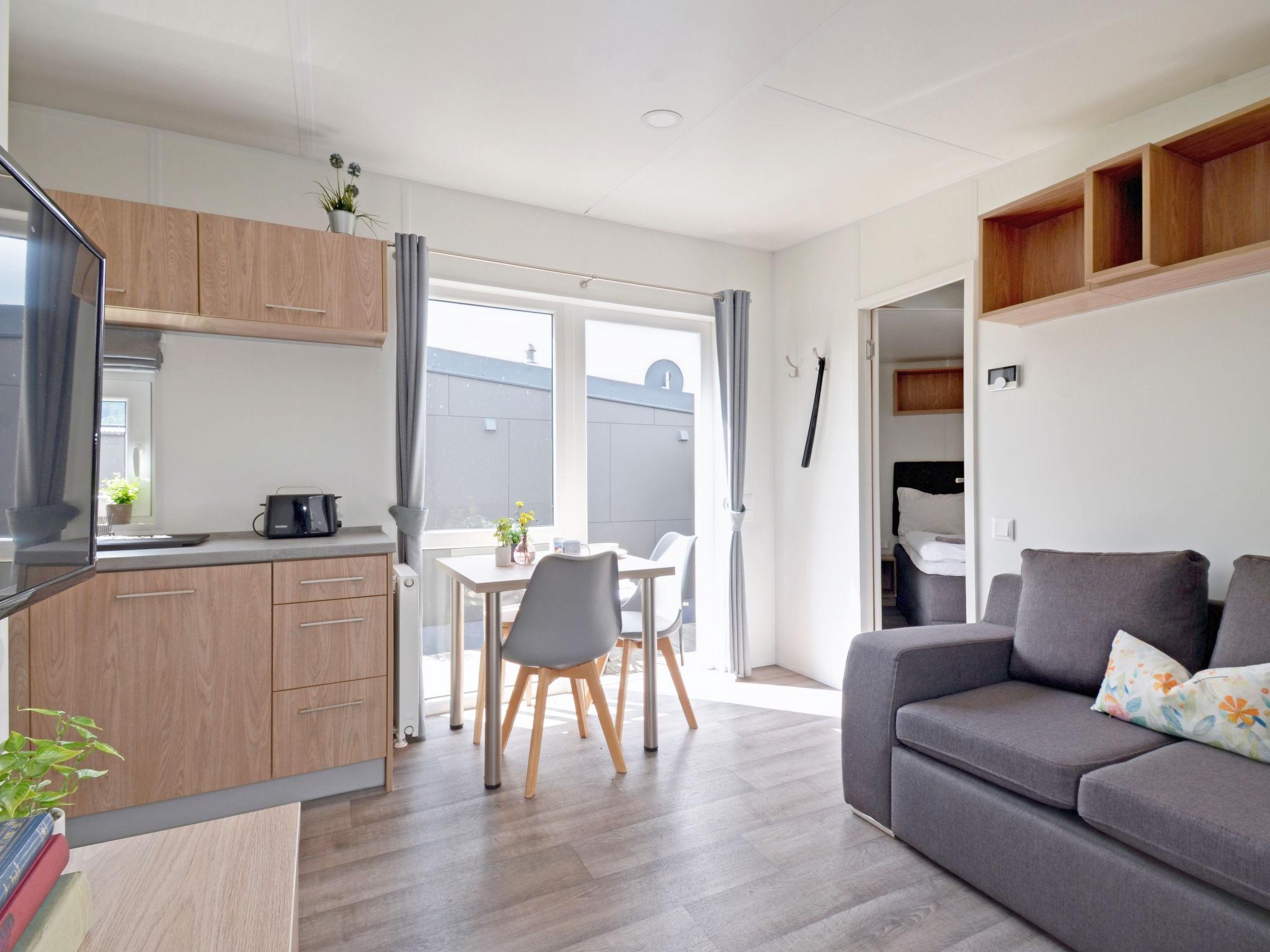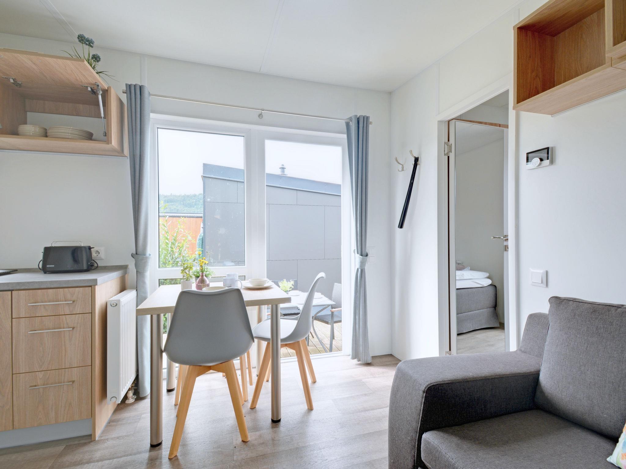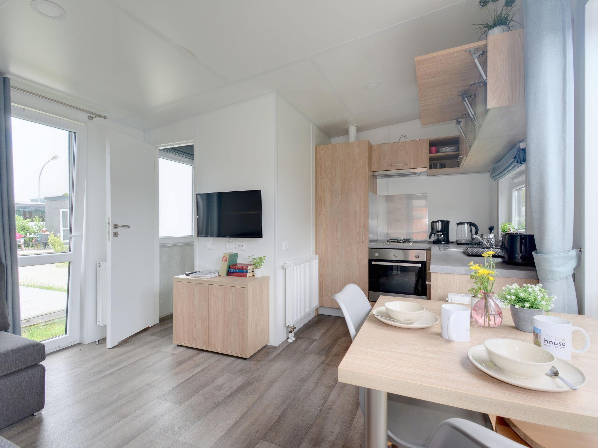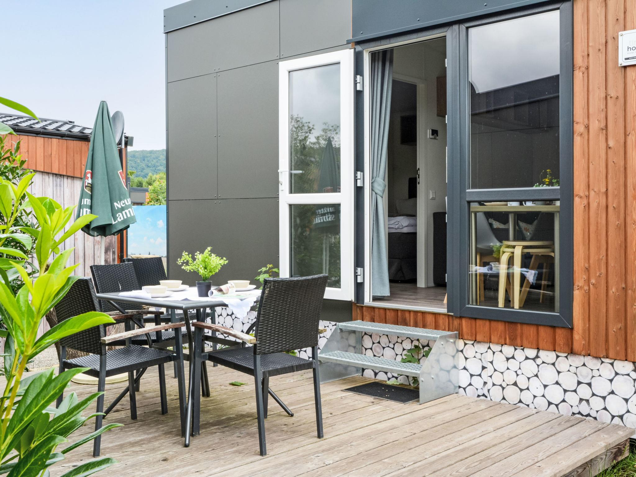 "Tiny Haus Erwine", 2-room mobile home 25 m2. Object suitable for 2 adults + 2 children. Cosy furnishings: living/sleeping room with 1 sofabed (120 cm, length 170 cm), satellite TV. 1 room with 1 french bed (140 cm, length 200 cm). Open kitchen (oven, Gas stove, 2 gas rings, kettle, electric coffee machine). Shower/WC. Gas heating. Small terrace. Terrace furniture. Parking at 50 m. Please note: non-smoking house.