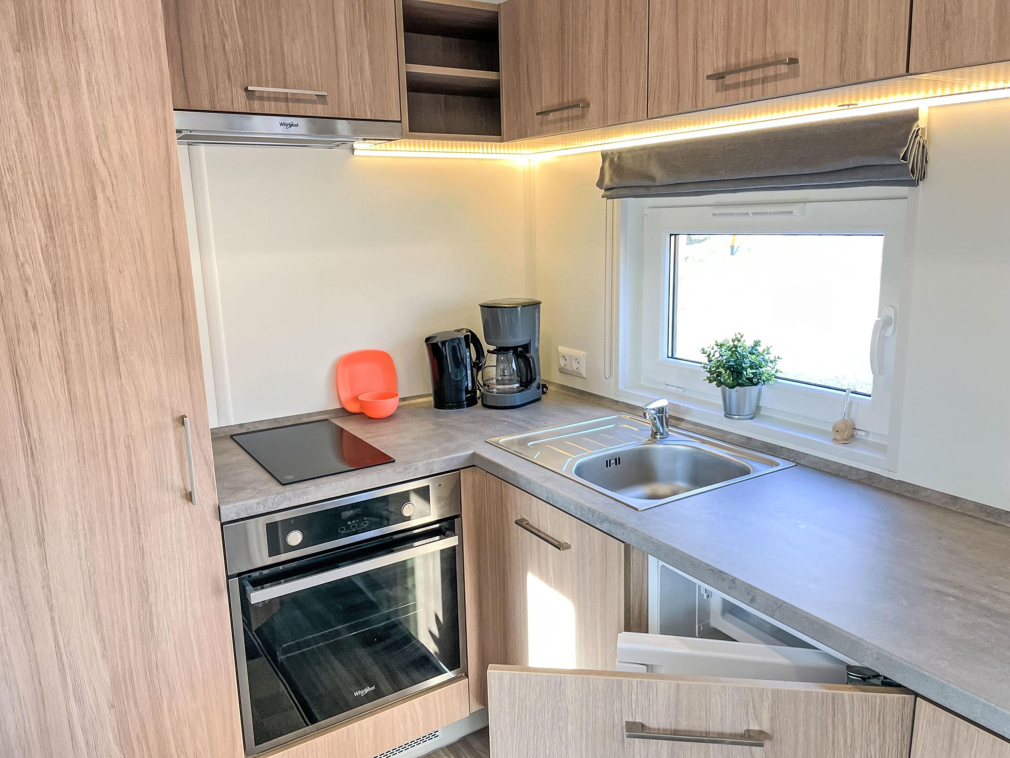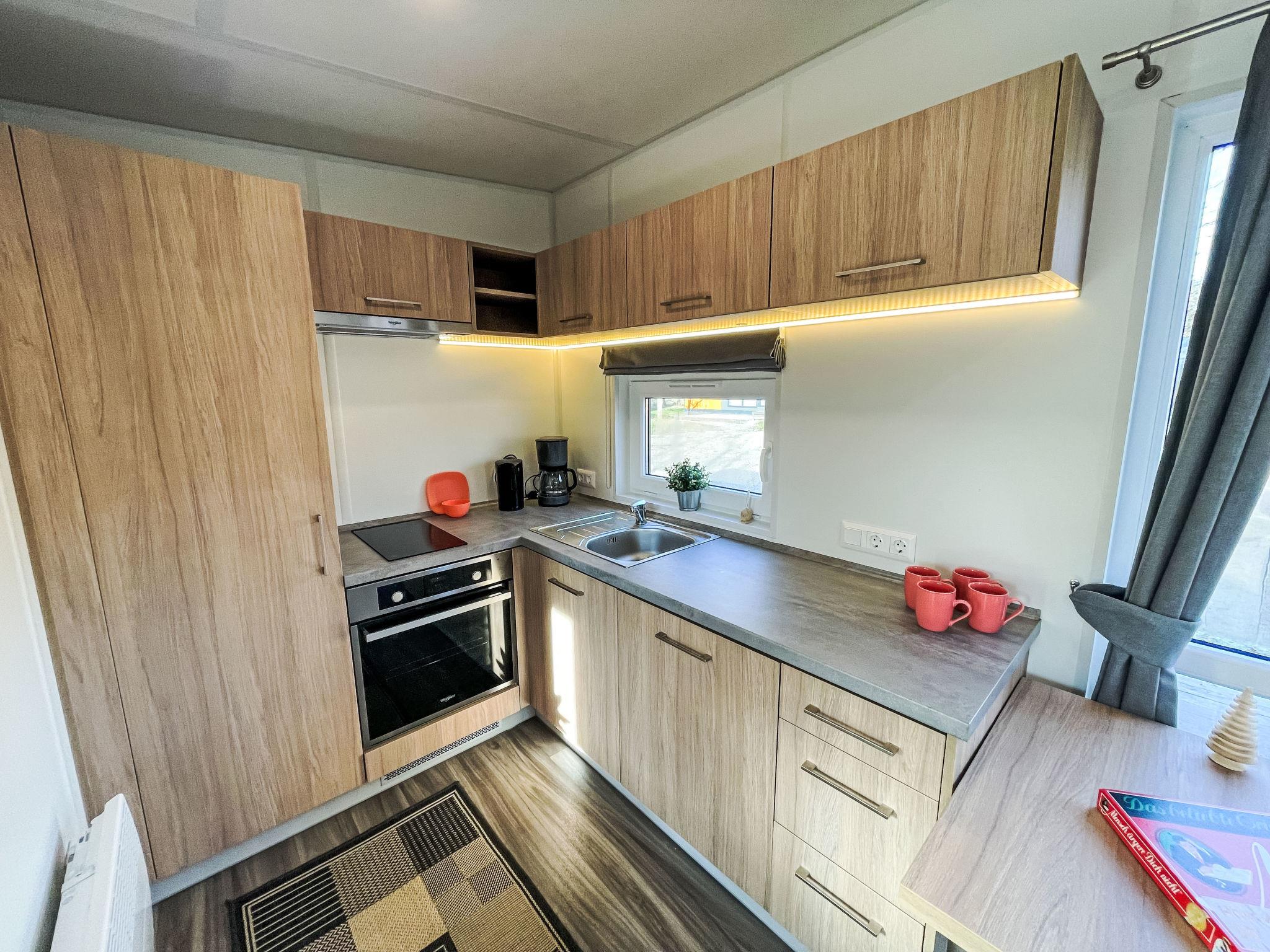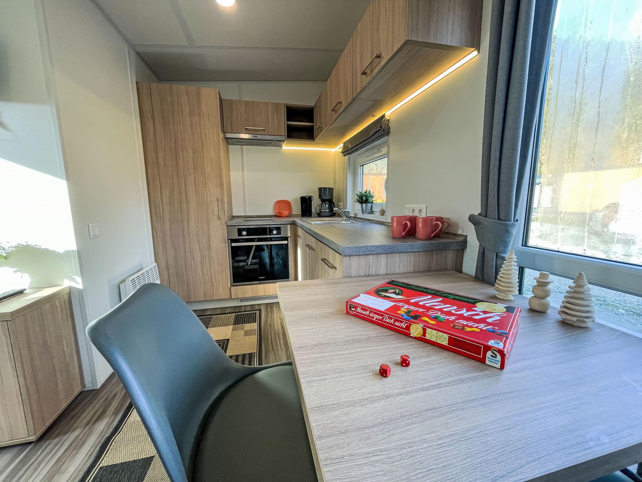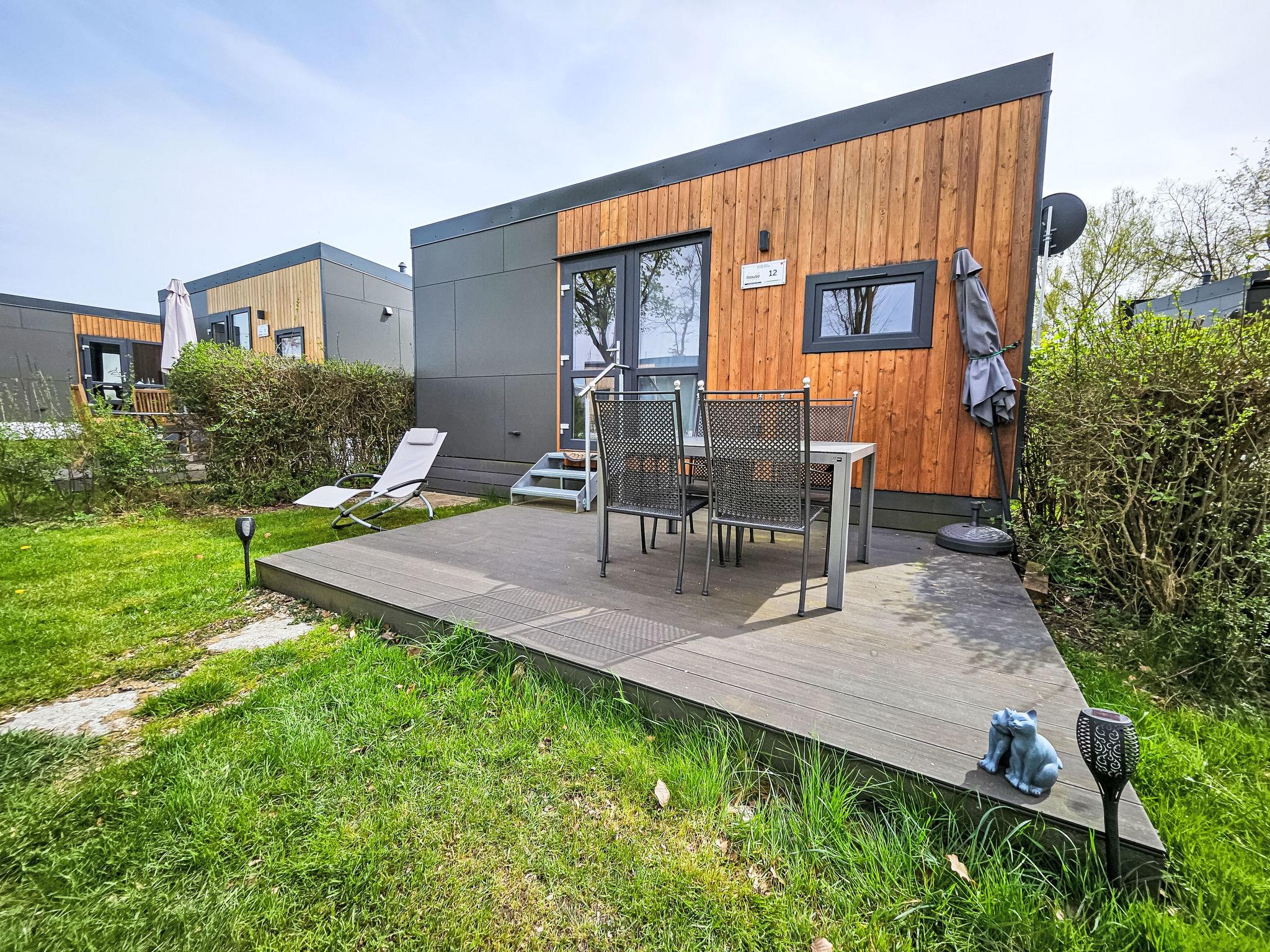 "Tiny Haus Benjamin", 2-room mobile home 25 m2. Object suitable for 2 adults + 2 children. Cosy furnishings: living/sleeping room with 1 sofabed (120 cm, length 170 cm), satellite TV. 1 room with 1 french bed (140 cm, length 200 cm). Open kitchen (oven, Gas stove, 2 gas rings, kettle, electric coffee machine). Shower/WC. Electric heating. Small terrace. Terrace furniture. Parking at 50 m. Please note: non-smoking house.