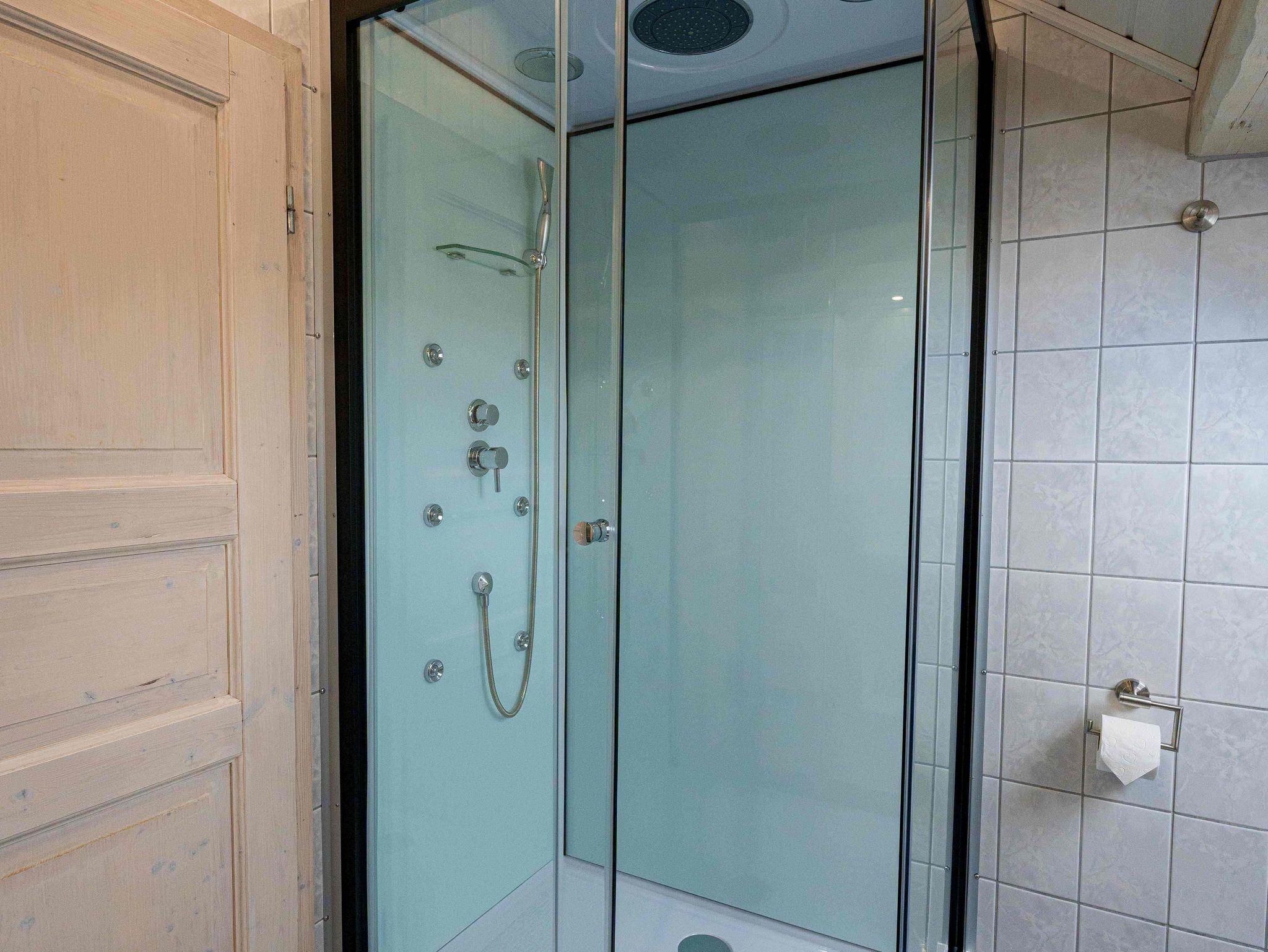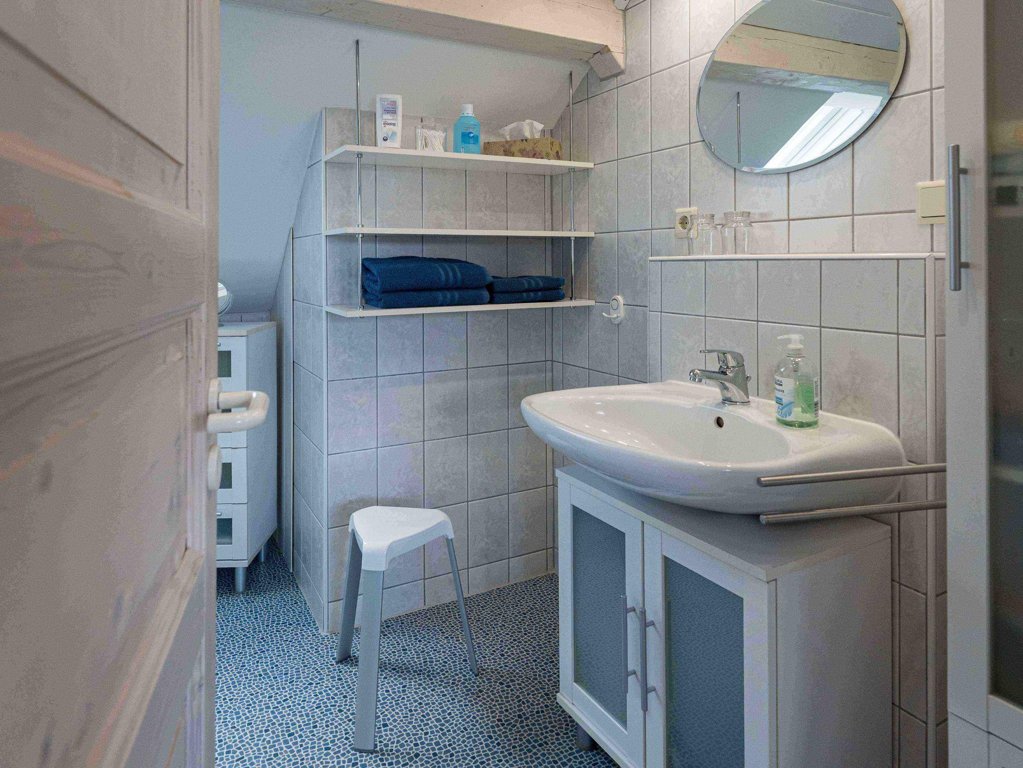 Ihr Badezimmer umfasst eine Dusche, WC und ein Waschbecken mit Unterschrank. Ebenso einen Hochschrank mit ausreichend Hand- und Badetücher, sowie ein Regal zur Ablage, einen Spiegel und einen Schubladenschrank . Zusätzlich ist es mit einem Sitzhocker, einem Fön, und einem Kosmetikspiegel ausgestattet.