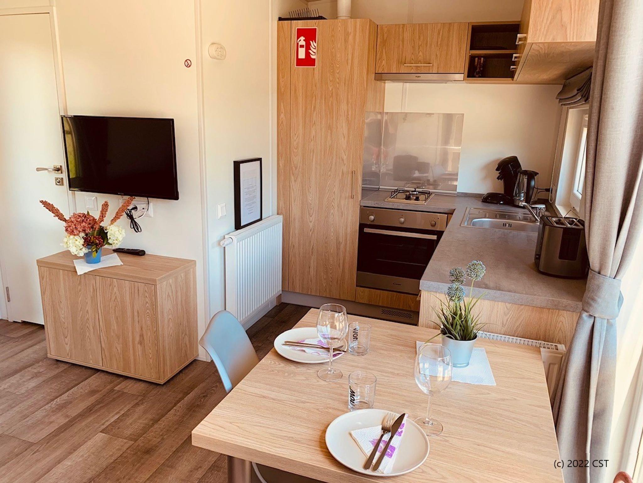 Das Haus ist im modernen Design voll möbliert. Das Schlafzimmer ist mit einem Designerboxspringbett eingerichtet. Im Wohn- und Essbereich befindet sich eine Ausziehcouch für 2 Personen. Die Küche, mit Gasherd und Backofen ist komplett für 4 Personen ausgestattet. Zum Haus gehört eine gemütliche und möblierte Terrasse.