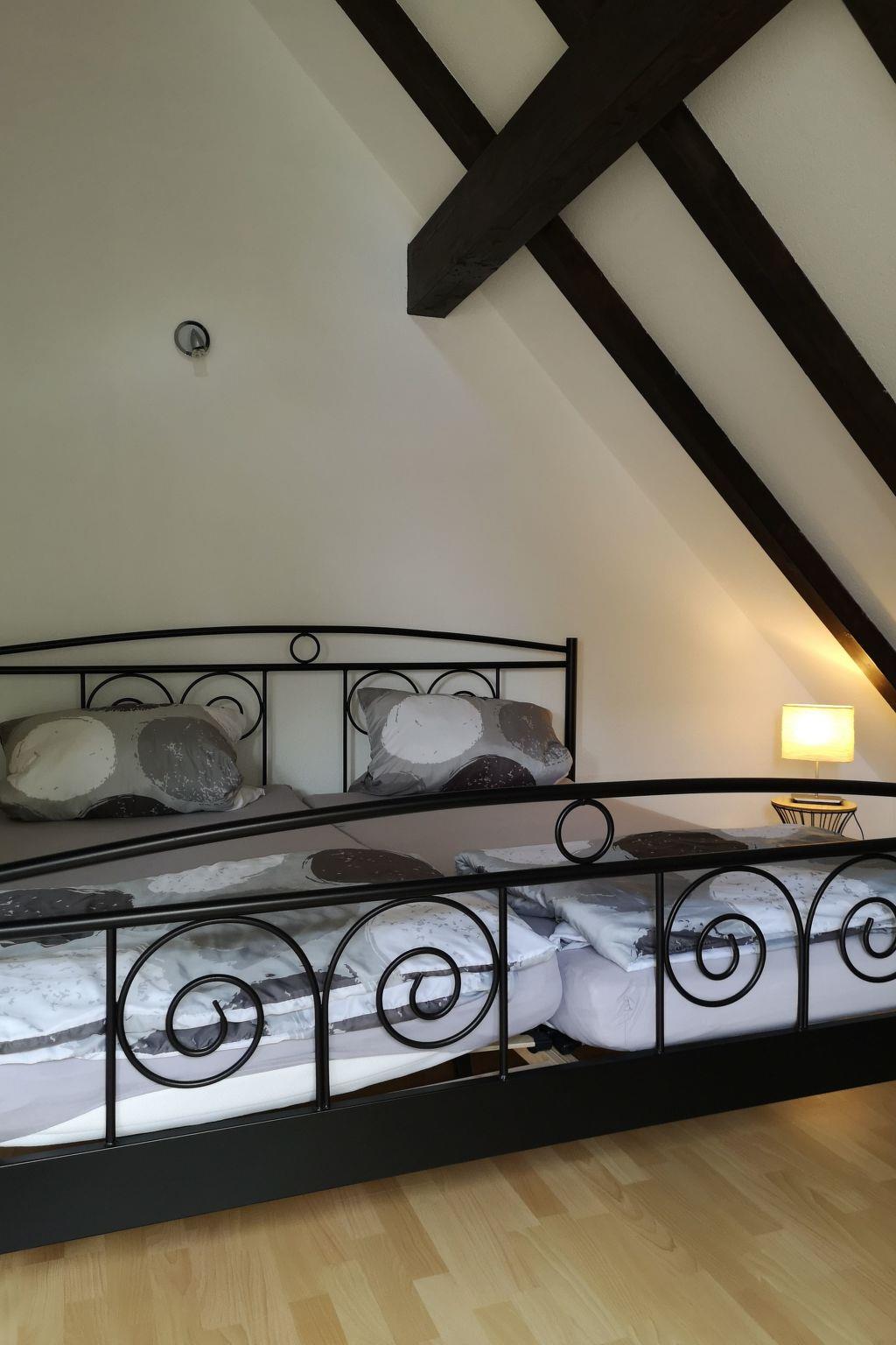 Ground floor: New, fully equipped kitchen, large dining room with wood-burning stove, living room with sofa bed for 2 people, guest WC. Upper floor: 3 bedrooms for 2 persons each, bathroom with bathtub, shower and WC. Top floor: 1 bedroom for 2 persons Terrace and lawn with garden furniture and barbecue facilities, beds made on arrival,