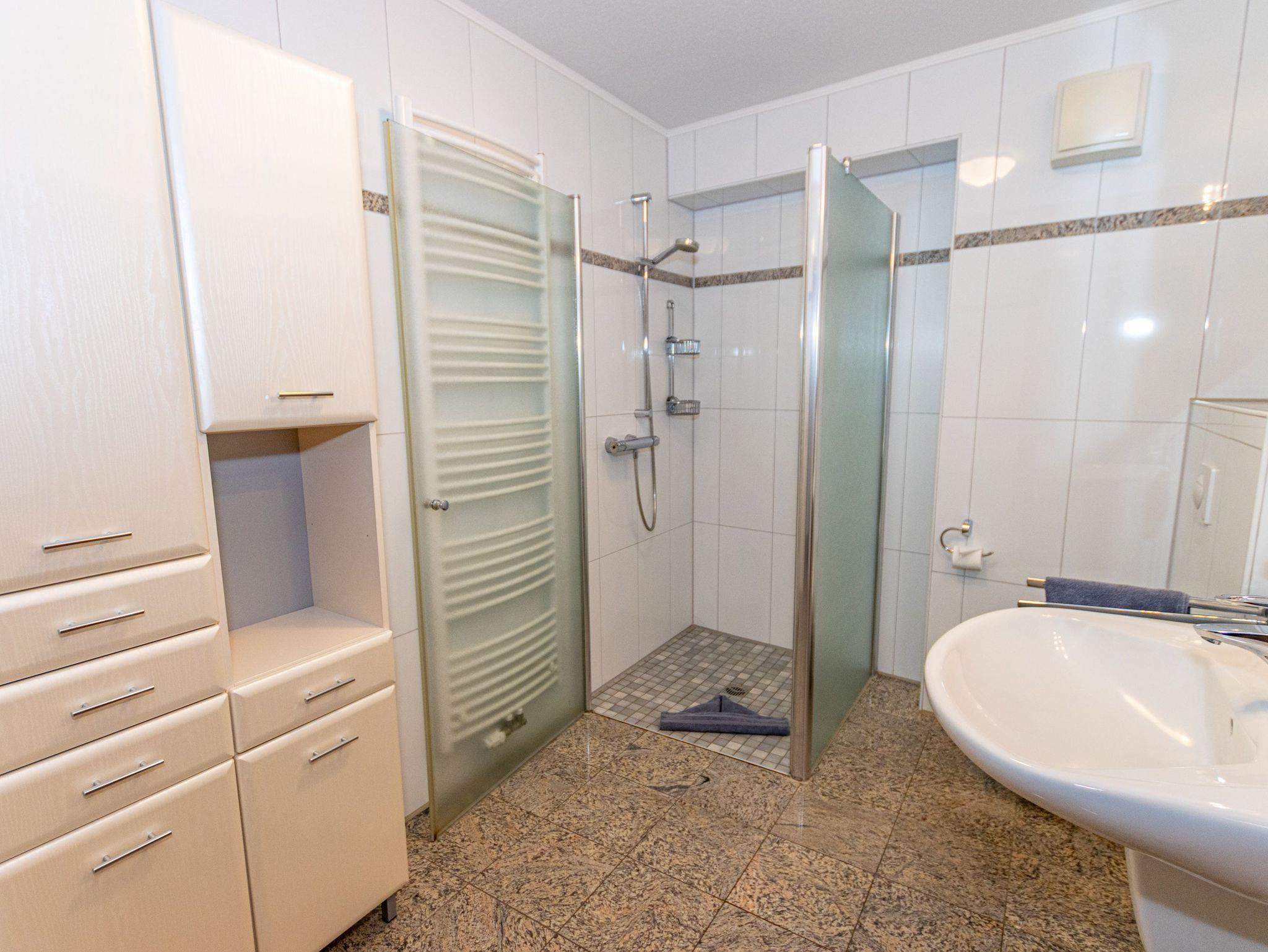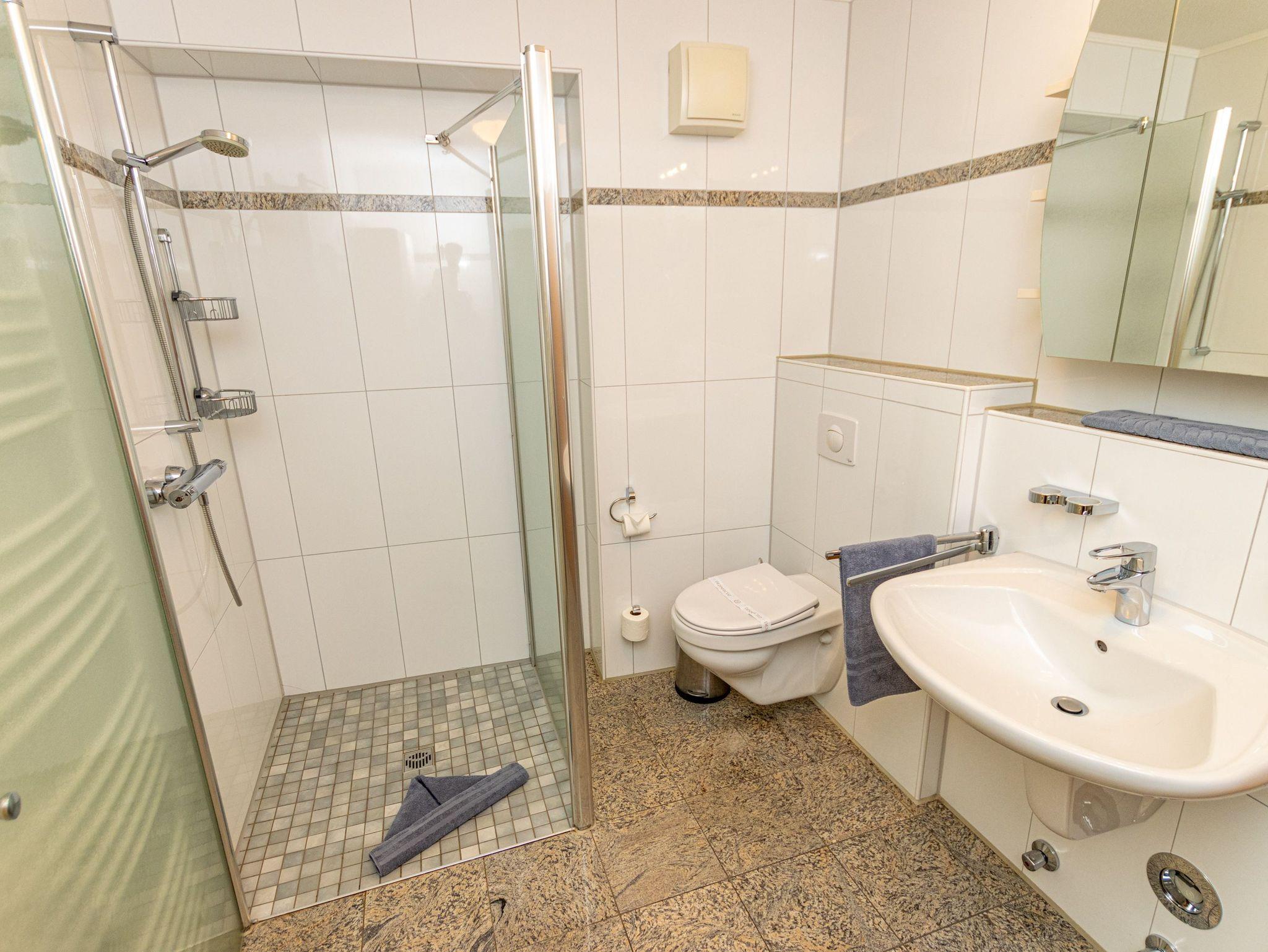 - Badezimmer mit Dusche, Waschtisch und WC