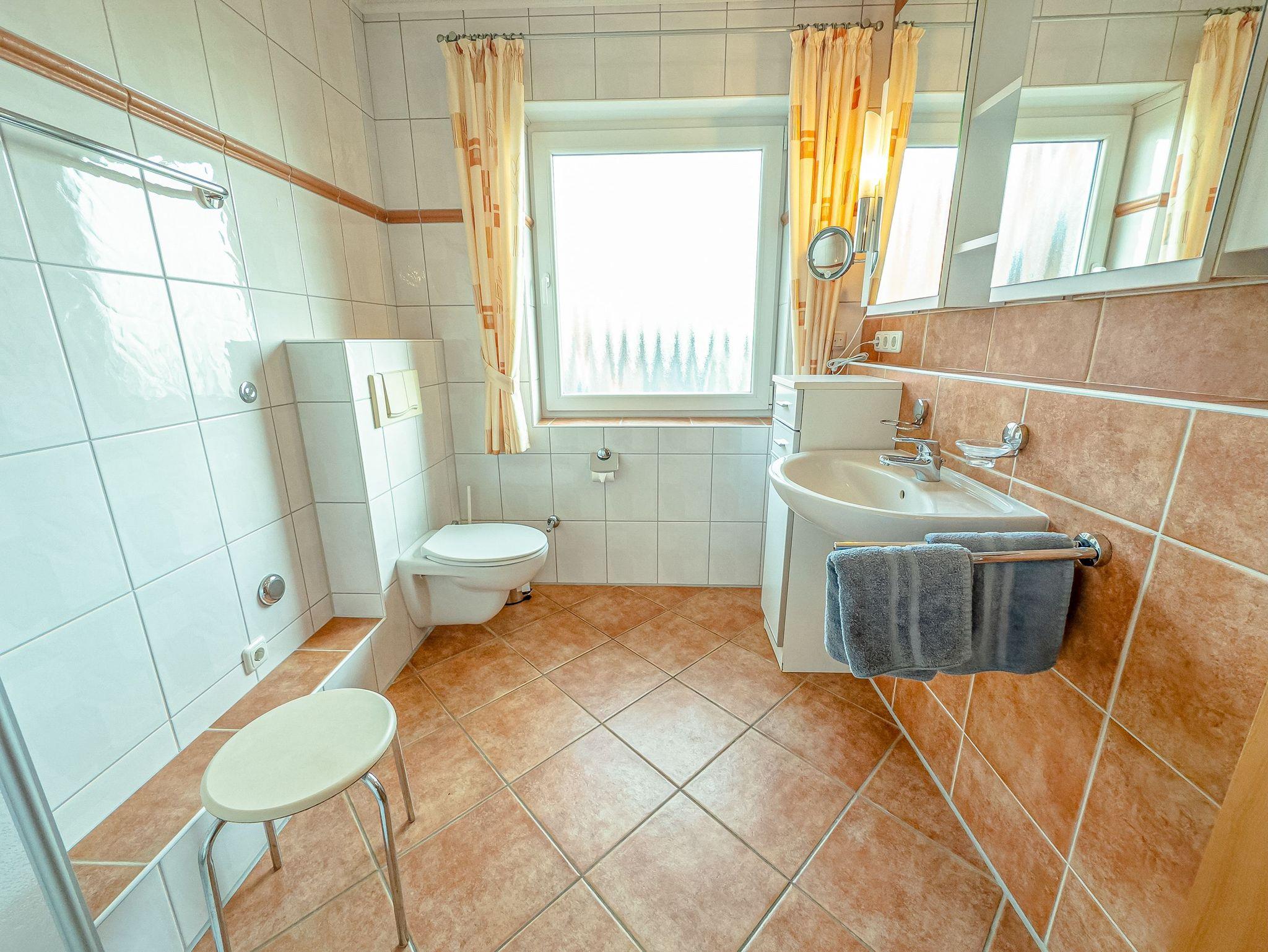 - Badezimmer mit Dusche, Waschtisch und WC