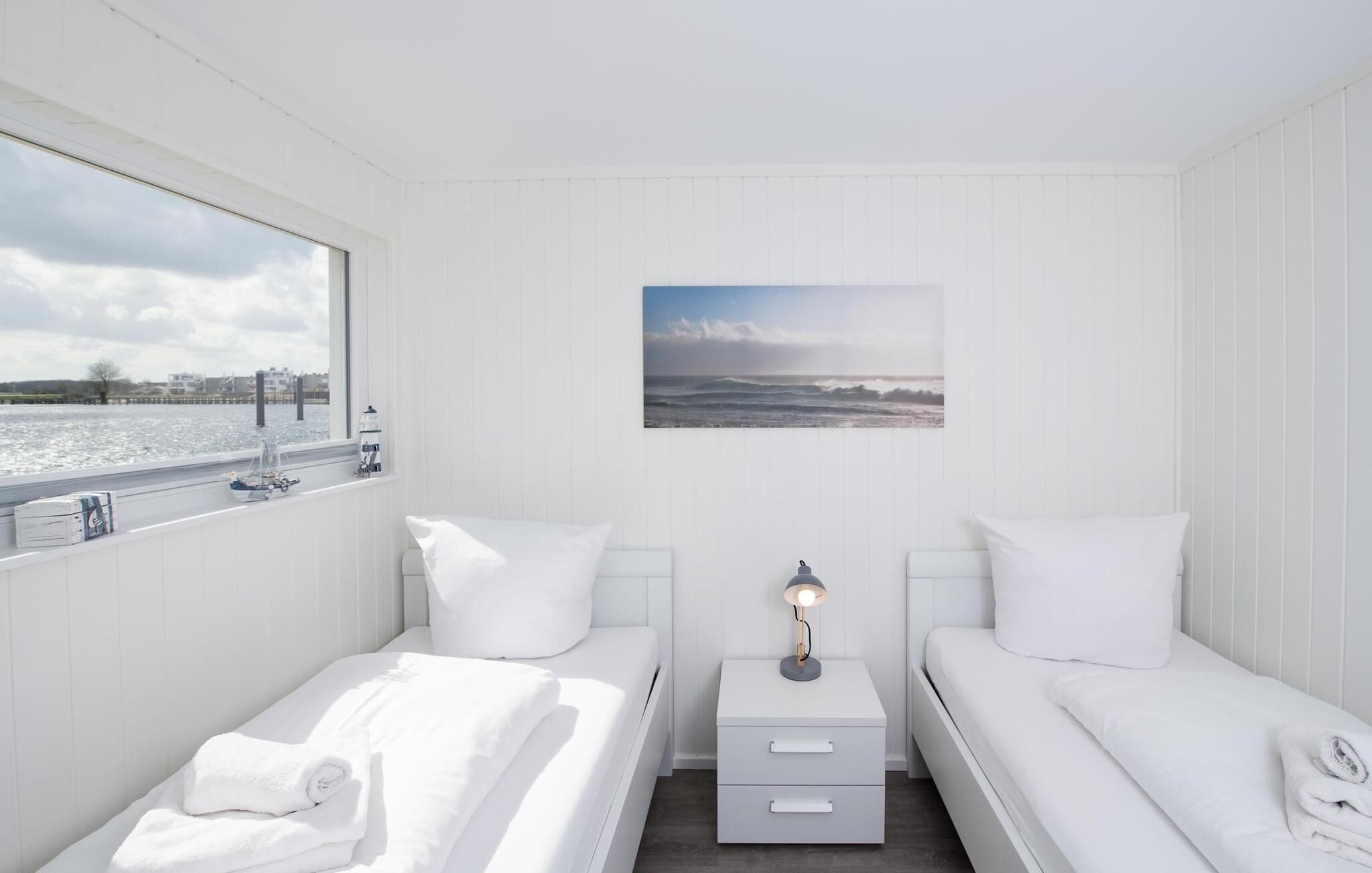Det flydende hus Bente er hjemme i det fjerne nord og er solidt knyttet til anløbsbroen i ferieområdet Olpenitz ved østersøfjorden Slien og Østersøen. Denne helt specielle ferieoplevelse kombinerer eventyret fra en sejltur omgivet af vand med alle bekvemmelighederne ved et luksuriøst feriehus på land. Vand så langt øjet rækker. Det betagende landskab kan nydes gennem gulv-til-loft panoramavinduer, og tagterrassen byder på en spektakulær 360-graders udsigt over Slien, Østersøen og marinaen. Østersøen er kun en badestige væk, og sandstranden i Baltic Sea Resort kan nås til fods. I den mørke årstid giver gulvvarme og sauna hyggelig komfort, da wellness-programmet ombord er et must. Udover havnebiografen sørger Smart TV med hjemmeunderholdningsprogram for underholdning. Det flydende hus strækker sig over tre plan. På øverste etage er der opholds- og spisestue i åbent plan med udsigt til vandet hele vejen rundt, fuldt udstyret køkken-alrum og tilstødende terrasse. Herfra har I adgang til den spektakulære tagterrasse med udsigt over sejler- og sportsbådshavnen, Slien og dens udmunding i Østersøen. Udstyret med havemøbler af høj kvalitet og en Weber el-grill tilbyder terrasserne en ren feriefølelse og betagende solnedgange. Husets afslapningsområde er i stueetagen med to soveværelser, badeværelse og sauna. Det store soveværelse imponerer med et panoramavindue fra gulv til loft, hvorigennem I kan nyde den betagende vandbaggrund og en tilstødende omgivende terrasse. Begge soveværelser har fladskærms-tv med hjemmeunderholdningsprogrammer. Der er en ekstra soveplads på den komfortable sovesofa i husets opholdsstue. Når I tager en sauna eller børster tænder, kan I selvfølgelig også se havet og svanerne svømme forbi. Hvis I ønsker at rejse med båd, er dette det rigtige sted for jer. Der er en privat bådplads med landstrøm og vand lige ved siden af huset. Der er en privat parkeringsplads direkte ved anløbsbroen. Vores yndlingssted: at vågne op til en spektakulær vandkulisse. Bemærk venligst: OstseeResort Olpenitz er meget populært, og der bygges fortsat i parken. Ikke desto mindre kan I se frem til en 5-stjernet standard og et førsteklasses ophold. Byggeaktiviteterne kommer ikke til at forstyrre jer på ferien, og derfor gives der ikke yderligere afslag i prisen.