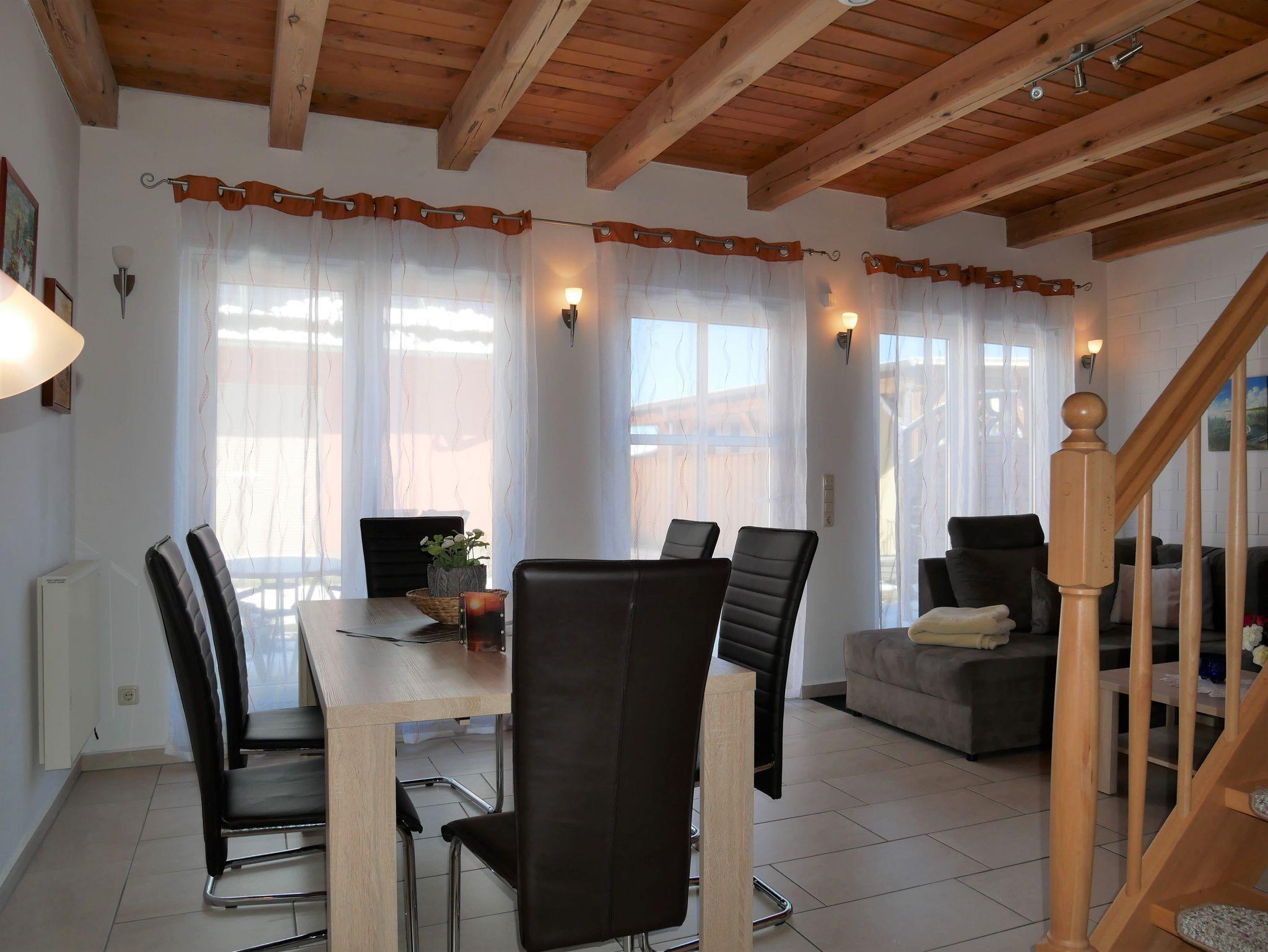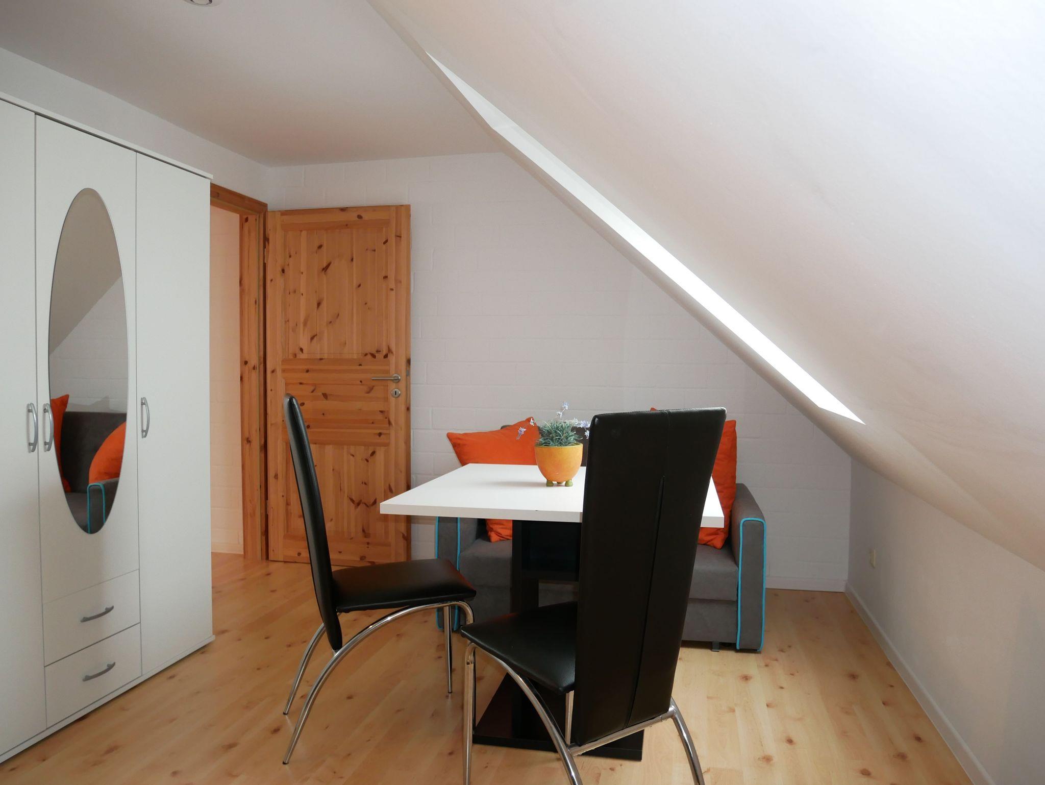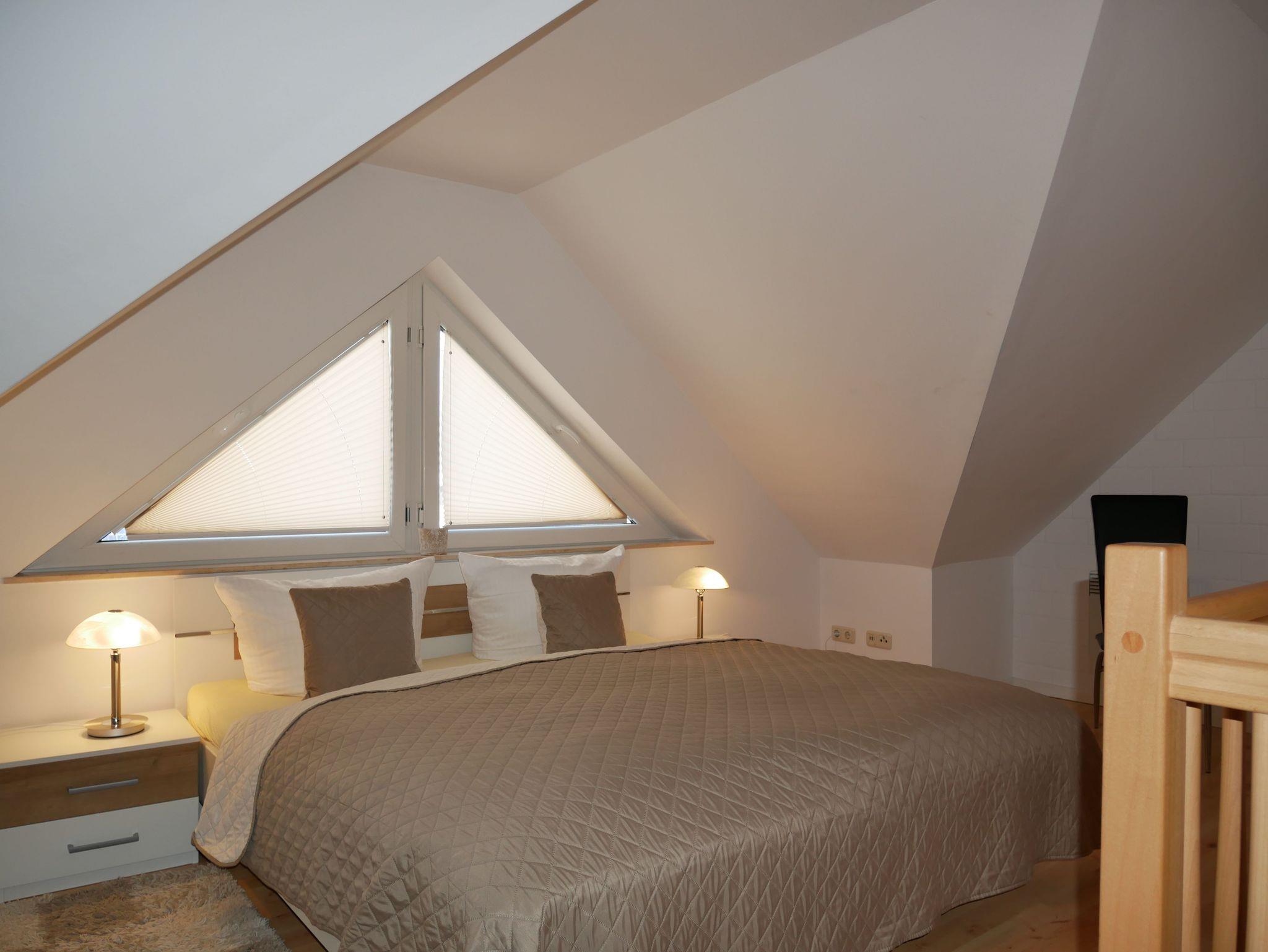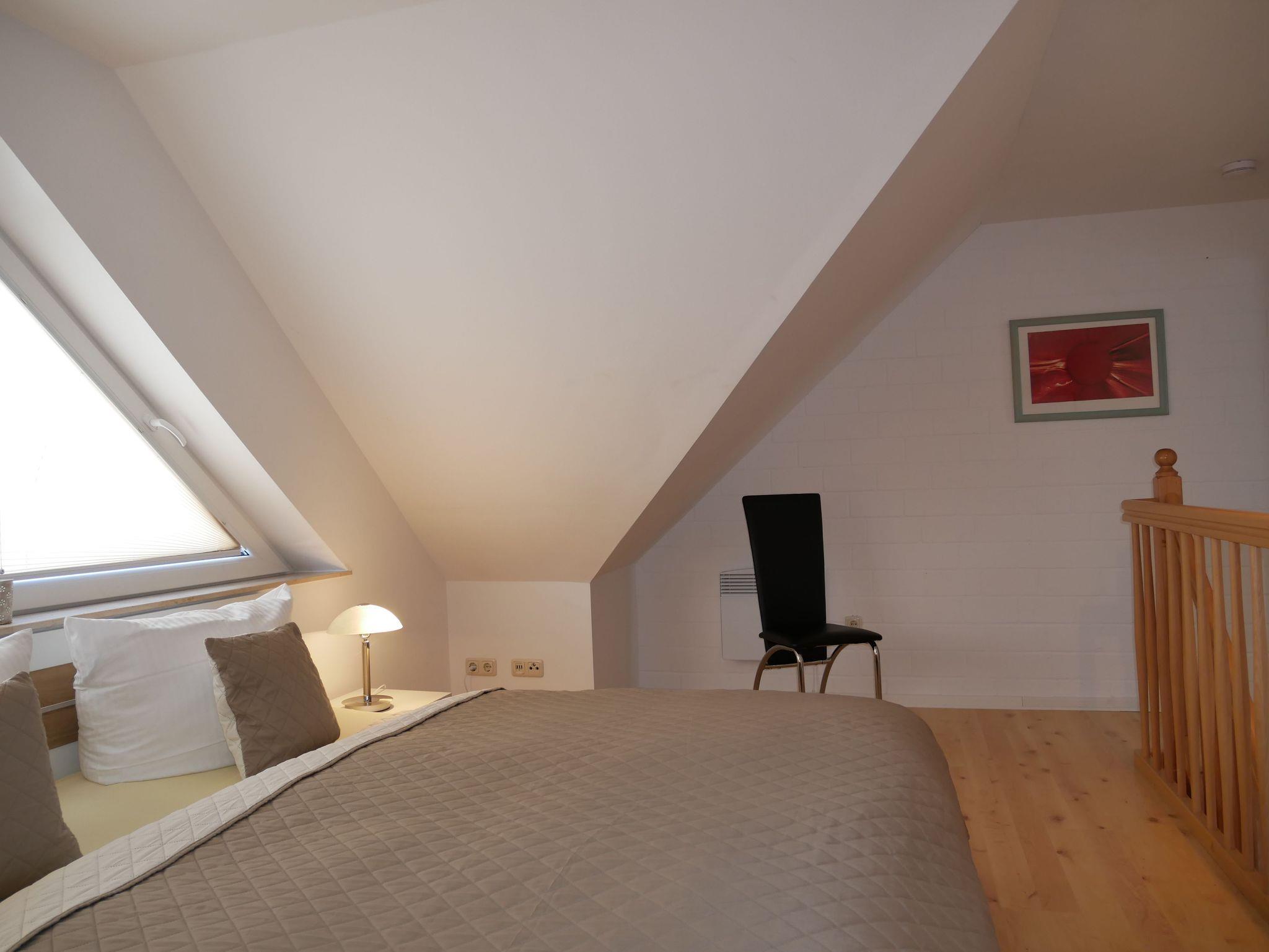 In das Obergeschoss gelangt man über eine offene Buchentreppe. Diese Etage ist offen gestaltet mit einem Doppelbett und Kleiderschrank sowie einem weiteren separaten Schlafzimmer mit einem Doppelbett, Kleiderschrank, Tisch mit Stühlen und einer kleinen Schlafcouch (Aufbettungsmöglichkeit für die 5. Person) aufgeteilt.