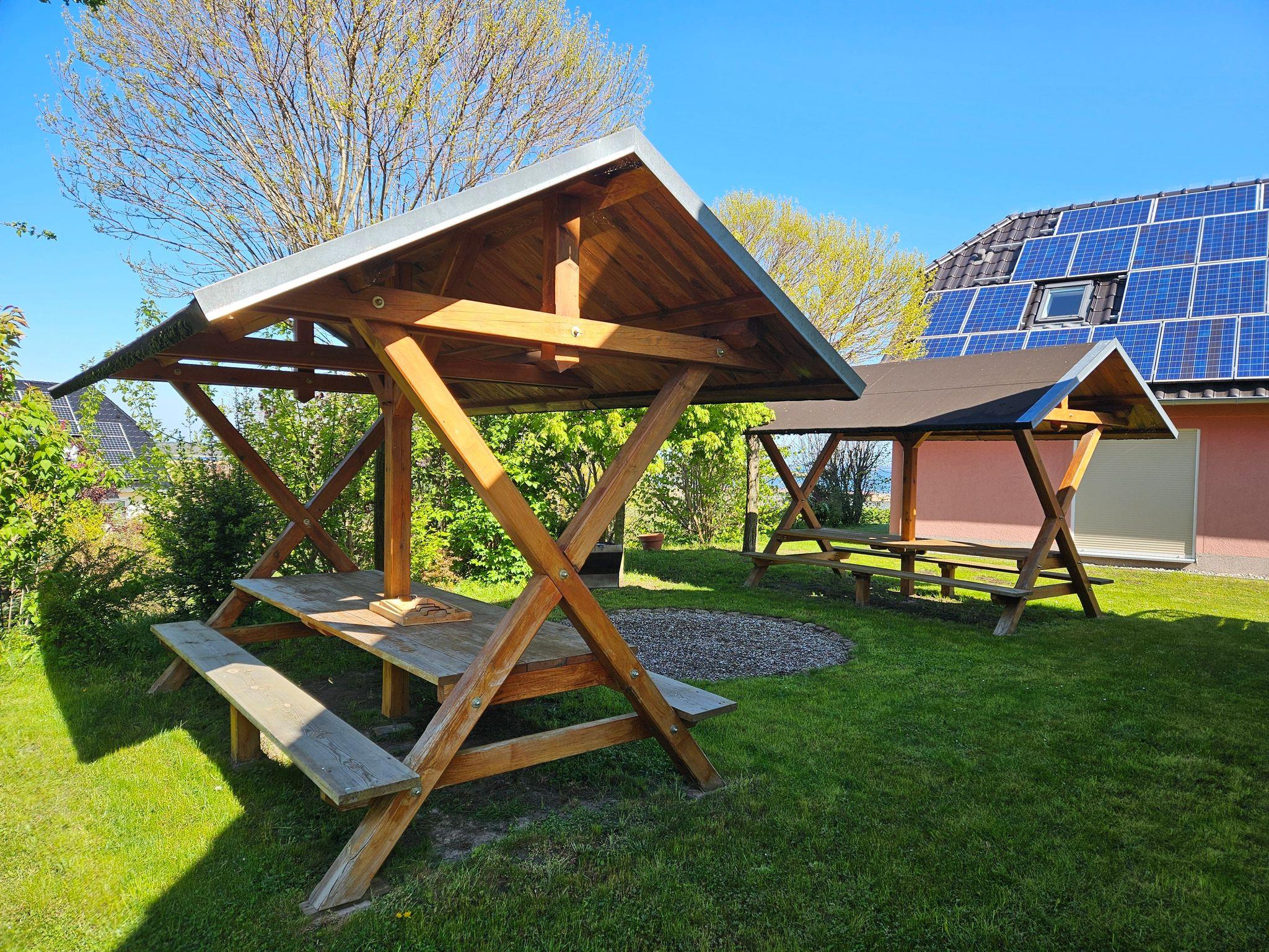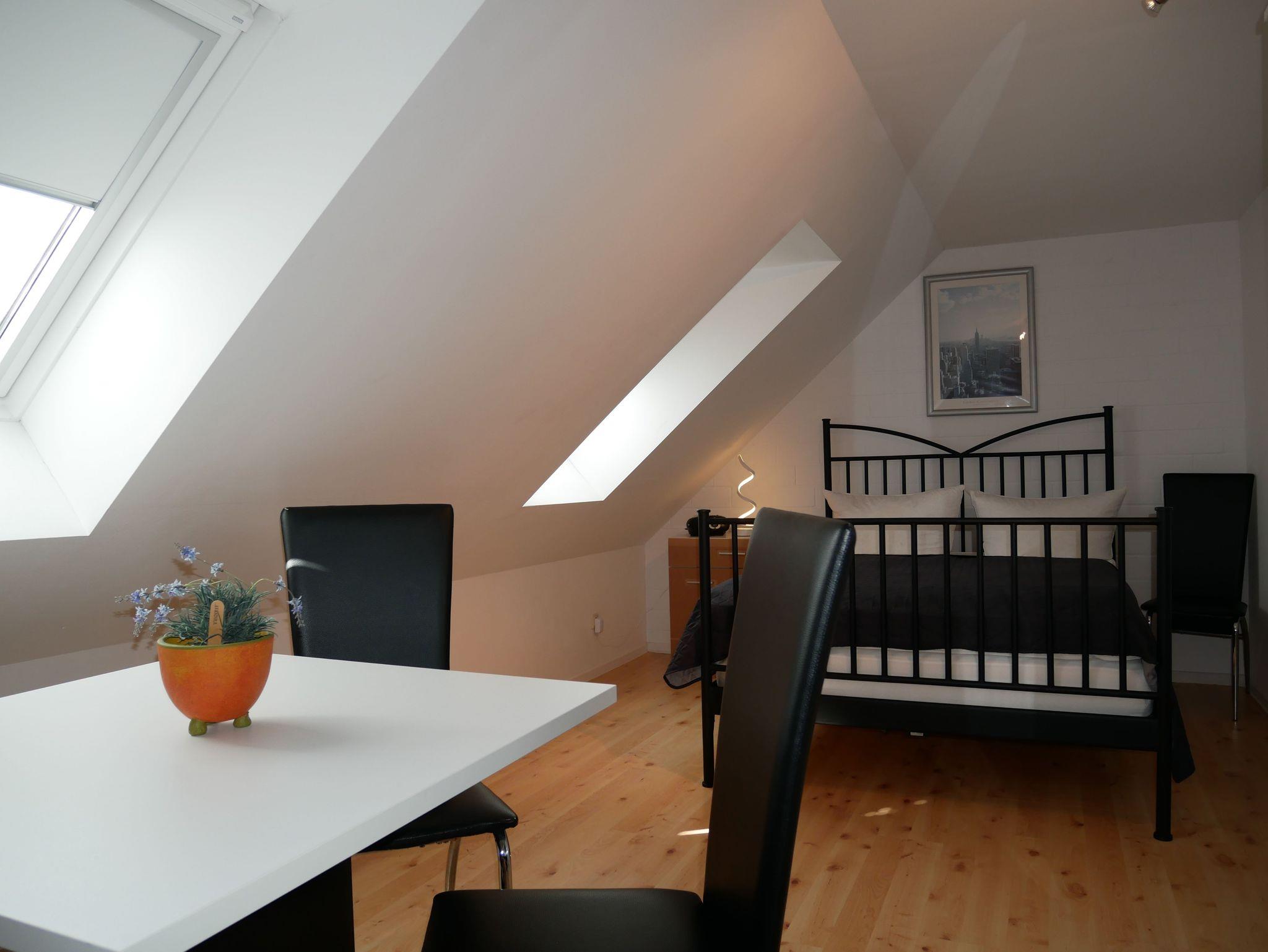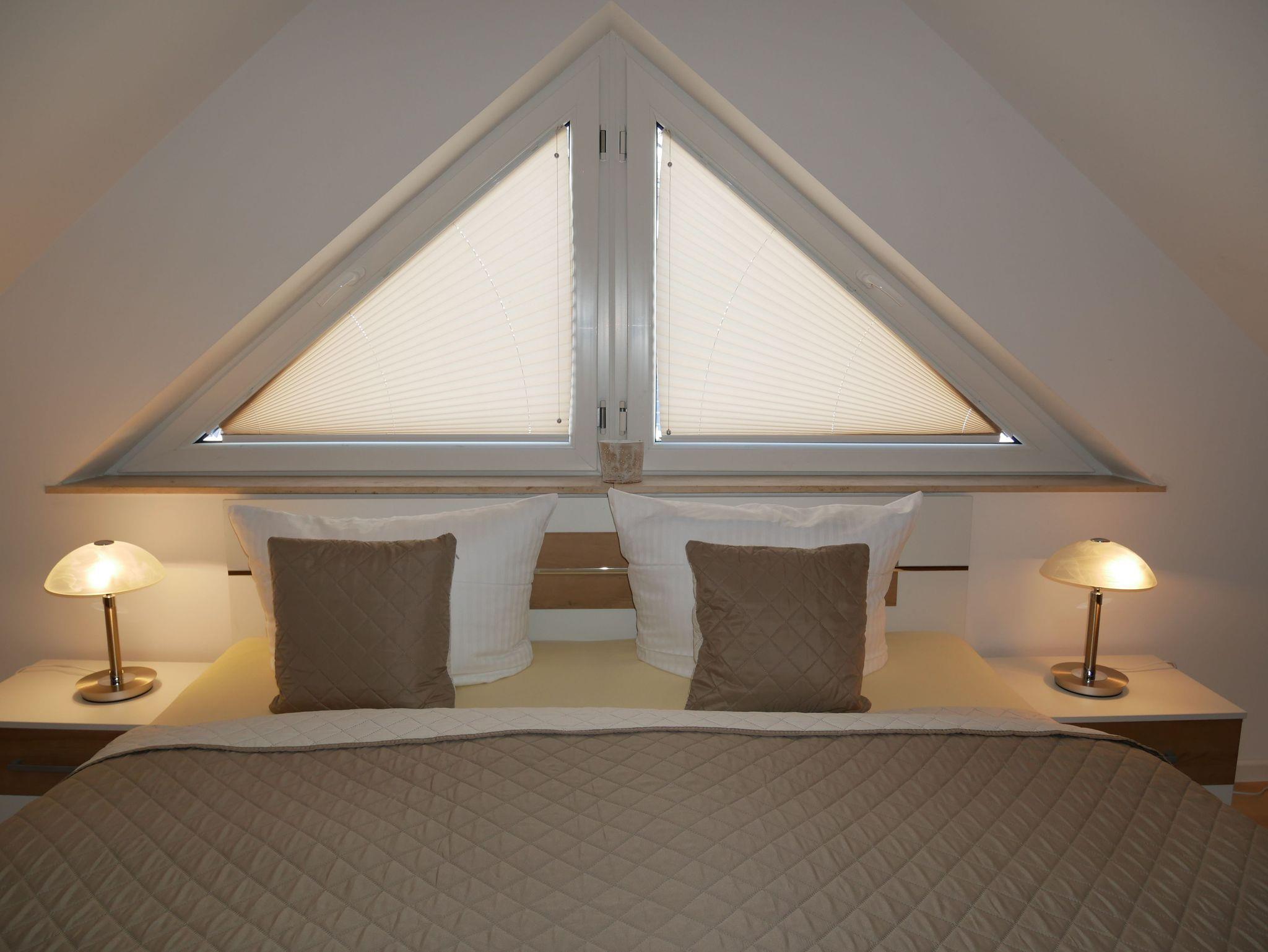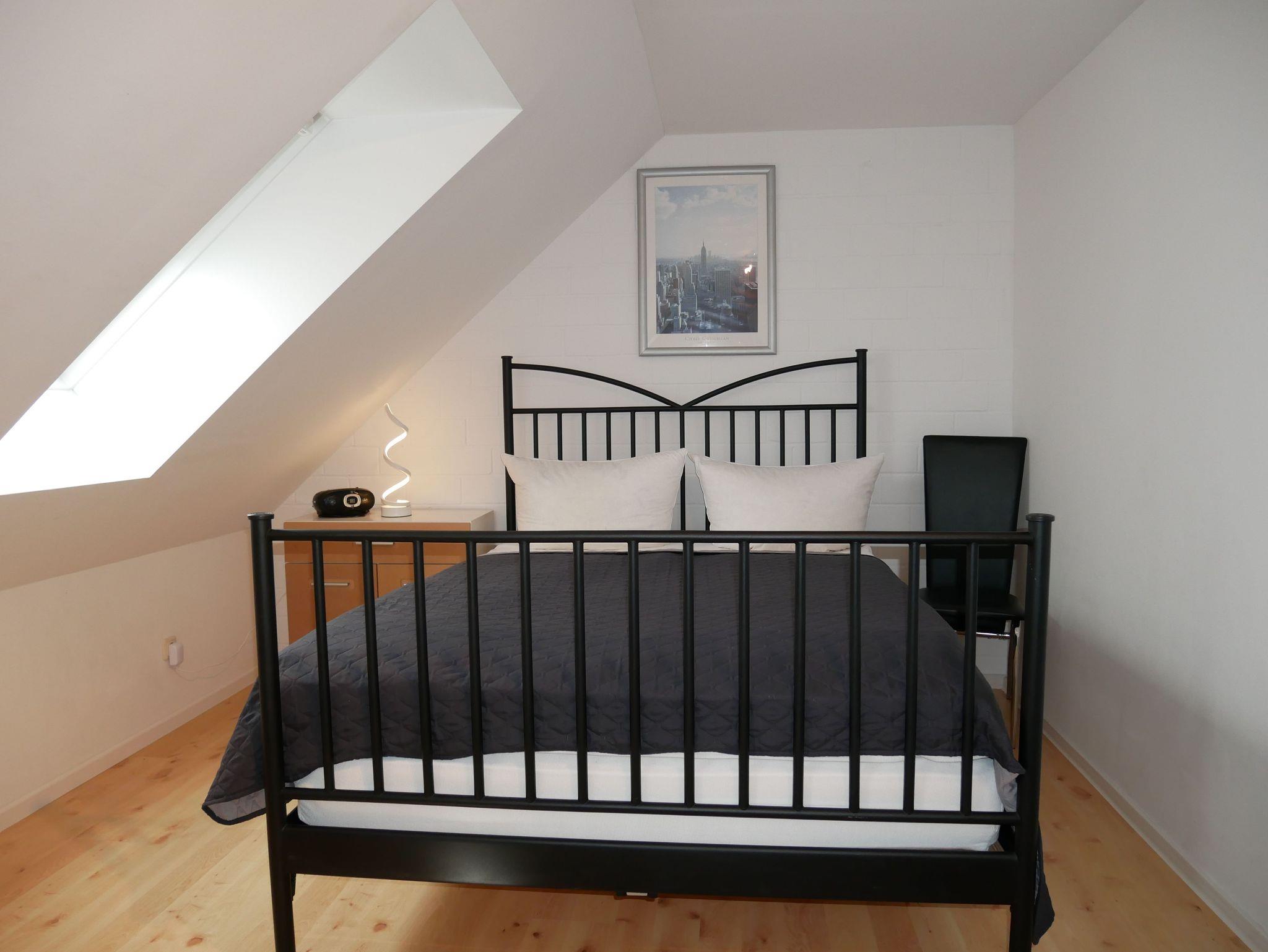 In das Obergeschoss gelangt man über eine offene Buchentreppe. Diese Etage ist offen gestaltet mit einem Doppelbett und Kleiderschrank sowie einem weiteren separaten Schlafzimmer mit einem Doppelbett, Kleiderschrank, Tisch mit Stühlen und einer kleinen Schlafcouch (Aufbettungsmöglichkeit für die 5. Person) aufgeteilt.