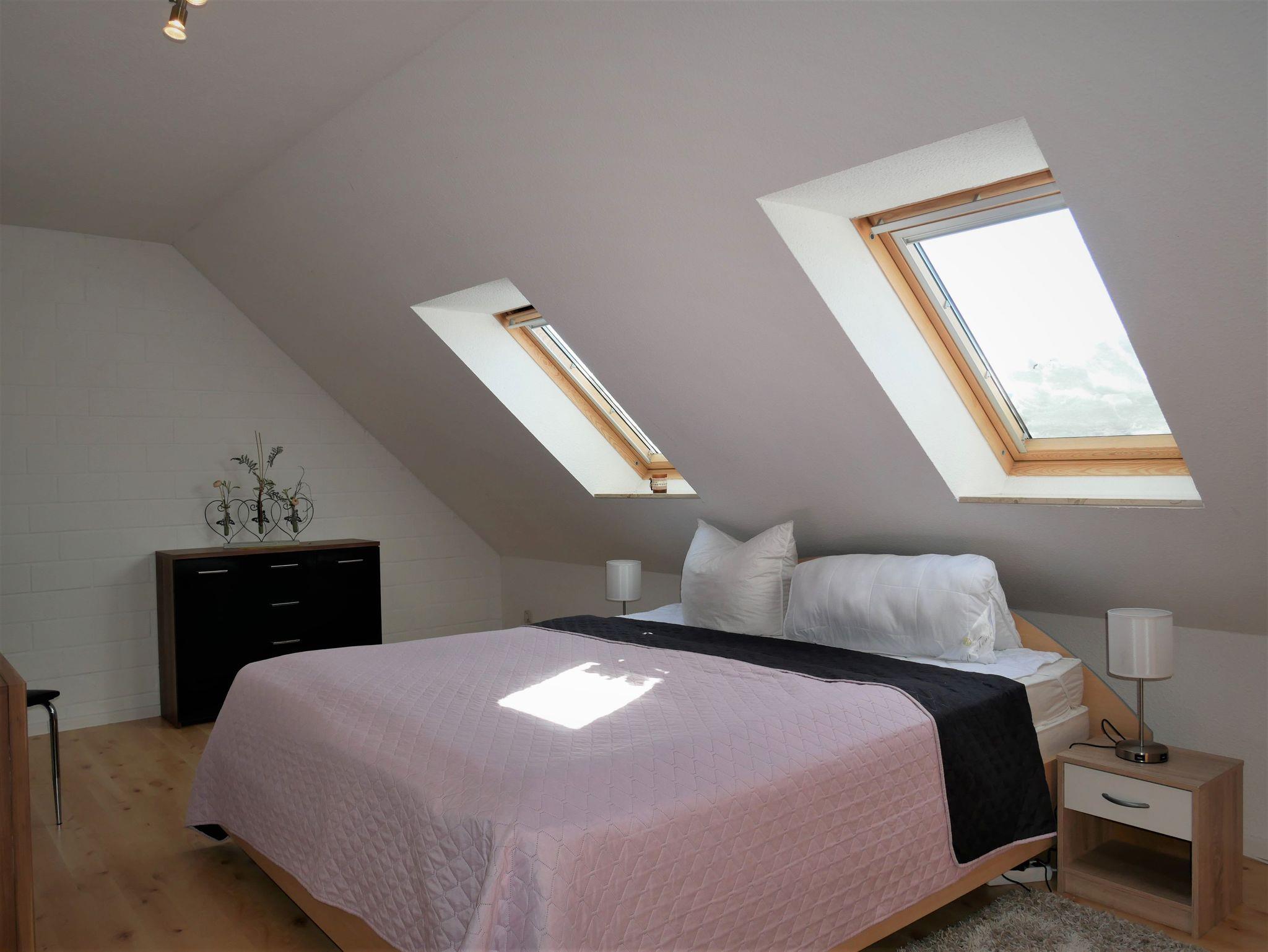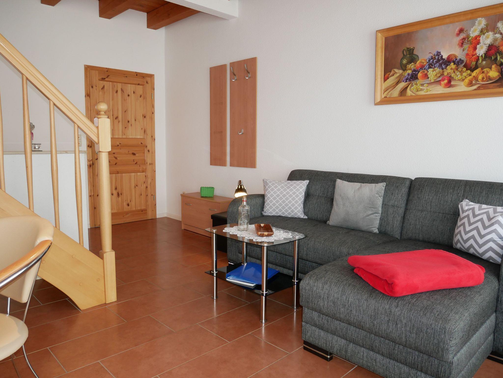 In das Obergeschoss gelangt man über eine offene Buchentreppe. Diese Etage ist offen gestaltet in einen Schlafbereich mit einem Doppelbett und einem großzügigen Wohnbereich mit Flat-TV und Schlafcouch (Aufbettungsmöglichkeit für die 5. Person) aufgeteilt.