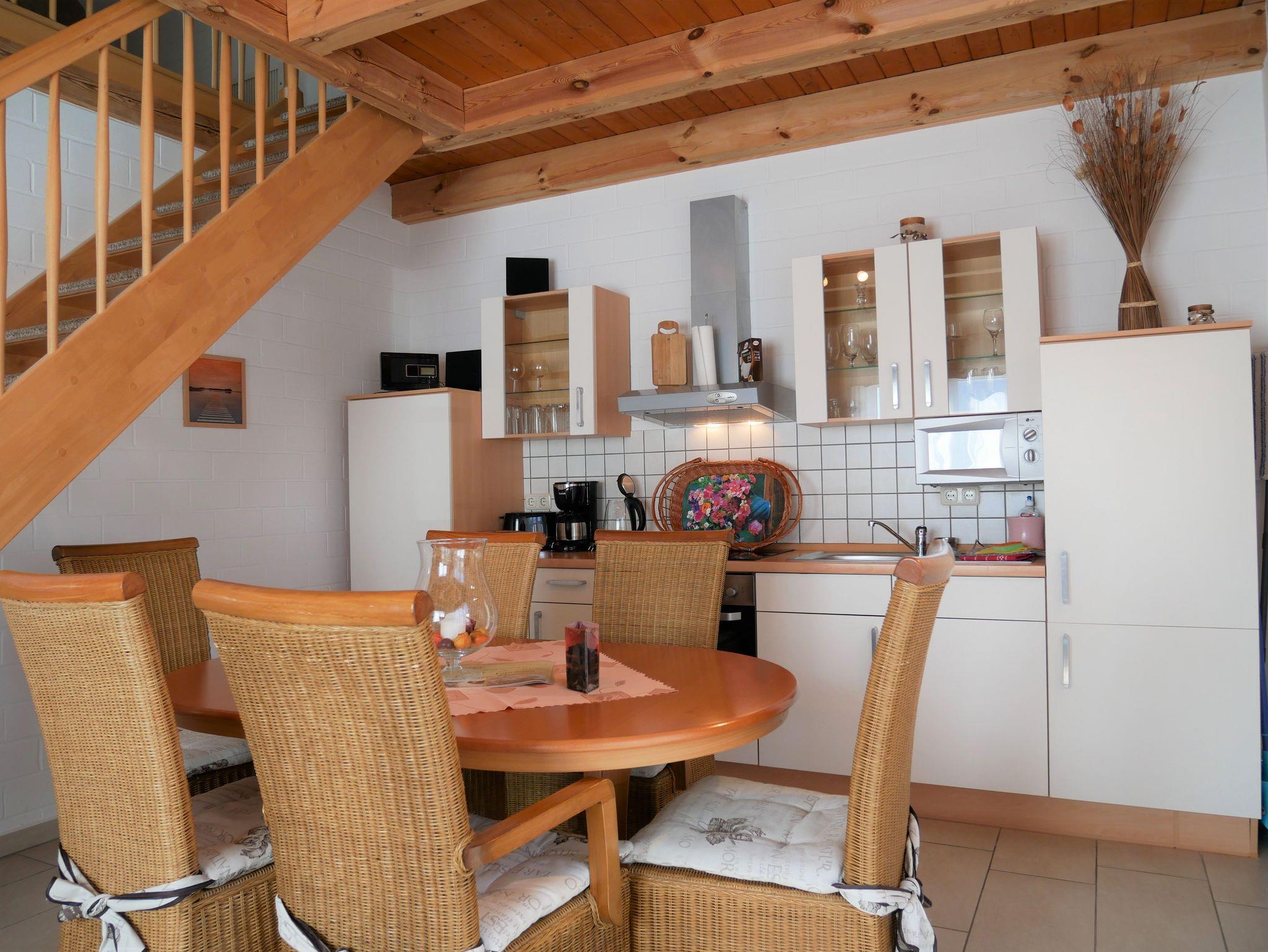 Das helle, moderne Ferienreihenhaus ist ca. 70qm groß, verteilt sich auf zwei Ebenen und verfügt über eine möblierte Terrasse. Im Erdgeschoss befindet sich der Ess-Kochbereich mit Esstisch und eine offene Küchenzeile. Diese ist mit Backofen, Cerankochfeld, Kühlschrank mit Tiefkühlfach, Mikrowelle, Spüle, Kaffeemaschine, Wasserkocher und Toaster ausgestattet. Das Elternschlafzimmer mit Doppelbett und einem großzügigem Kleiderschrank eingerichtet. Das Badezimmer verfügt über eine ebenerdige Dusche, WC und Waschtich und eine Handtuchablage.