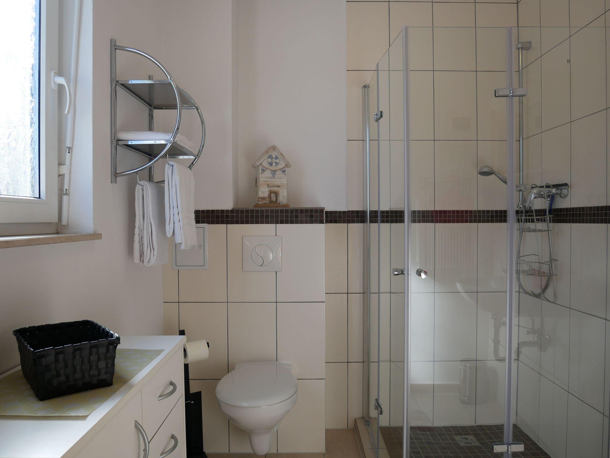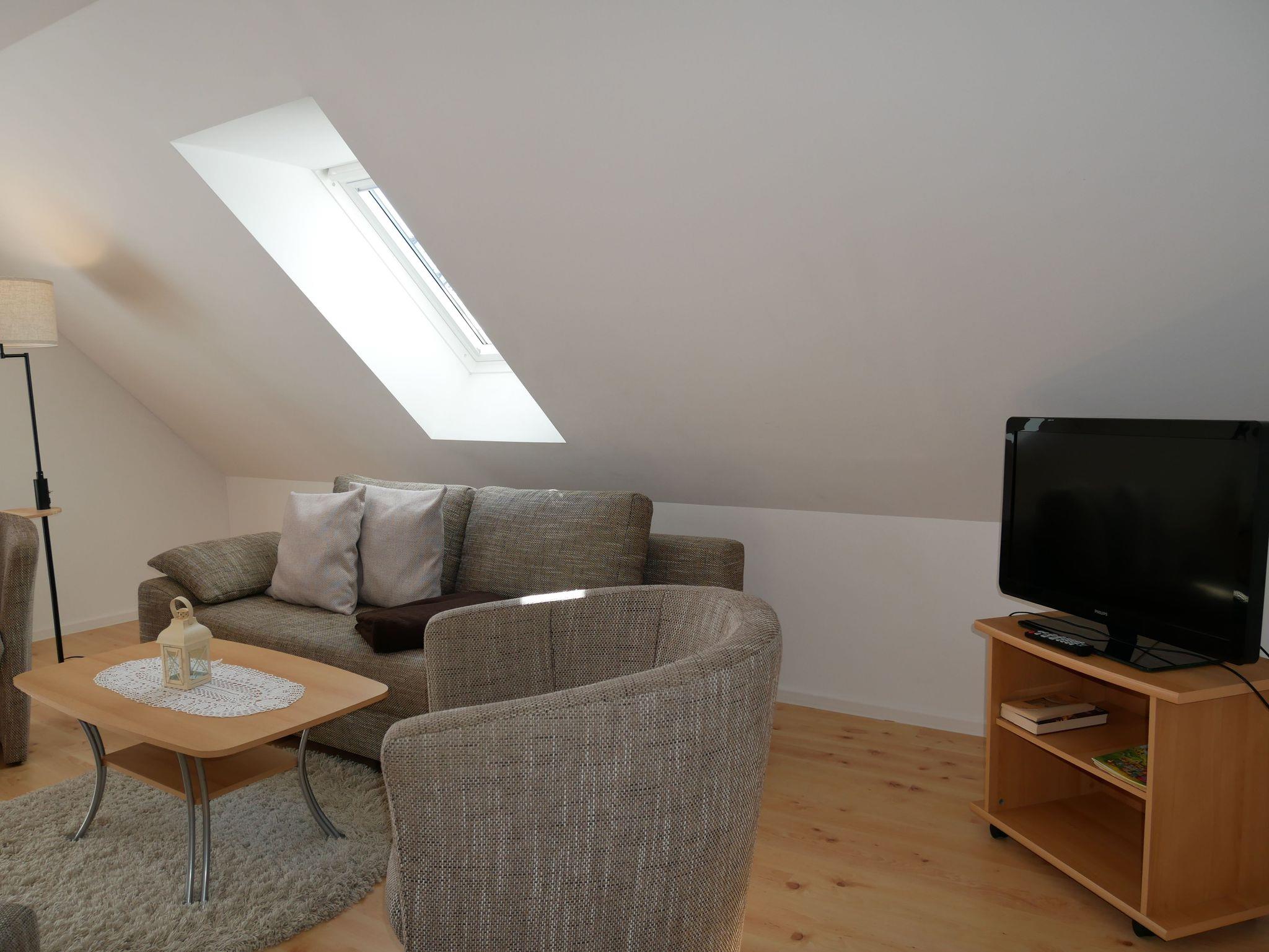 In das Obergeschoss gelangt man über eine offene Buchentreppe. Diese Etage ist offen gestaltet und in einen optisch abgetrennten Schlafbereich mit 2 Einzelbetten und einem großzügigen Wohnbereich mit Flat-TV und Schlafcouch (Aufbettungsmöglichkeit für die 5. Person) aufgeteilt.