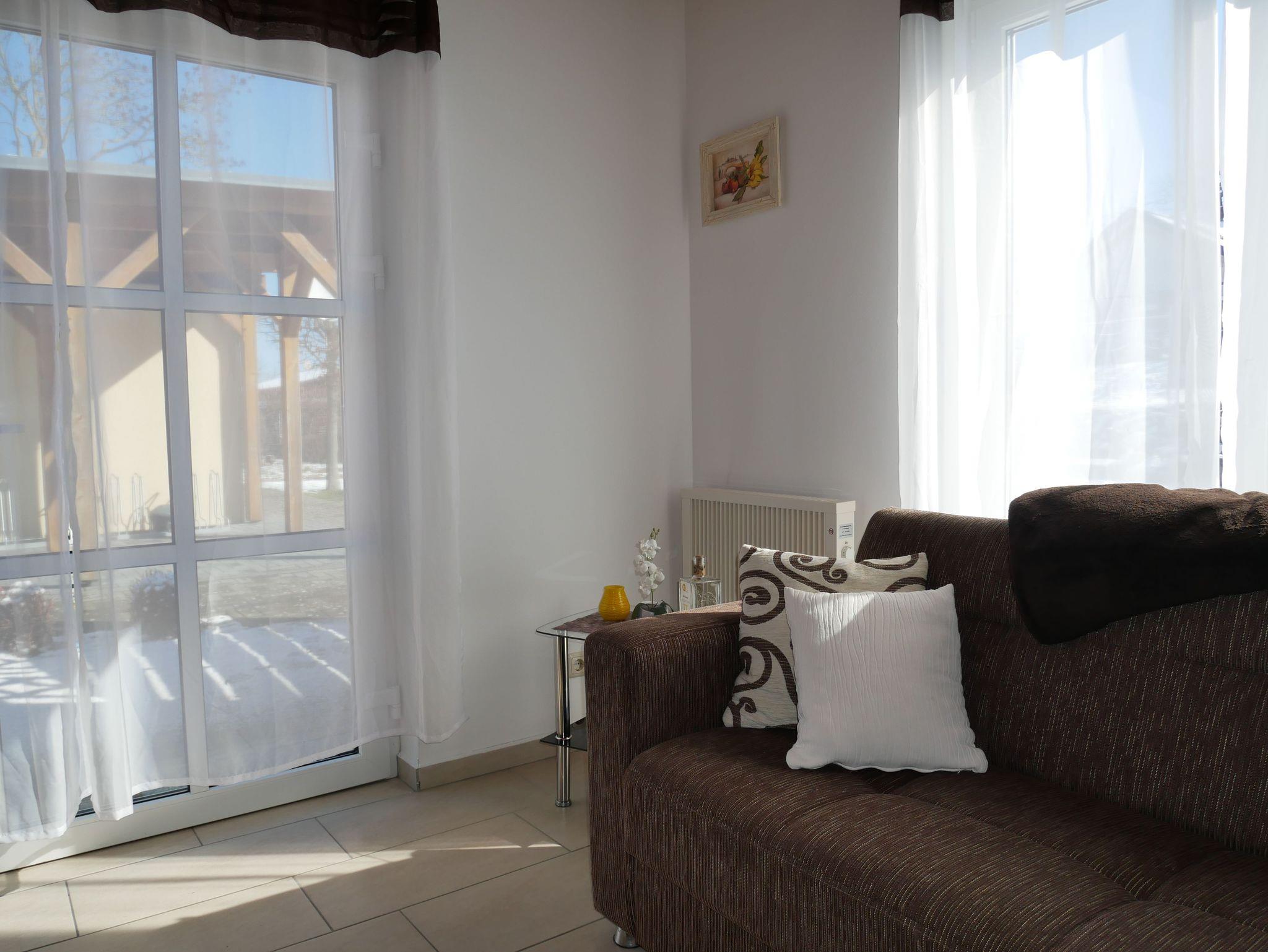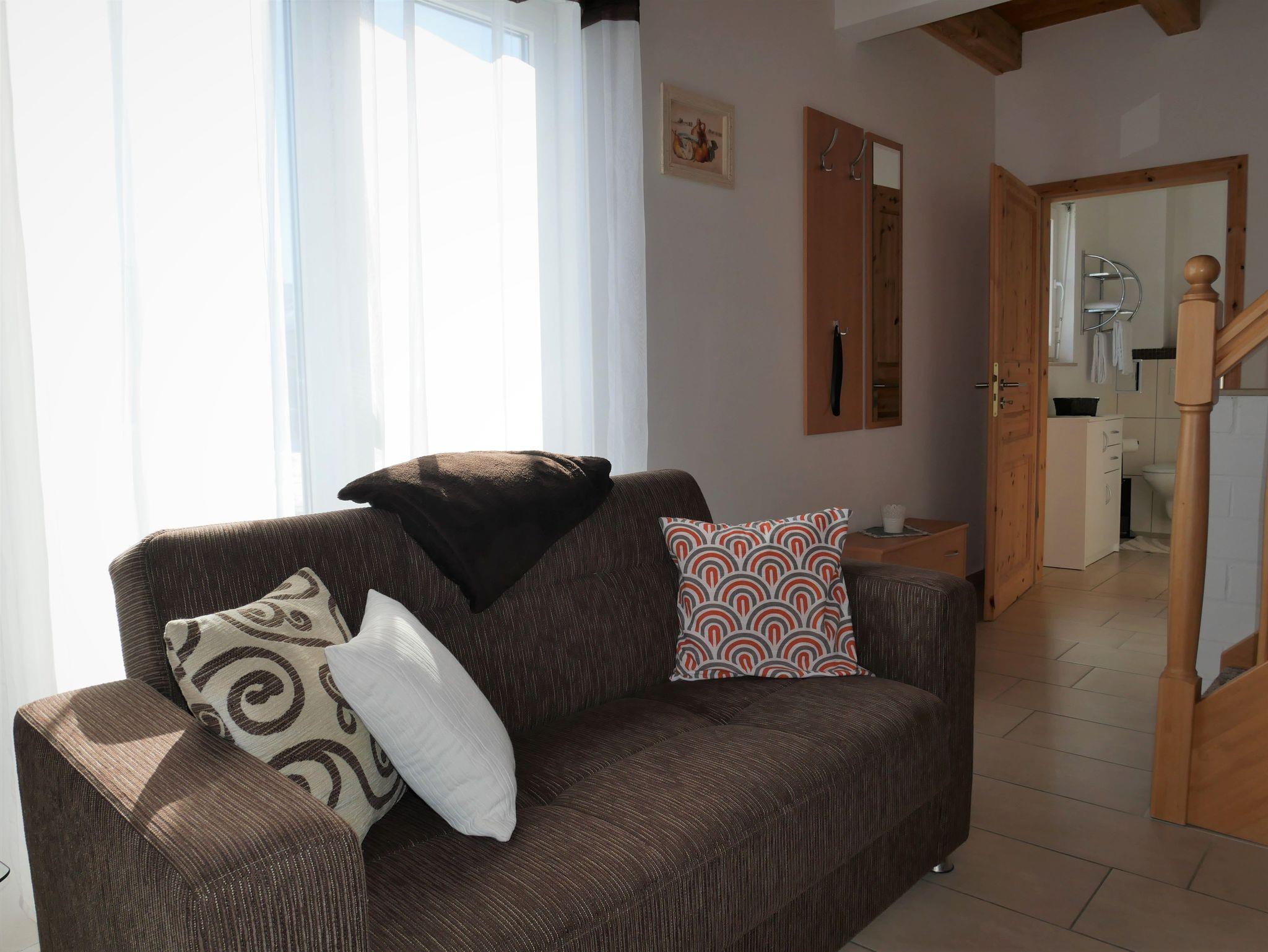 In das Obergeschoss gelangt man über eine offene Buchentreppe. Diese Etage ist offen gestaltet und in einen optisch abgetrennten Schlafbereich mit 2 Einzelbetten und einem großzügigen Wohnbereich mit Flat-TV und Schlafcouch (Aufbettungsmöglichkeit für die 5. Person) aufgeteilt.