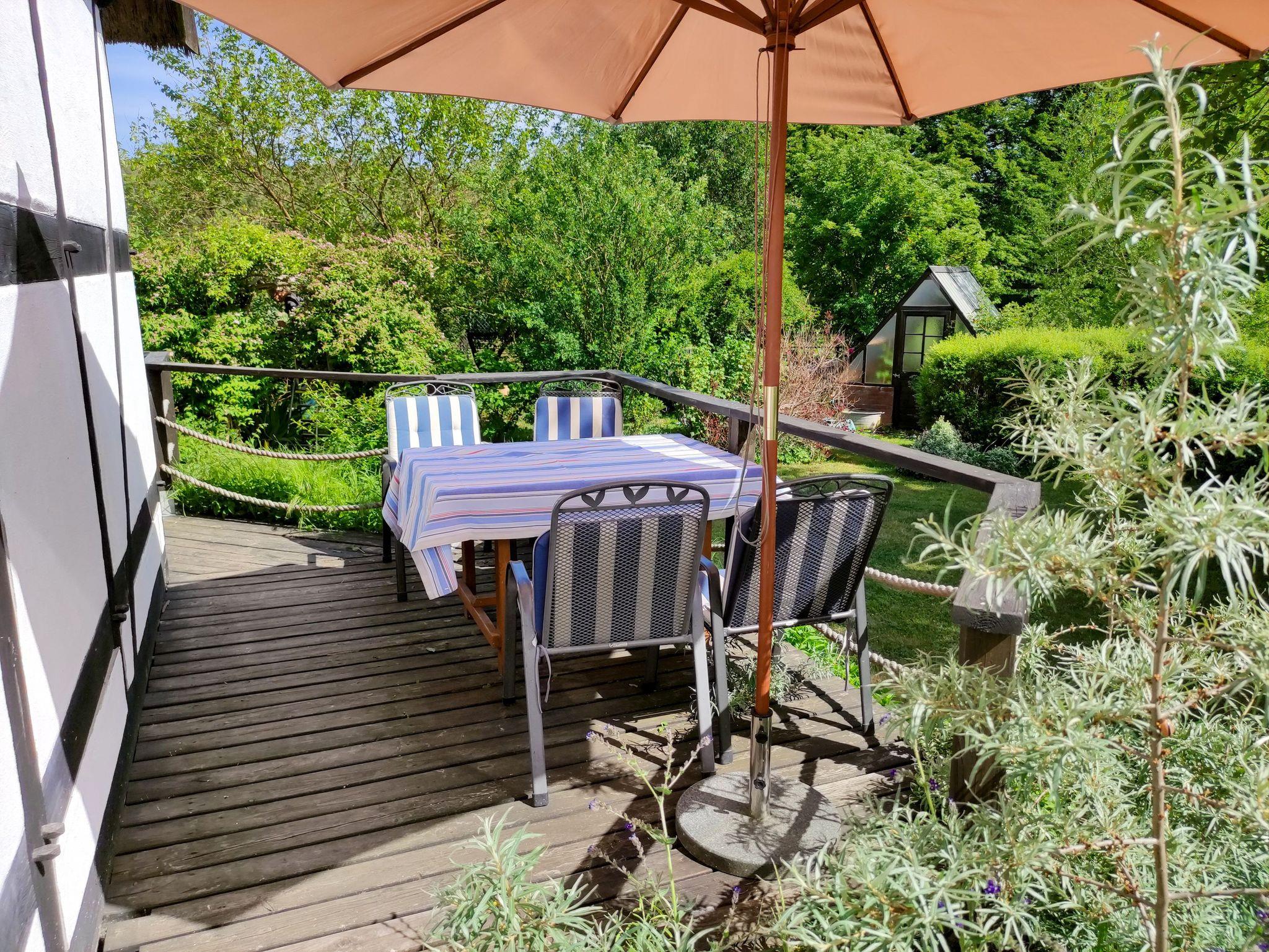Zur Ferienwohnung gehört eine eigene Terrasse mit Sitzgelegenheiten und Sonnenschirm.