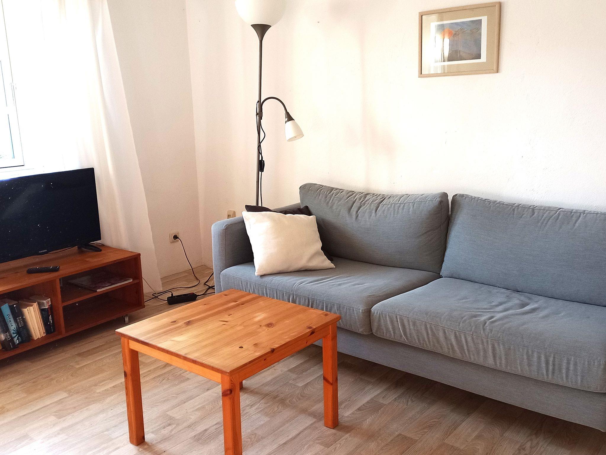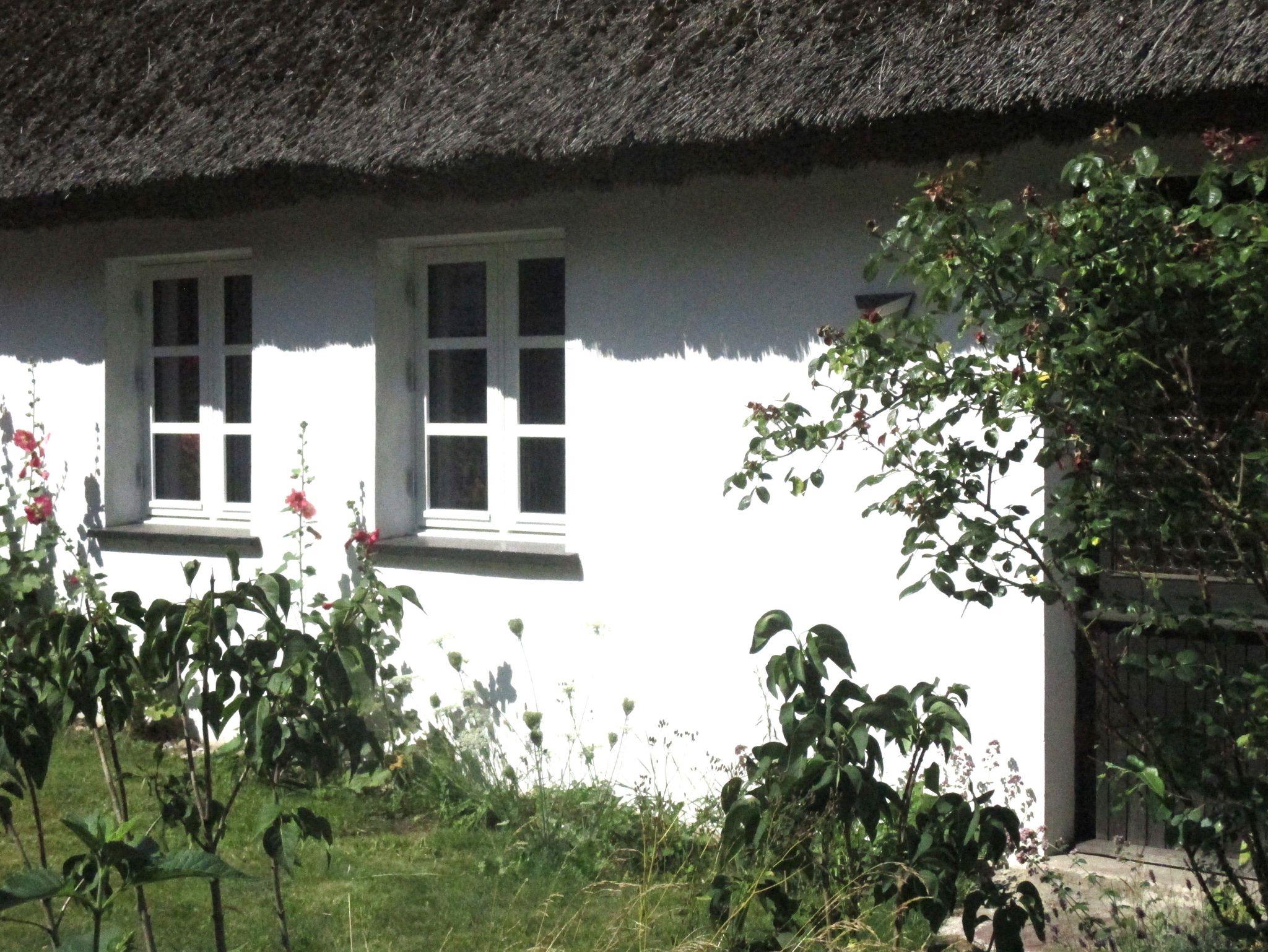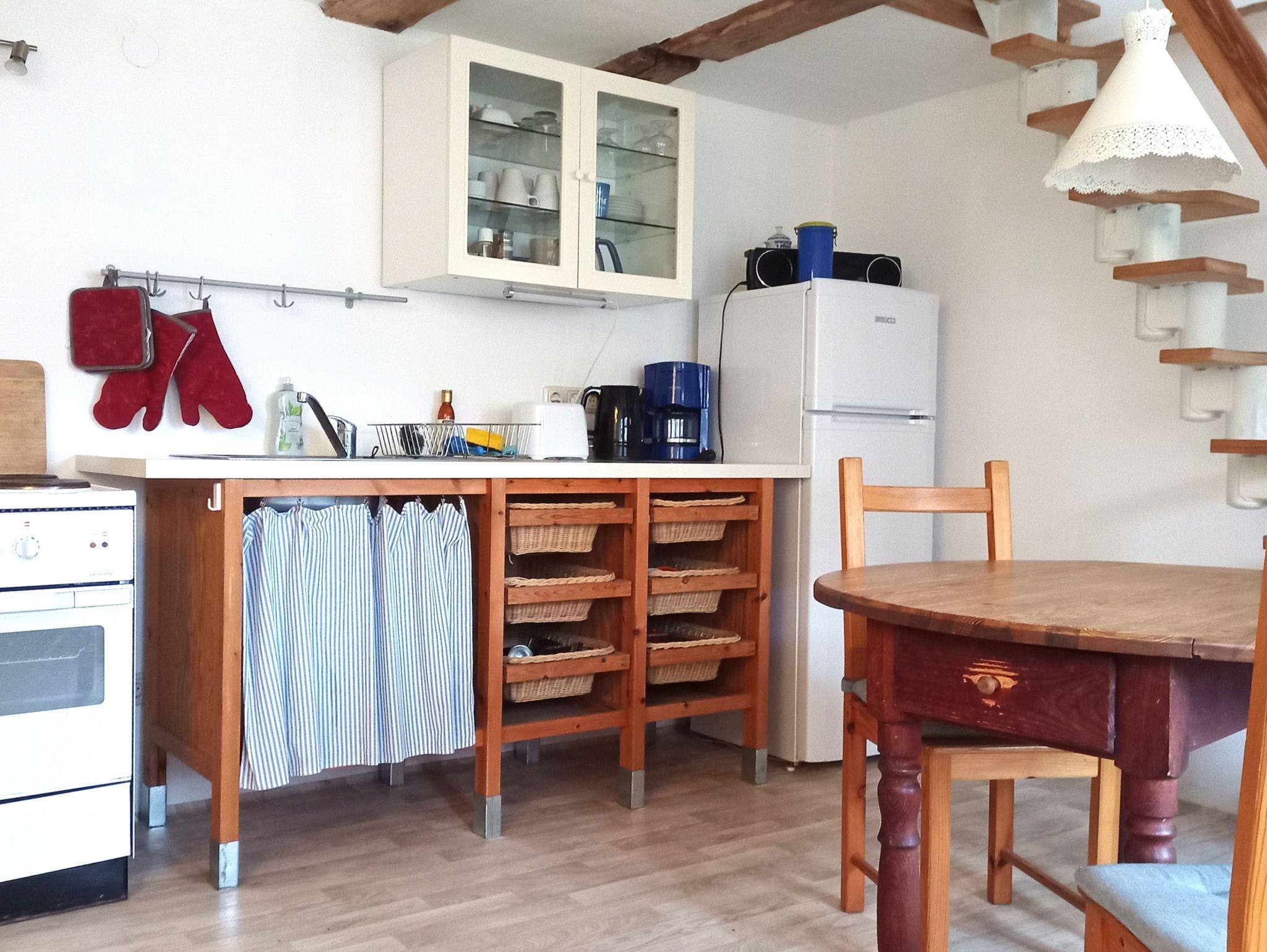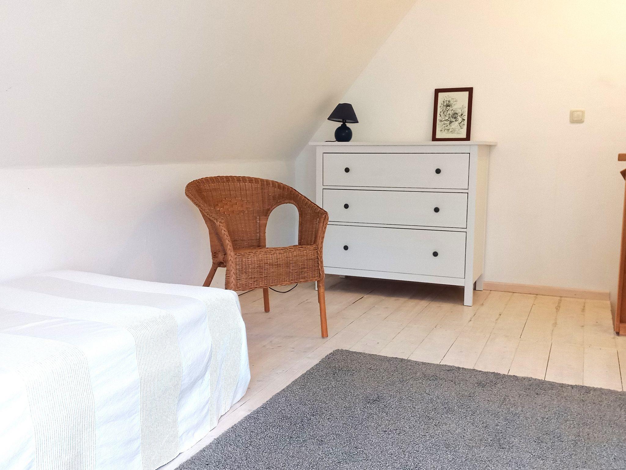 Die 56 qm große Ferienwohnung ist im skandinavischen Landhausstil gehalten, der die gemütliche, natürliche Ausstrahlung eines Landhauses mit der klaren, minimalistischen Ästhetik des skandinavischen Designs kombiniert. Helle Farben und einfache, funktionale Möbel schaffen eine ruhige, freundliche Atmosphäre. Die Deckenhöhe ist niedrig. Wohnküche und Sitzecke im Garten haben Morgenlicht. Im kombinierten Wohn-/Essbereich befinden sich Sofa, Couchtisch und Flachbild-TV, die Küche ist mit 4-Platten-Herd, Backofen, Kühlschrank mit Gefrierfach, Kaffeemaschine, Toaster und Wasserkocher ausgestattet. Das Badezimmer verfügt über Tageslicht und ist mit ebenerdiger Dusche und WC ausgestattet. Das luftige Schlafzimmer im Obergeschoss erreichen Sie über eine steile Raumspartreppe. Es ist mit einen Doppelbett von einer Größe von 2,00 x 2,00 m und einem Einzelbett ausgestattet. Die Bettwäsche ist im Preis inbegriffen, Handtücher sind mitzubringen.