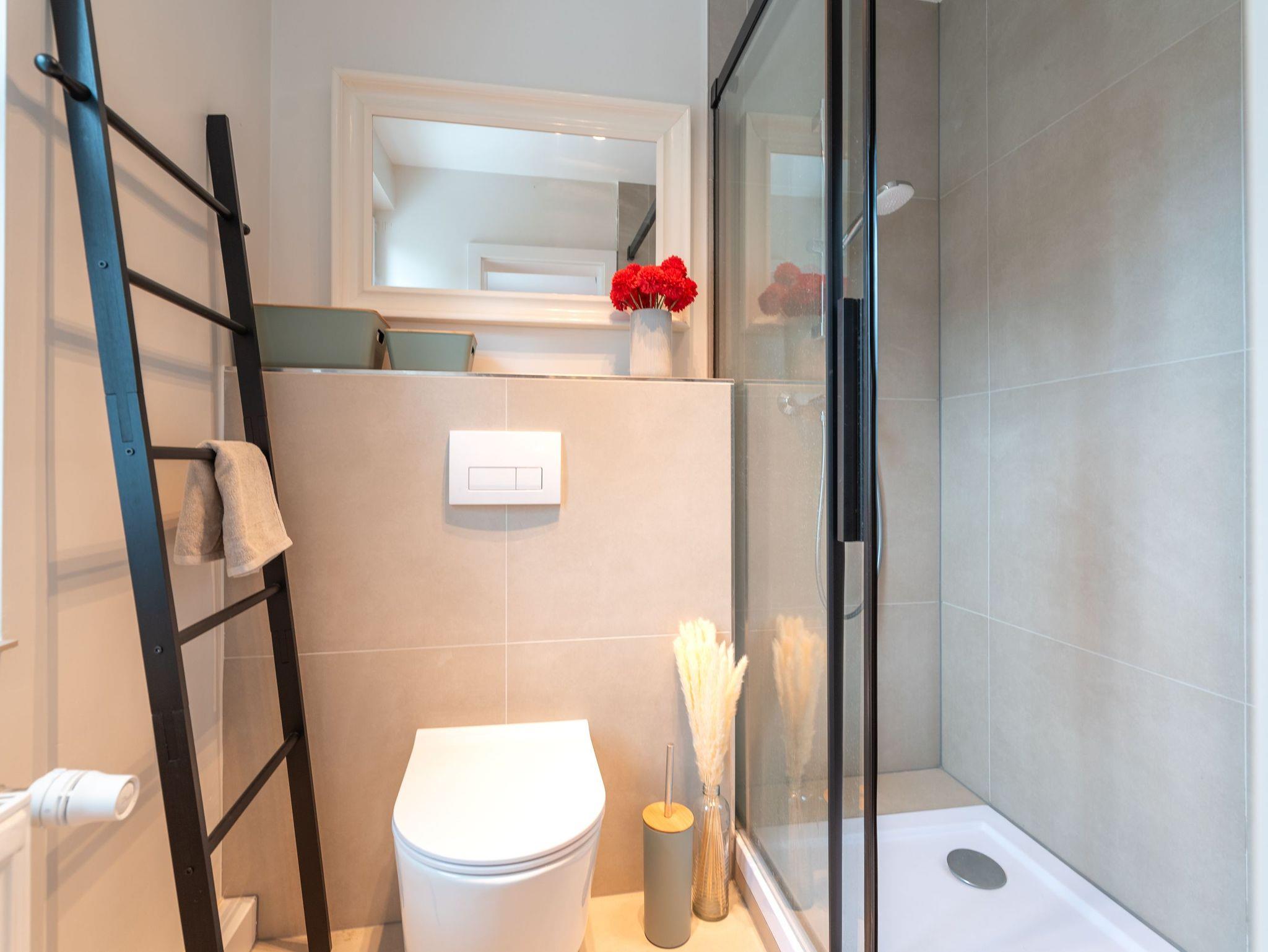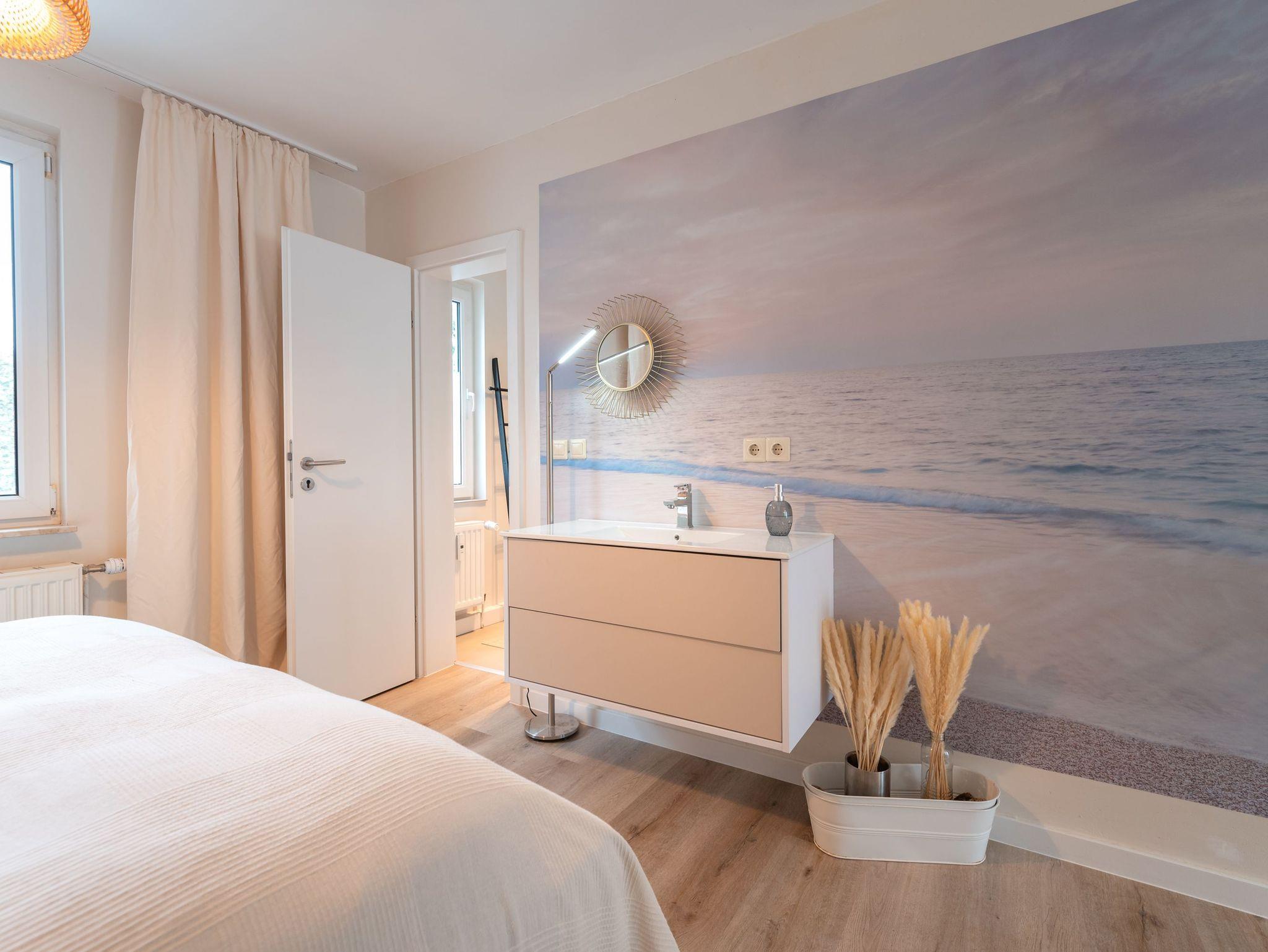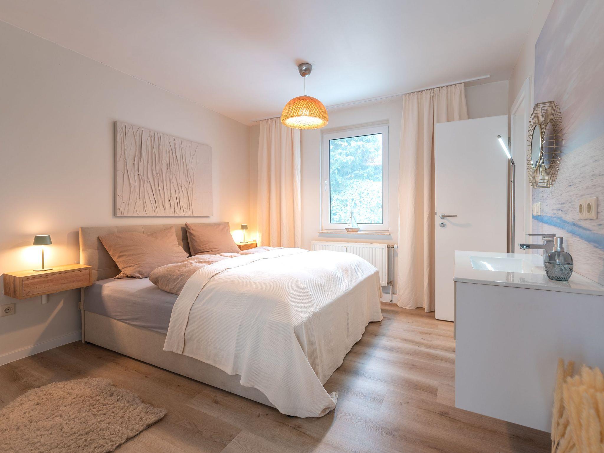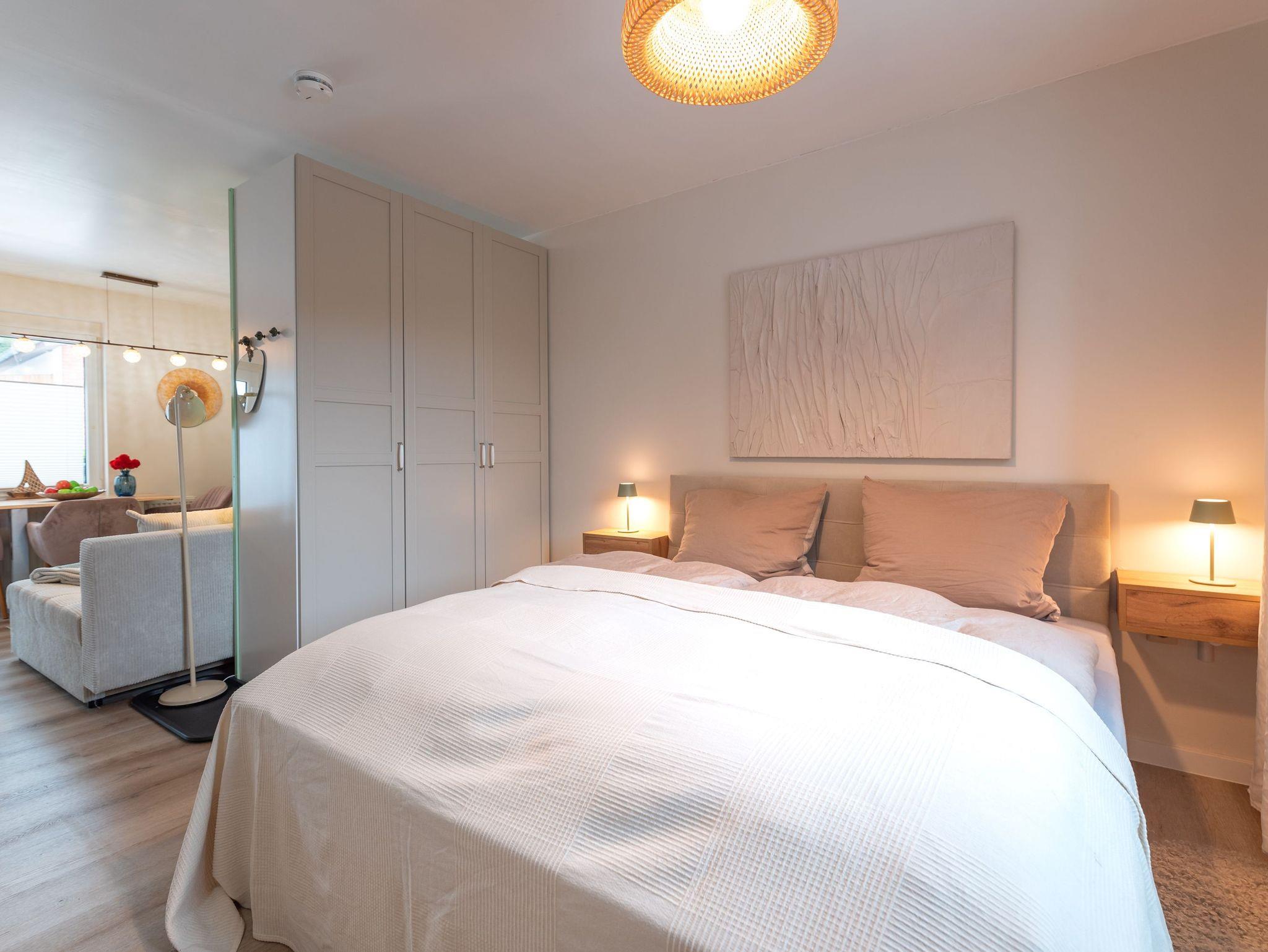 Der separate Schlafbereich ist mit einem luxuriösen 180 cm breiten Boxspringbett ausgestattet, das mit natürlicher Daunenbettwäsche und allergikerfreundlichen Materialien für besten Schlafkomfort sorgt. Das elegante Badezimmer punktet mit einer großzügigen, bodengleichen Regenwalddusche und sorgt für entspannende Wellness-Momente.