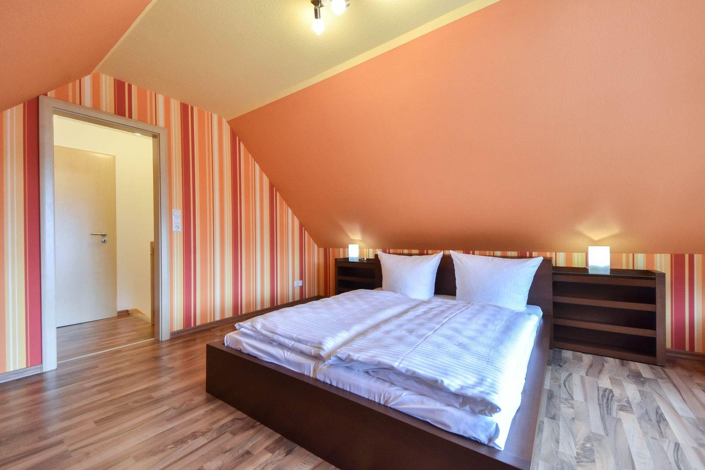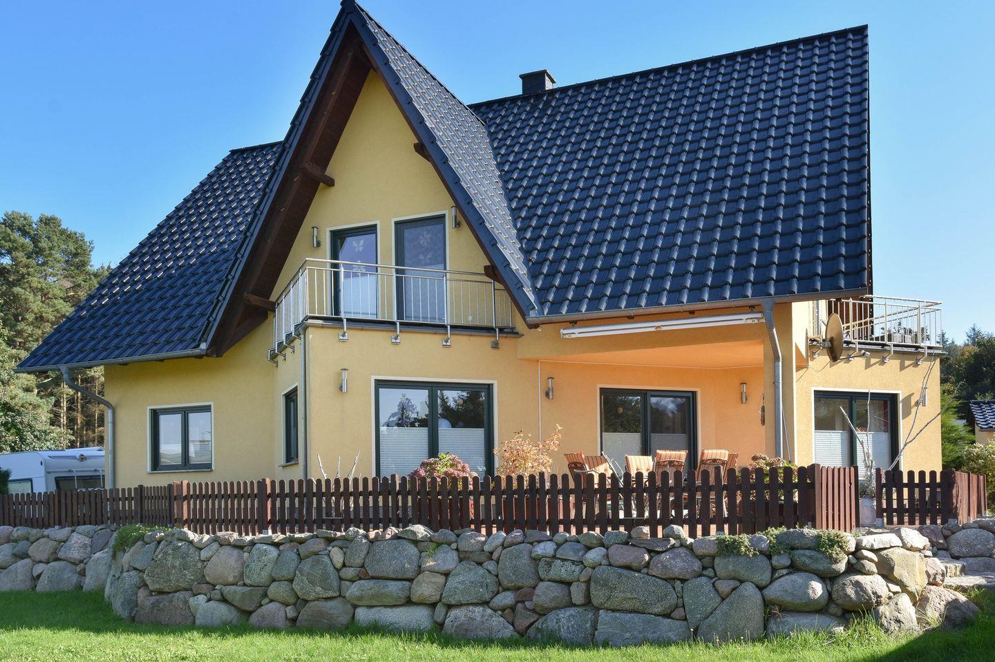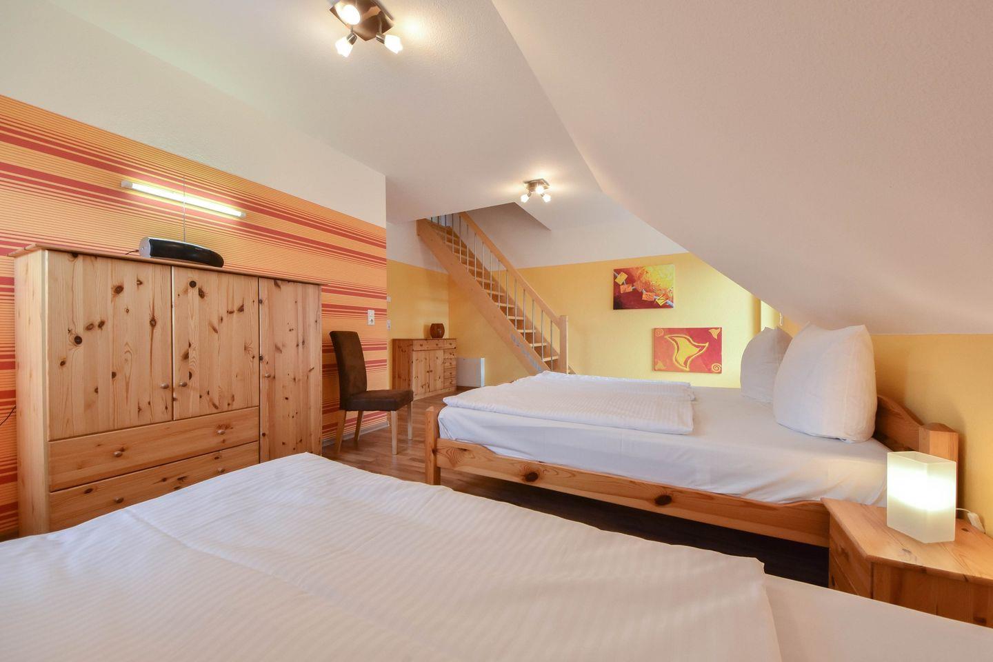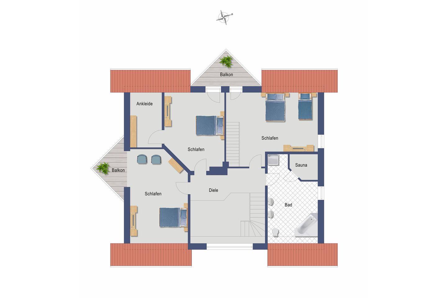 Auf den oberen Etagen befinden sich die Schlafzimmer. Drei der vier Schlafzimmer sind ausgestattet mit jeweils einem Doppelbett (Liegefläche 1,60 x 2,00 Meter) und einem eigenen TV, für Ihre Garderobe stehen in allen Zimmern Kommoden zur Verfügung. Eines der Schlafzimmer bietet Ihnen zudem einen begehbaren Kleiderschrank. Das vierte Schlafzimmer besitzt neben einem Doppelbett (Liegefläche 1,80 x 2,00 Meter) auch ein Einzelbett (Liegefläche 0,90 x 2,00 Meter). Von den zwei anliegenden Balkonen lässt sich der weitreichende Ausblick genießen. Aus dem Schlafzimmer unter dem Dach können Sie sogar bis zum nahegelegenen Schmollensee schauen. Das große Bad im oberen Geschoss verfügt neben einem WC und einer ebenerdigen Dusche auch über zwei Waschtische, eine Badewanne und - als zusätzliches Highlight - über eine eigene Sauna. Das kleine Radio im Bad begleitet Sie musikalisch während den Saunagängen. Ein zweites Bad im Erdgeschoss, ebenfalls ausgestattet mit WC, Waschtisch und ebenerdiger Dusche rundet Ihren Aufenthalt vollends ab.