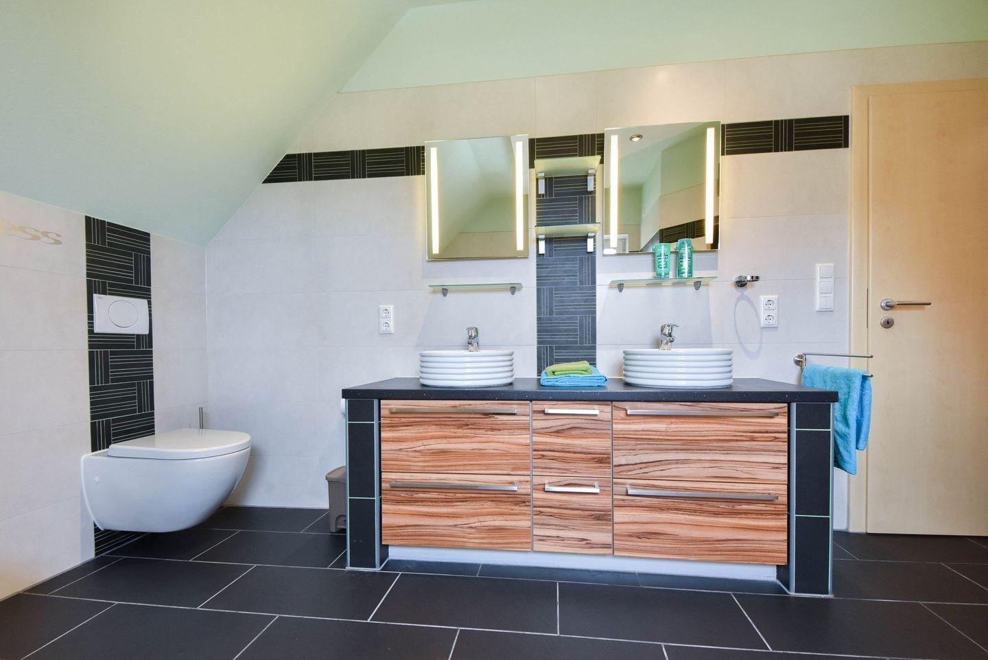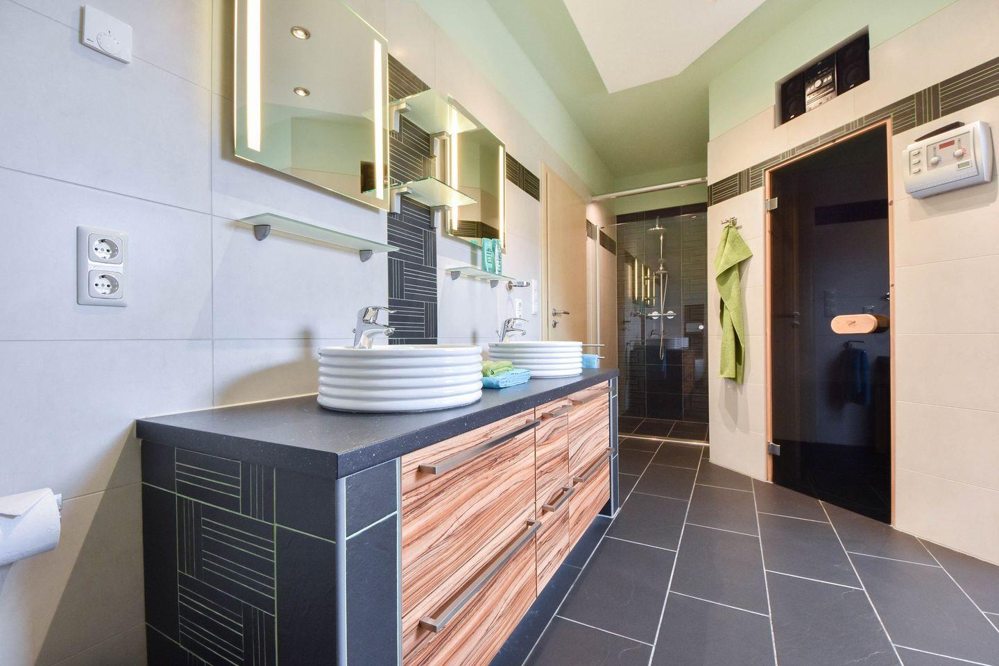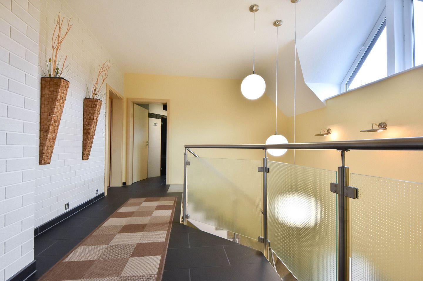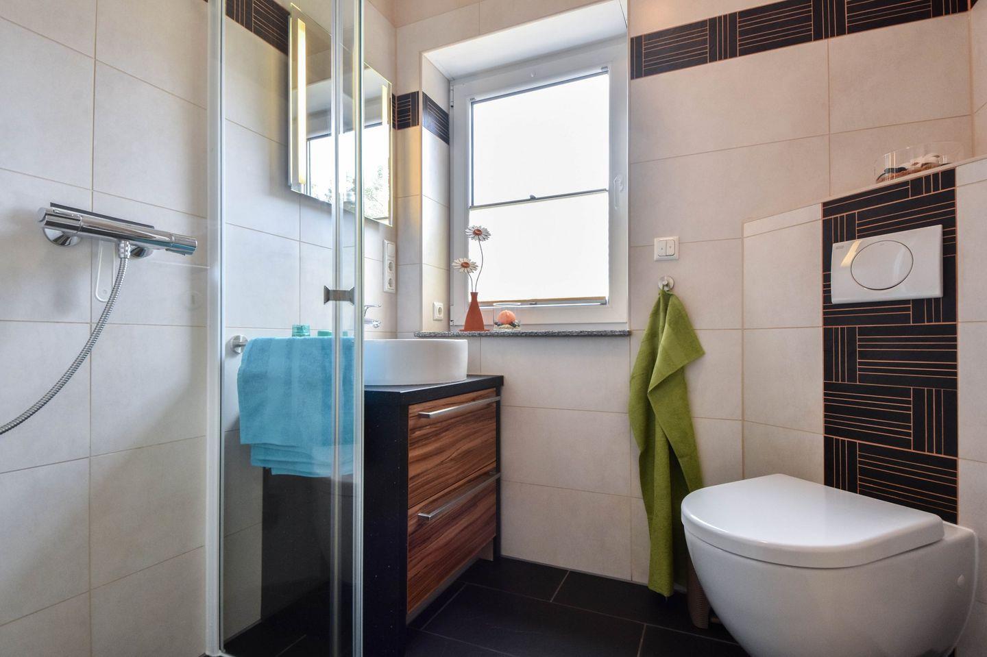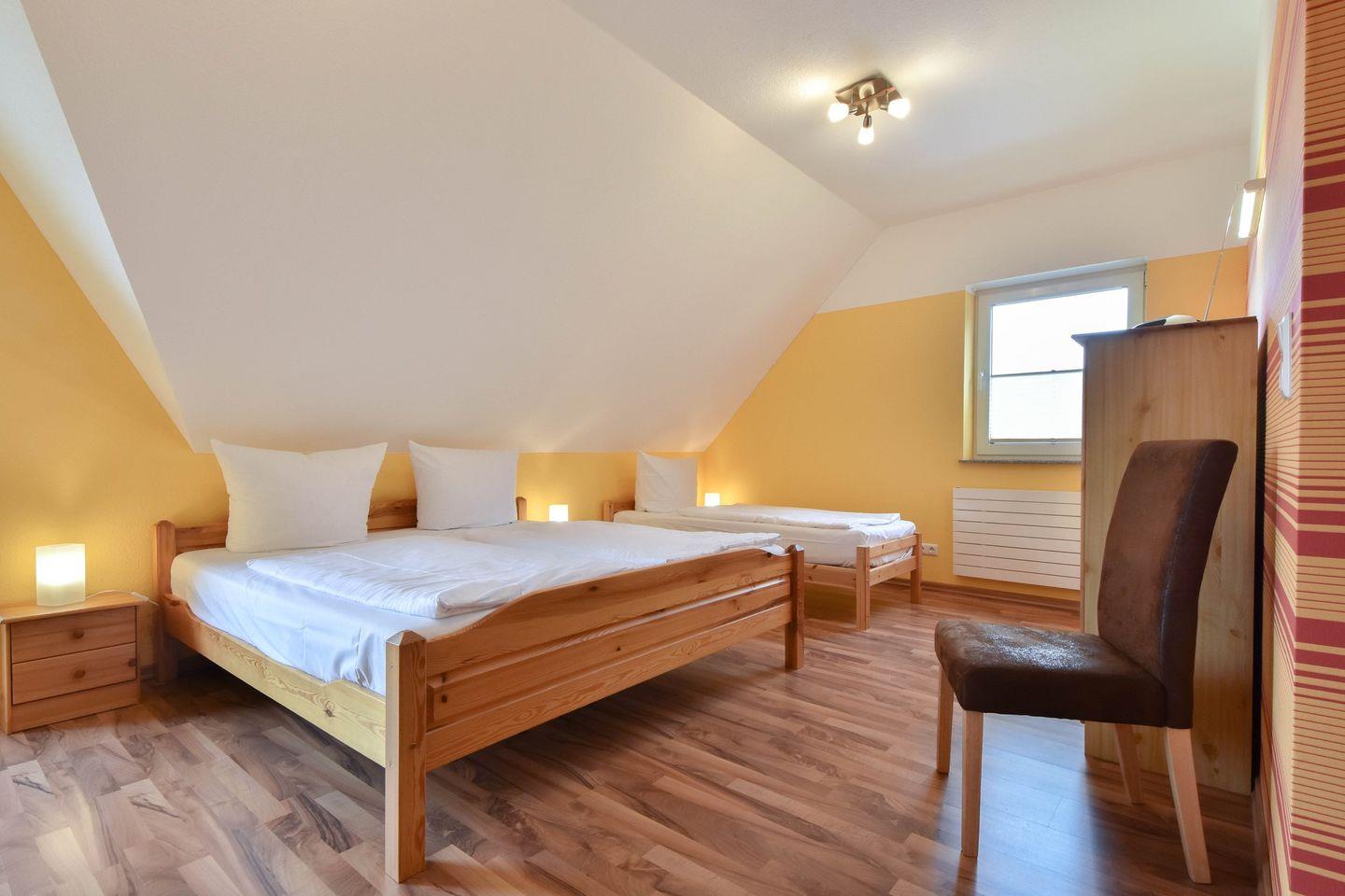 Auf den oberen Etagen befinden sich die Schlafzimmer. Drei der vier Schlafzimmer sind ausgestattet mit jeweils einem Doppelbett (Liegefläche 1,60 x 2,00 Meter) und einem eigenen TV, für Ihre Garderobe stehen in allen Zimmern Kommoden zur Verfügung. Eines der Schlafzimmer bietet Ihnen zudem einen begehbaren Kleiderschrank. Das vierte Schlafzimmer besitzt neben einem Doppelbett (Liegefläche 1,80 x 2,00 Meter) auch ein Einzelbett (Liegefläche 0,90 x 2,00 Meter). Von den zwei anliegenden Balkonen lässt sich der weitreichende Ausblick genießen. Aus dem Schlafzimmer unter dem Dach können Sie sogar bis zum nahegelegenen Schmollensee schauen. Das große Bad im oberen Geschoss verfügt neben einem WC und einer ebenerdigen Dusche auch über zwei Waschtische, eine Badewanne und - als zusätzliches Highlight - über eine eigene Sauna. Das kleine Radio im Bad begleitet Sie musikalisch während den Saunagängen. Ein zweites Bad im Erdgeschoss, ebenfalls ausgestattet mit WC, Waschtisch und ebenerdiger Dusche rundet Ihren Aufenthalt vollends ab.