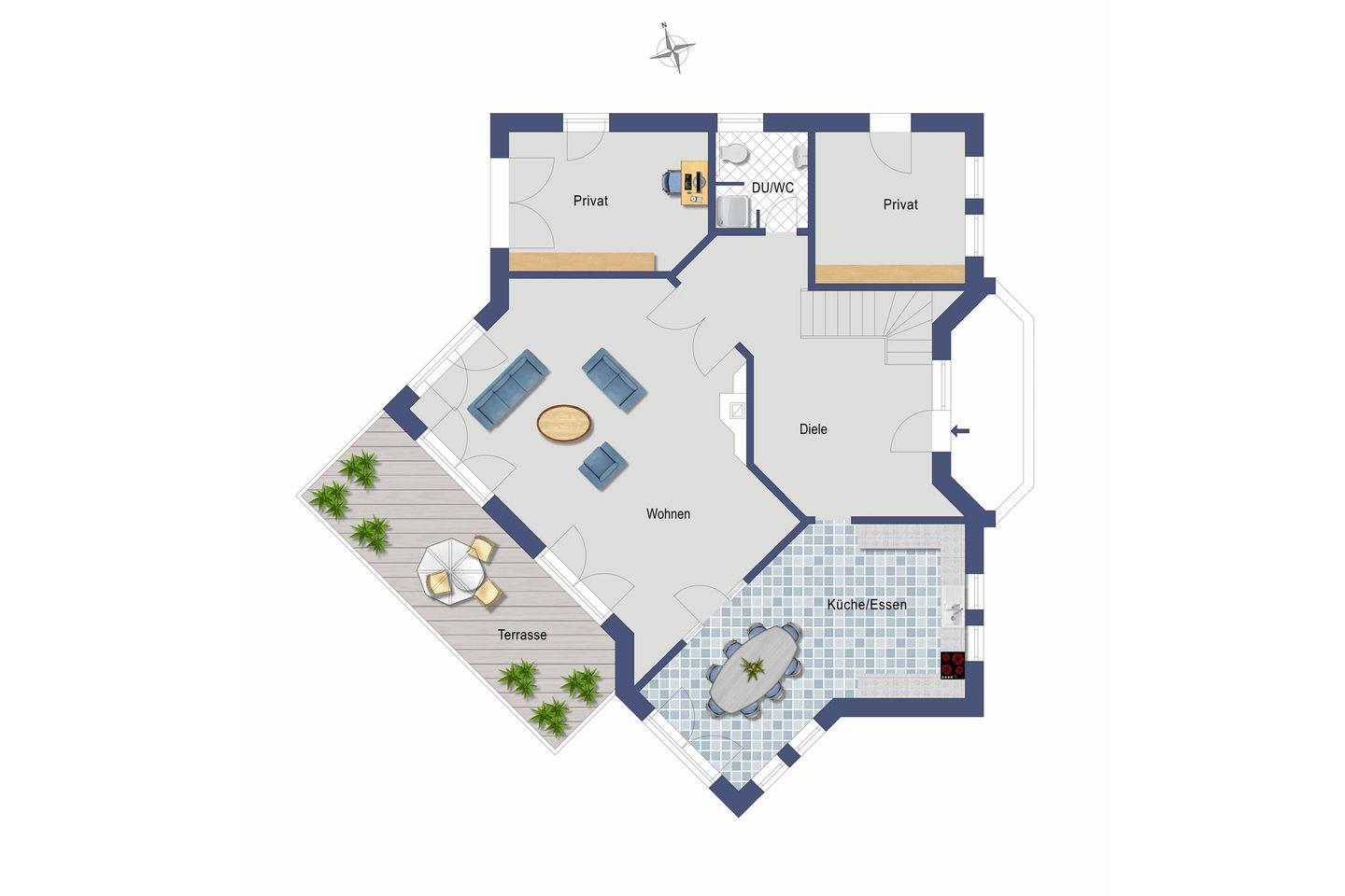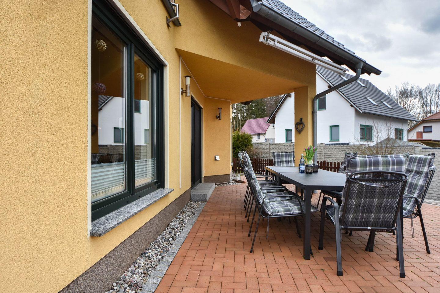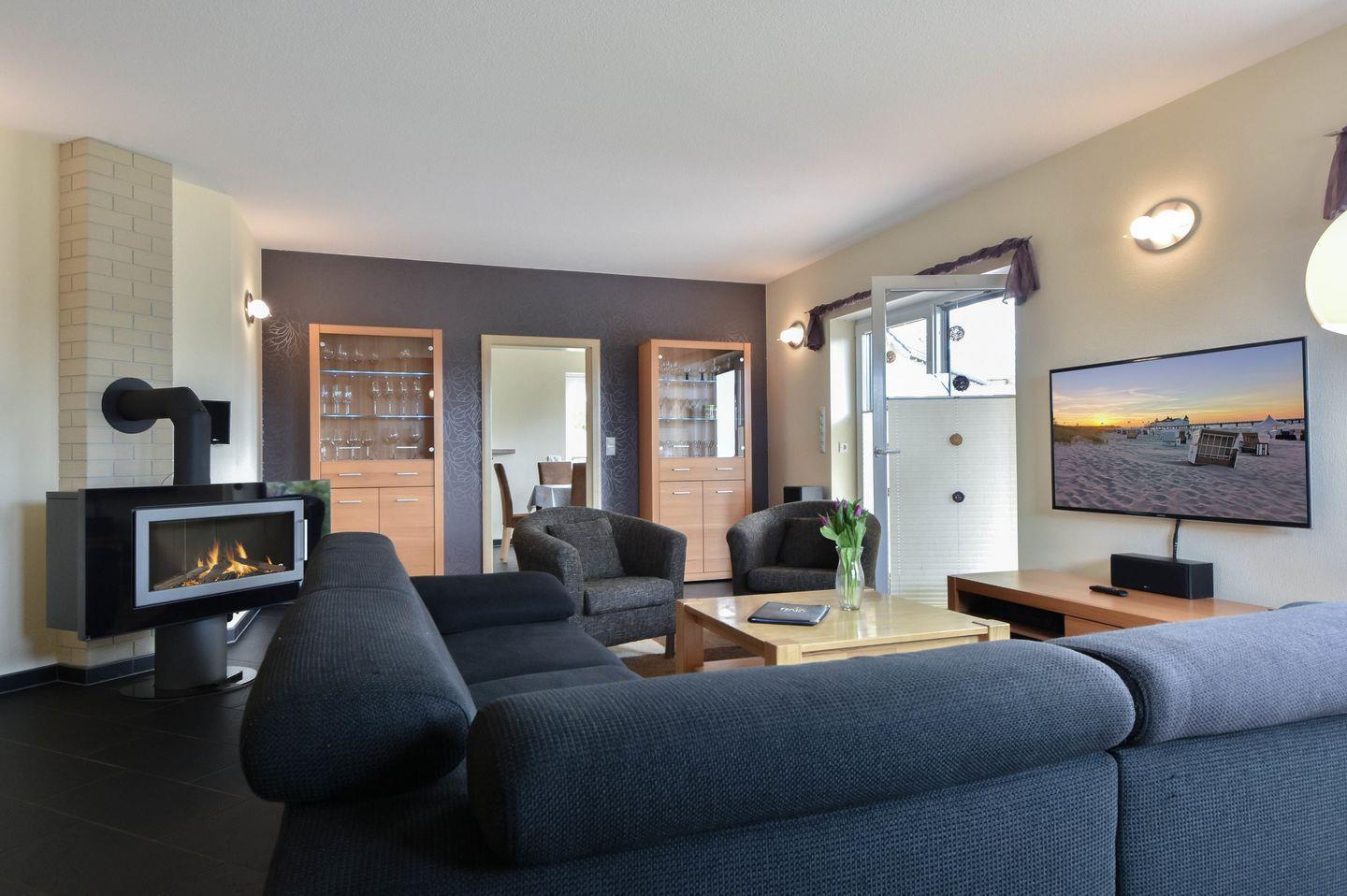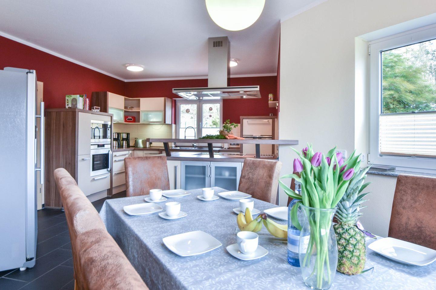 Das geräumige Wohnzimmer ist stilvoll eingerichtet mit einer weitläufigen Couchgarnitur, Sesseln, einem 55-Zoll-Flachbild-TV und einem Surround-System ausgestattet. An kalten Wintertagen sorgt der Kamin für zusätzlichen Komfort und angenehme Atmosphäre. In den Sommermonaten genießen Sie Ihre Abende im gemütlichen Beisammensein auf der anliegenden Terrasse. Während Sie den fest installierten Kamingrill einheizen, haben die Kinder Spaß im Garten mit Spielturm, Rutsche und Schaukel. Sollte das Wetter einmal nicht mitspielen, lässt es sich auch hervorragend im Küchen- und Essbereich dinieren. Am großen Esstisch findet jedes Familienmitglied Platz. Die hochwertig ausgestattete Küche lädt mit nützlichen Küchenhelfern auch zum Kochen und Selbstverpflegen ein.