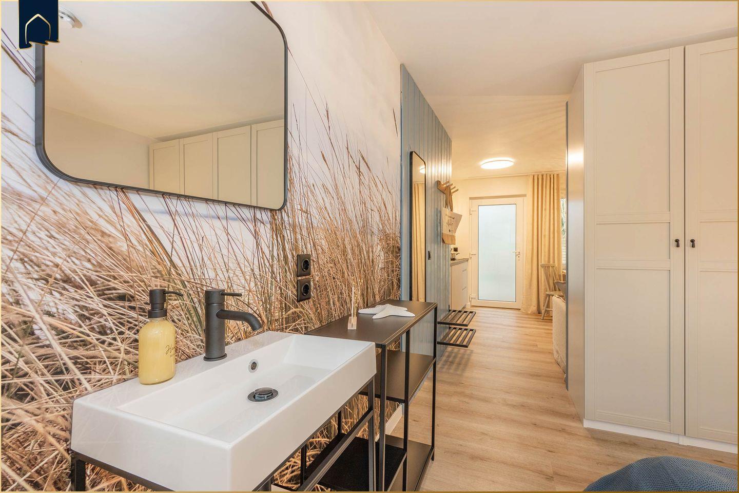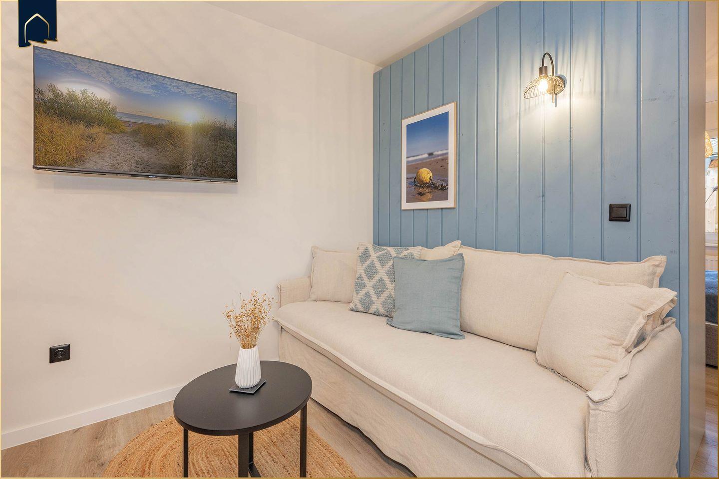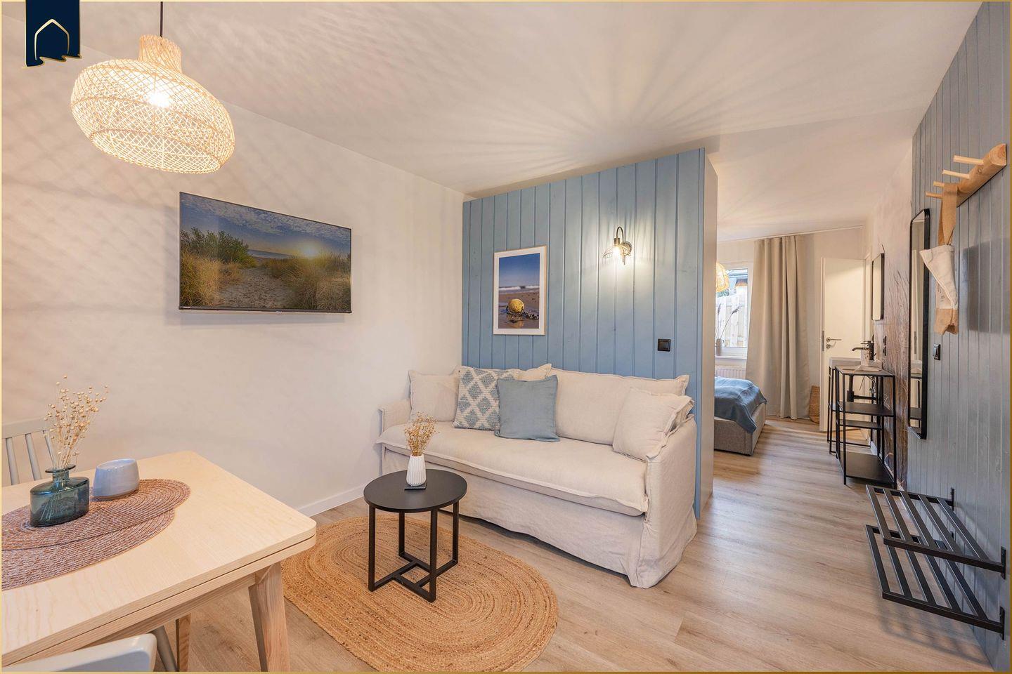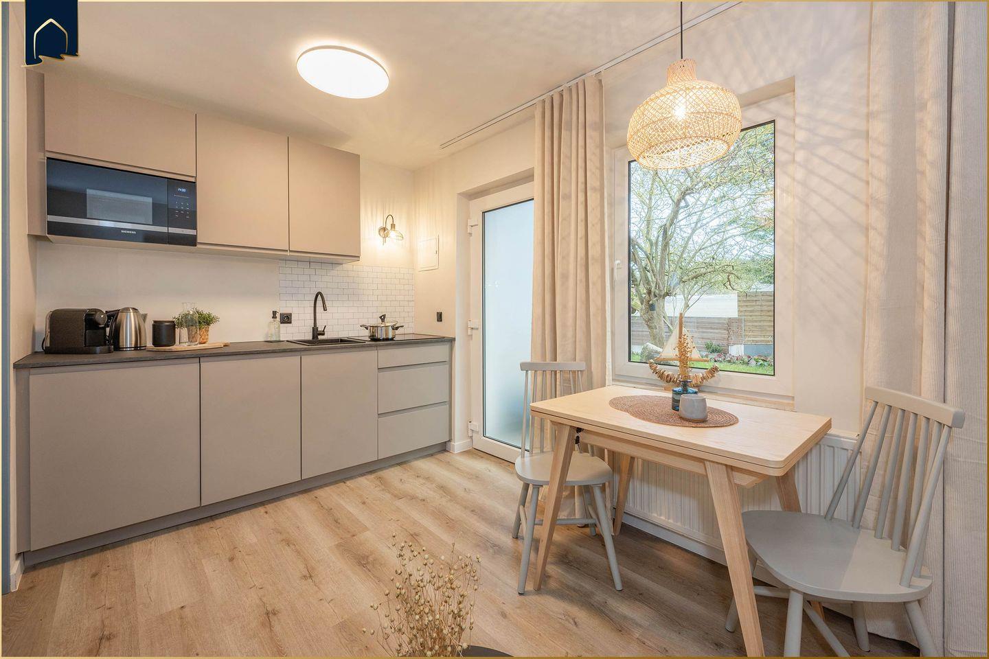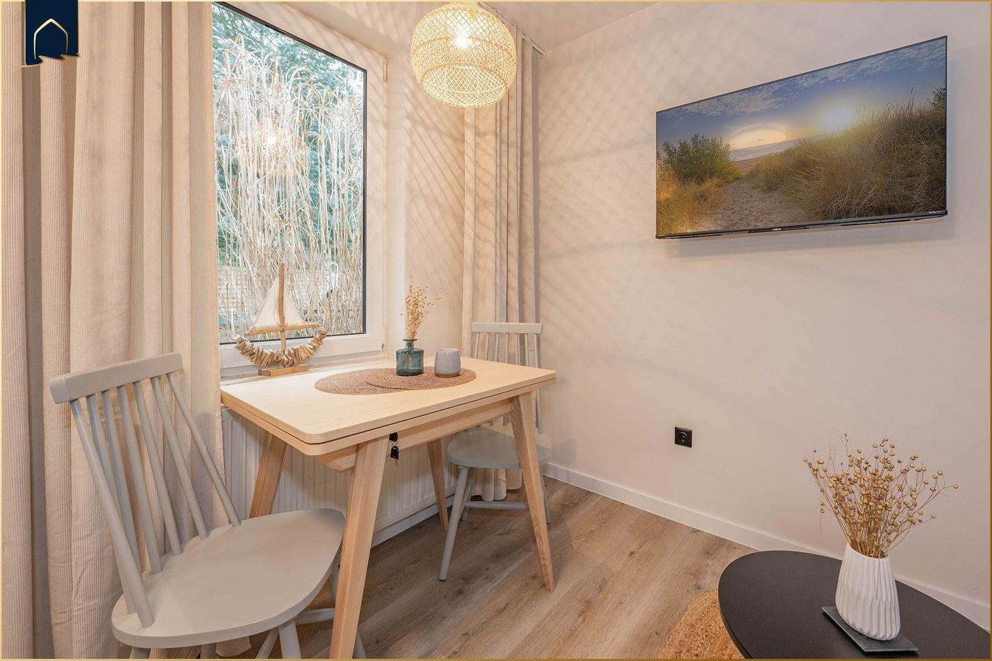 Das gemütliche Appartement „My second Home“ in Benz auf Usedom bietet auf 33 m² alles, was du für einen entspannten Urlaub zu zweit brauchst. Ideal für Paare oder Alleinreisende, überzeugt diese Ferienunterkunft durch ihr durchdachtes Raumkonzept: ein separates Schlafzimmer sorgt für erholsamen Schlaf, der offene Wohn-Essbereich bietet mit Sofa, Esstisch und TV eine Wohlfühlatmosphäre für gemütliche Abende. Die moderne Küche ist voll ausgestattet – mit Spülmaschine, Herd, Kühlschrank, Gefrierfach, Mikrowelle, Toaster, Wasserkocher und sogar einer Cafissimo Pure+ Kapselmaschine, die dir wahlweise Espresso, Caffè Crema oder Filterkaffee auf Knopfdruck zubereitet. So startet jeder Urlaubstag mit einem Lächeln.