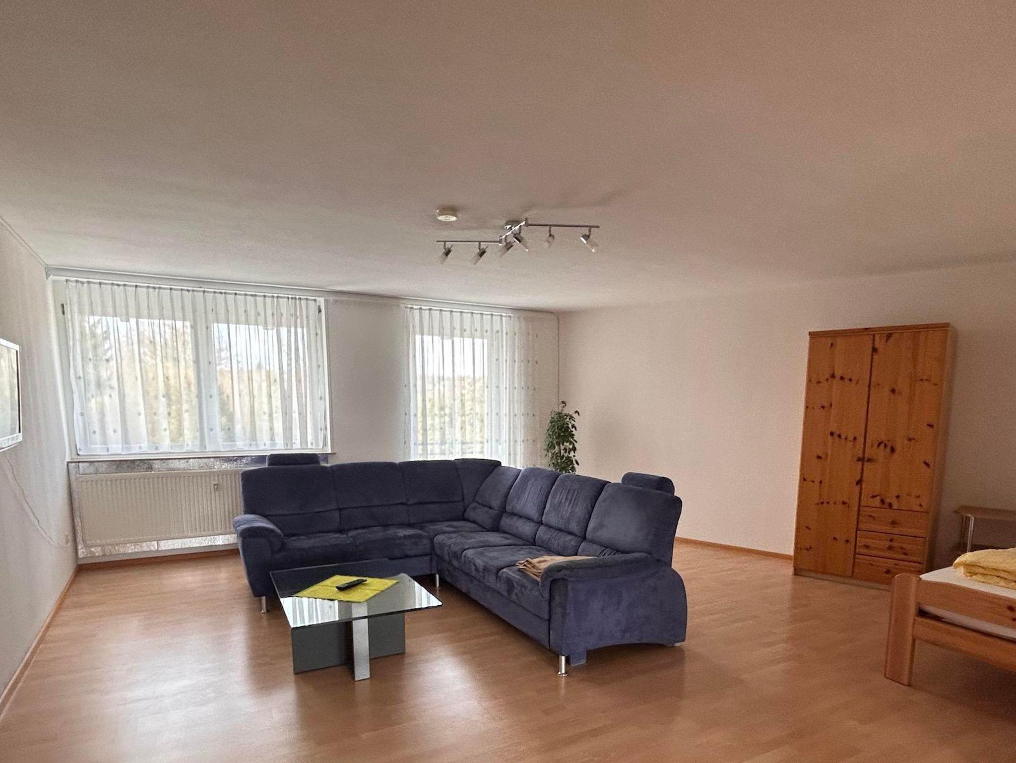• Wohnzimmer mit gemütlicher Couch (Schlaffunktion), zusätzlichem Bett, und TV
