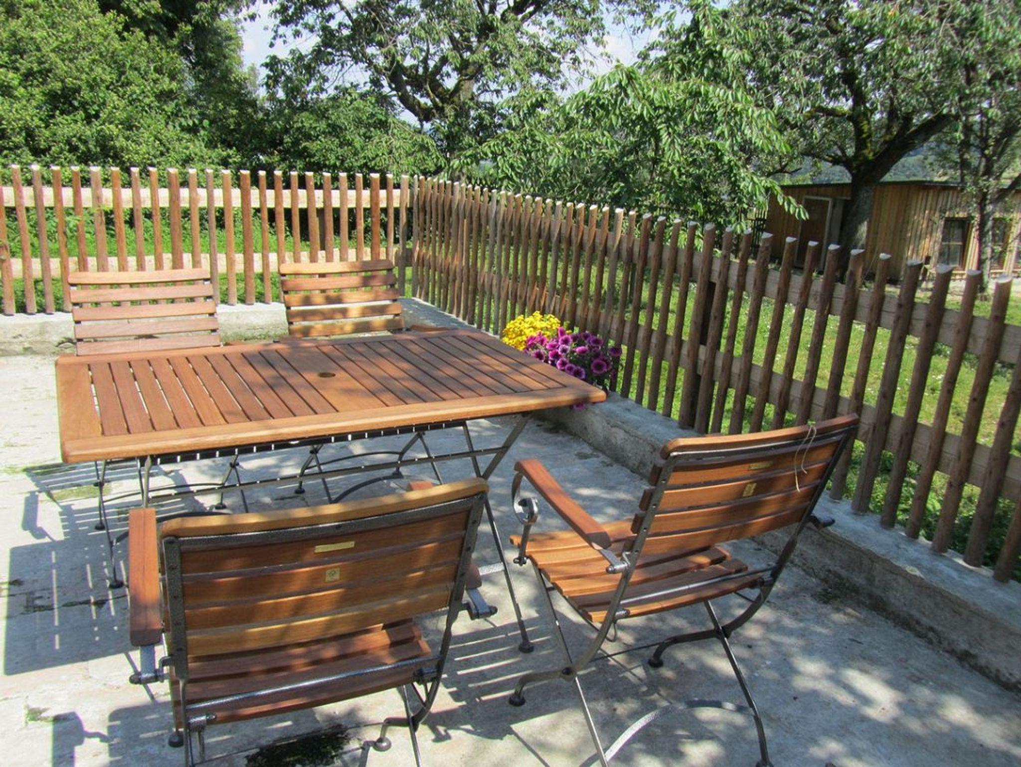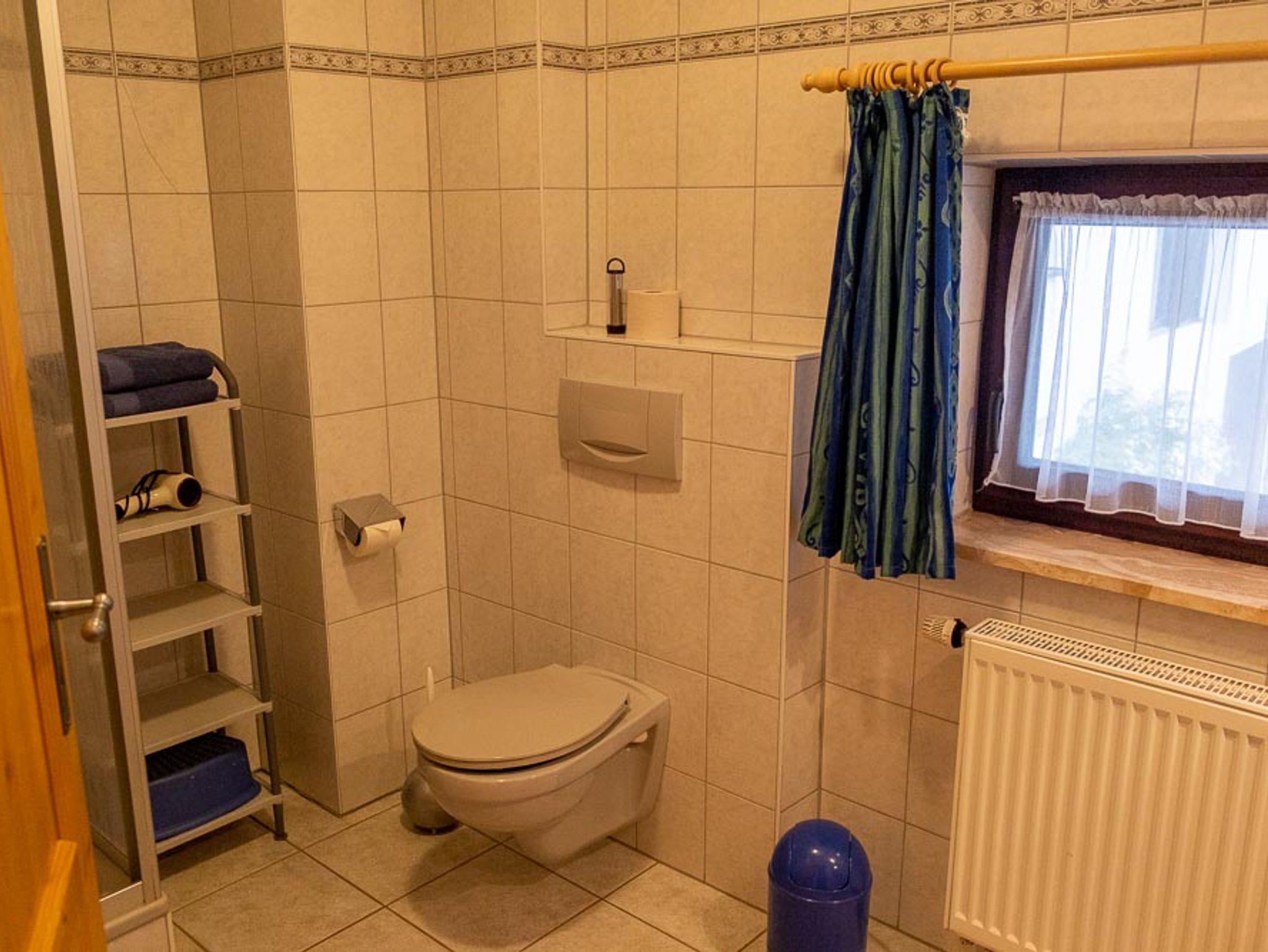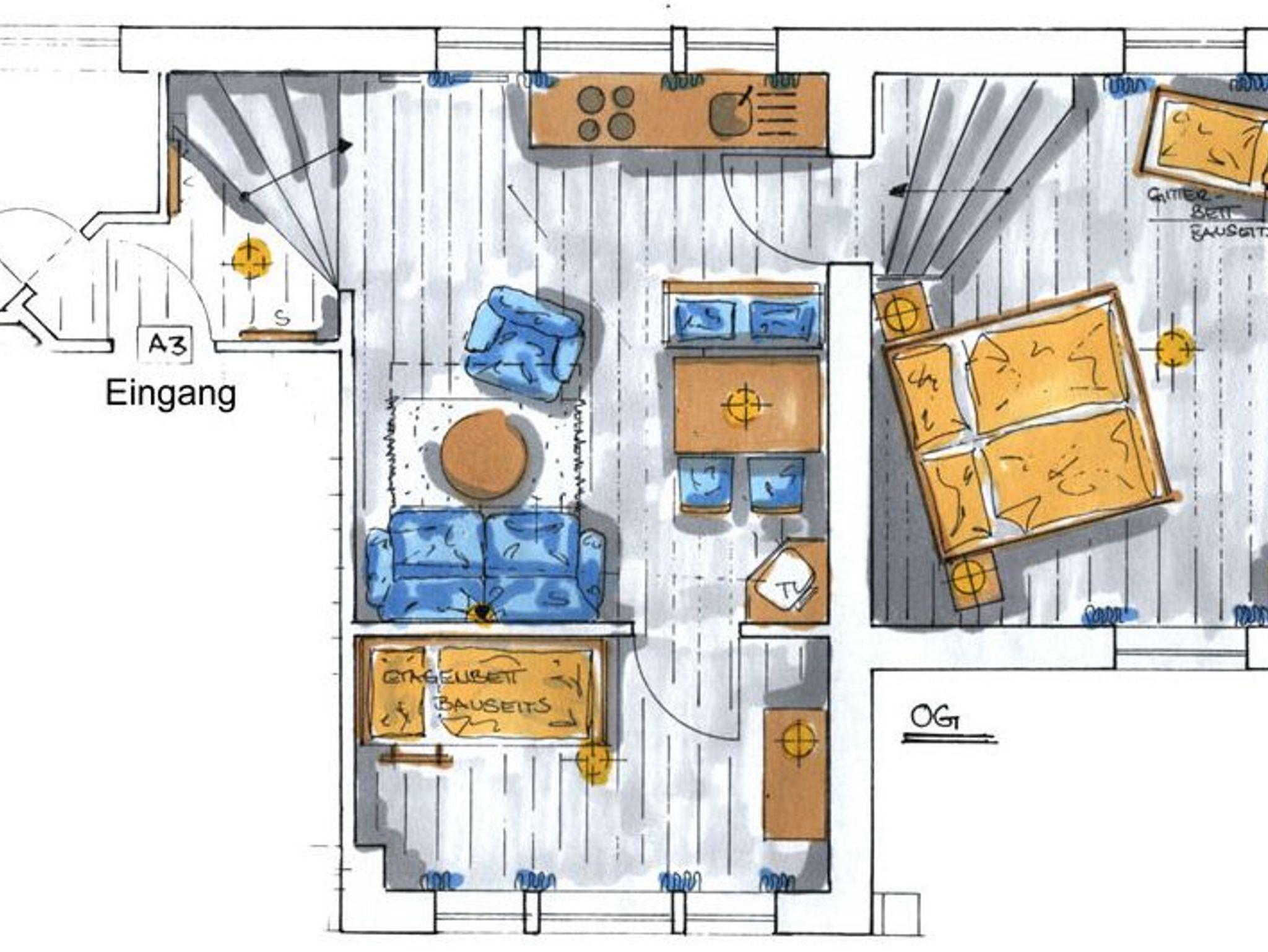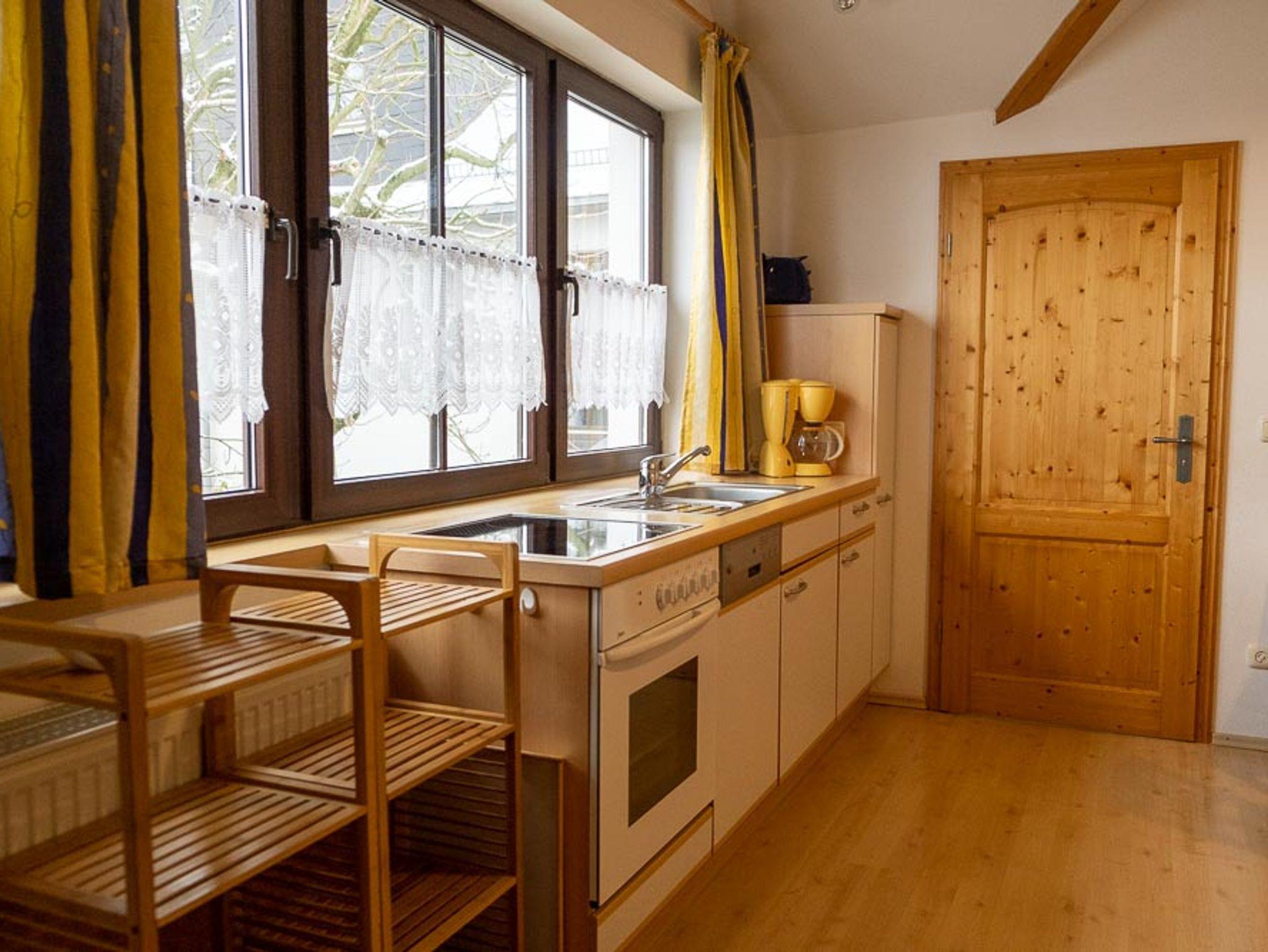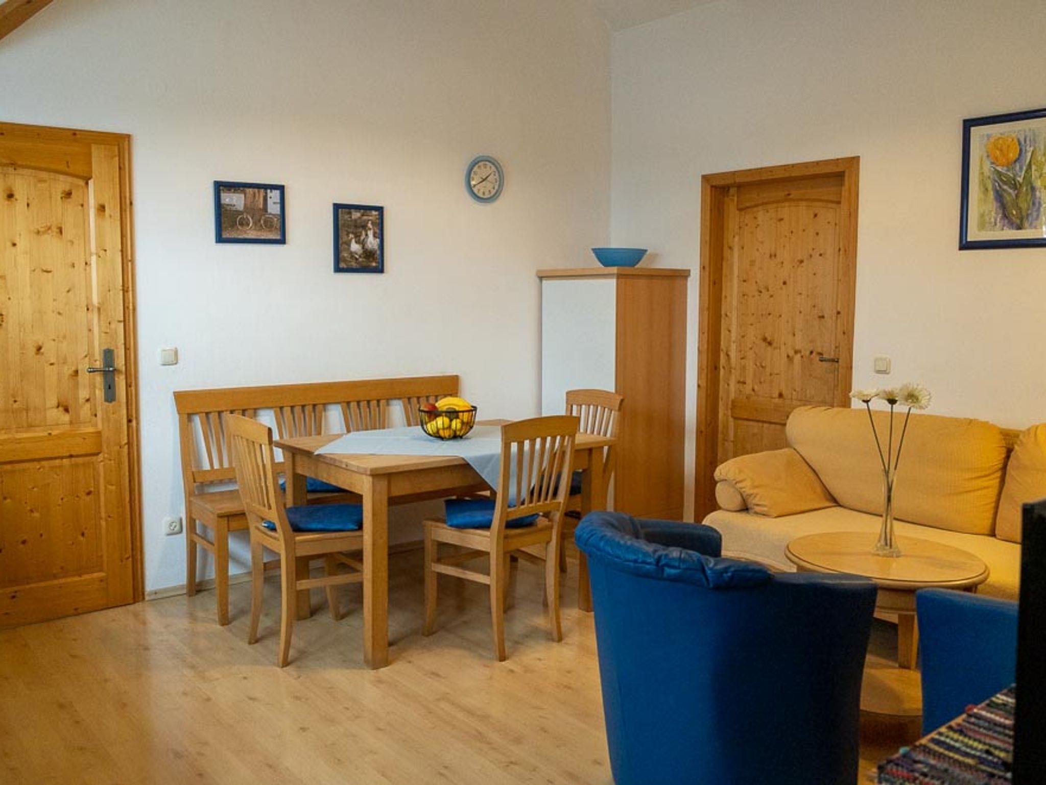 Die Wohnung III (60m²) liegt im 1. Stock und hat einen herrlichen Blick in unseren historischen Innenhof und auf den Obstgarten. Sie hat ein Schlafzimmer mit Doppelbett und Einzellbett, die Lattenroste sind im Kopfteil höhenverstellbar, ein Kinderzimmer mit Etagenbett, ein Wohnzimmer, Küchenzeile, Dusche / WC mit Fenster.