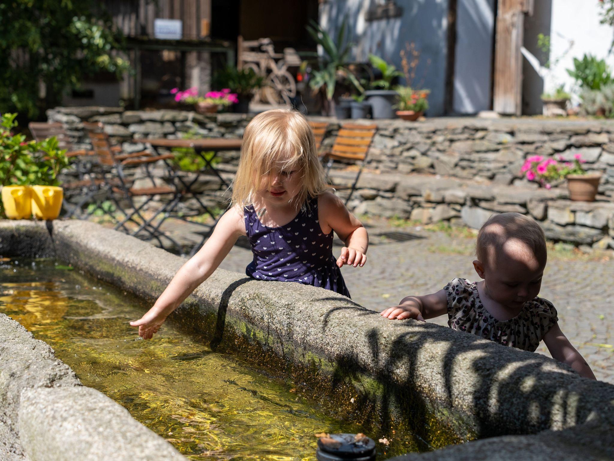 Der historische Innenhof mit den großen Bäumen und dem alten Brunnen, aus dem seit 1799 frisches Quellwasser sprudelt, hat mediterranen Flair und ist der ideale Platz zum Genießen, Entspannen, Frühstücken oder für ein Gläschen Bier / Wein am Abend.