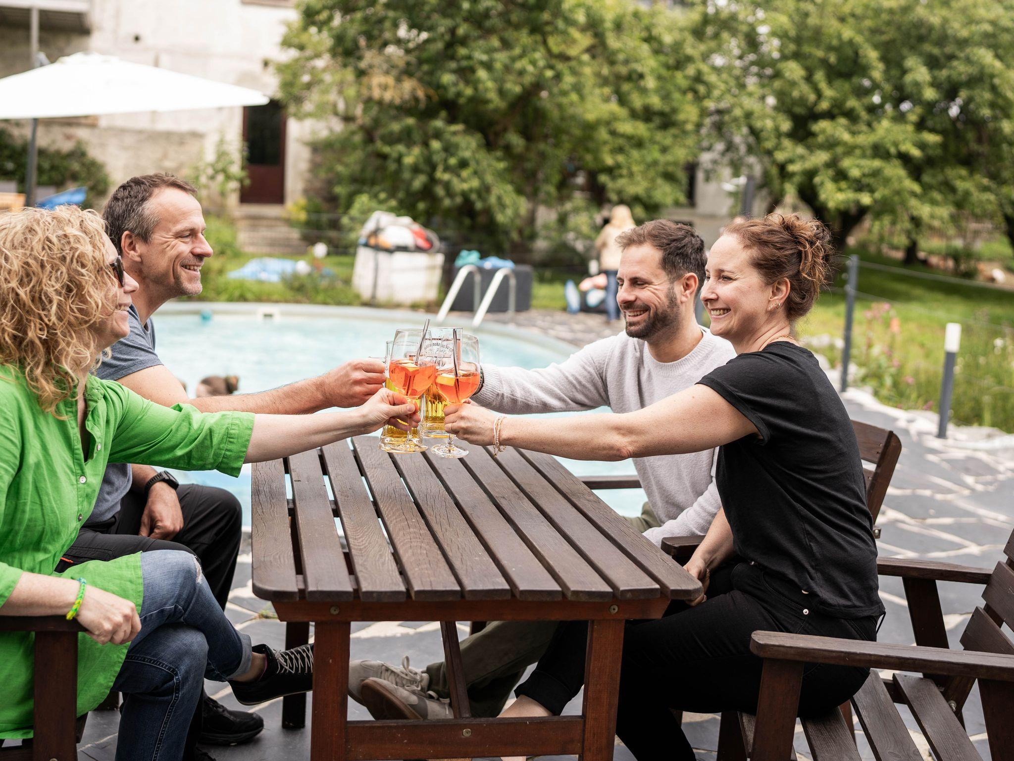 Der historische Innenhof mit den großen Bäumen und dem alten Brunnen, aus dem seit 1799 frisches Quellwasser sprudelt, hat mediterranen Flair und ist der ideale Platz zum Genießen, Entspannen, Frühstücken oder für ein Gläschen Bier / Wein am Abend.