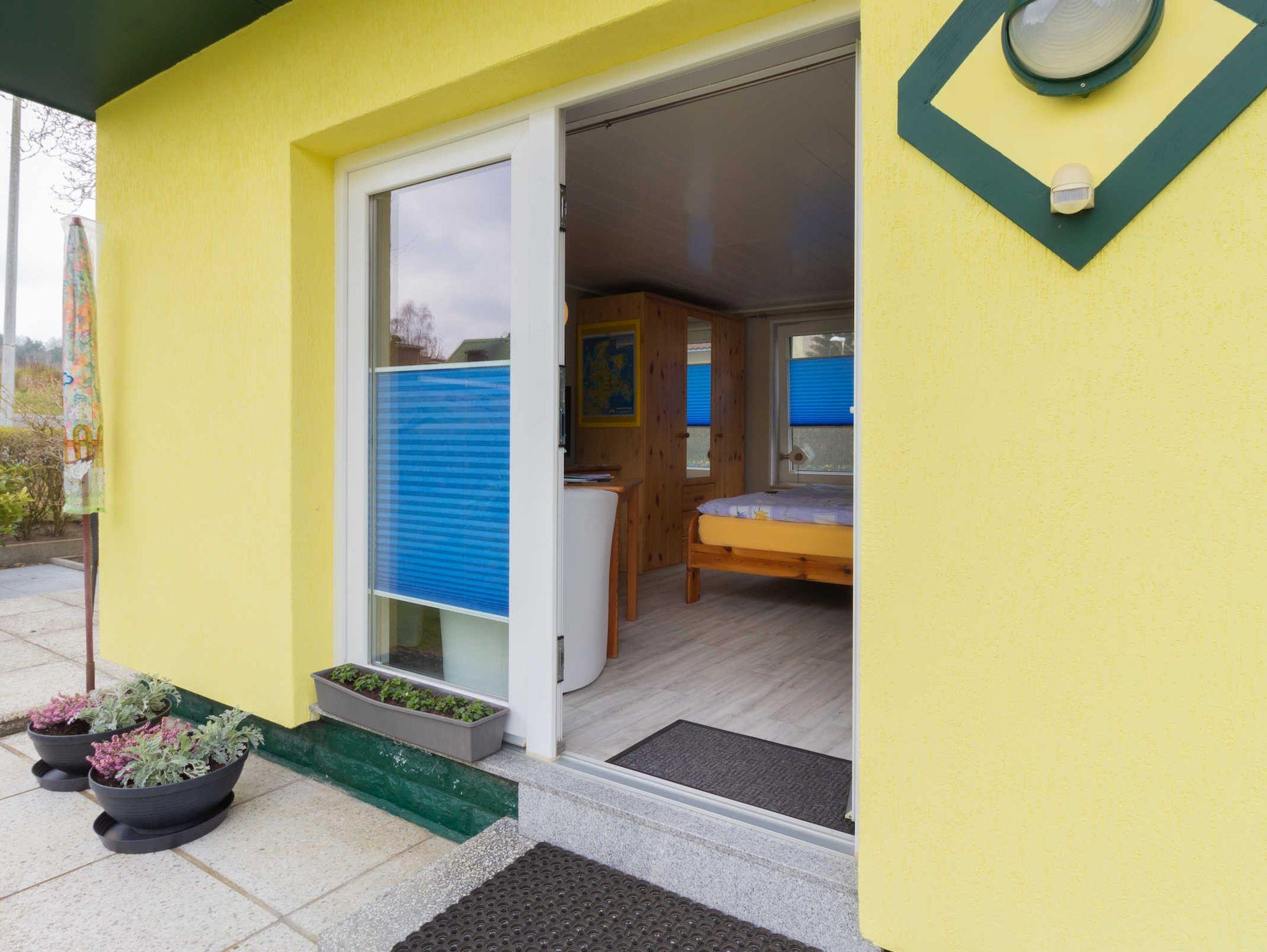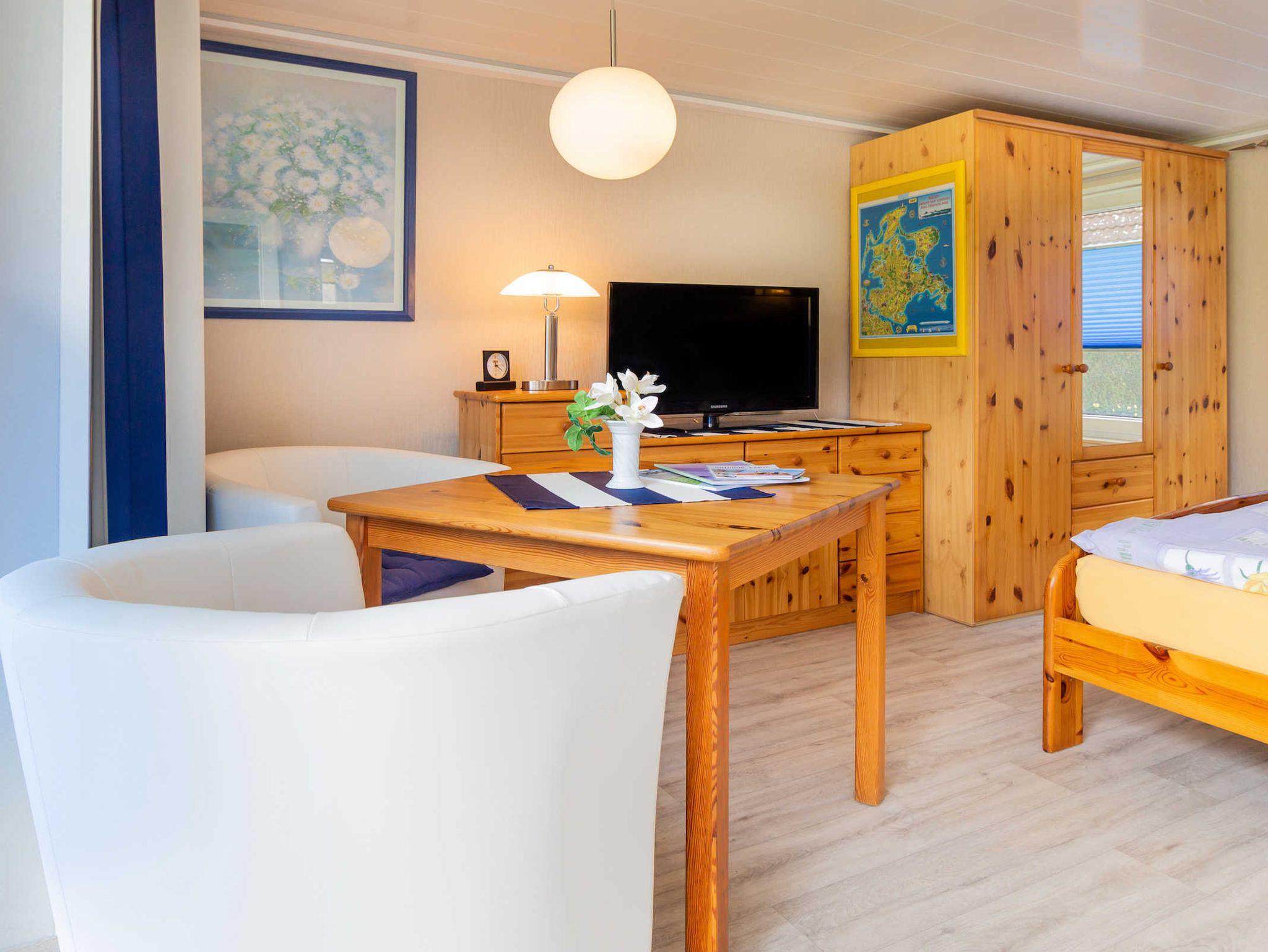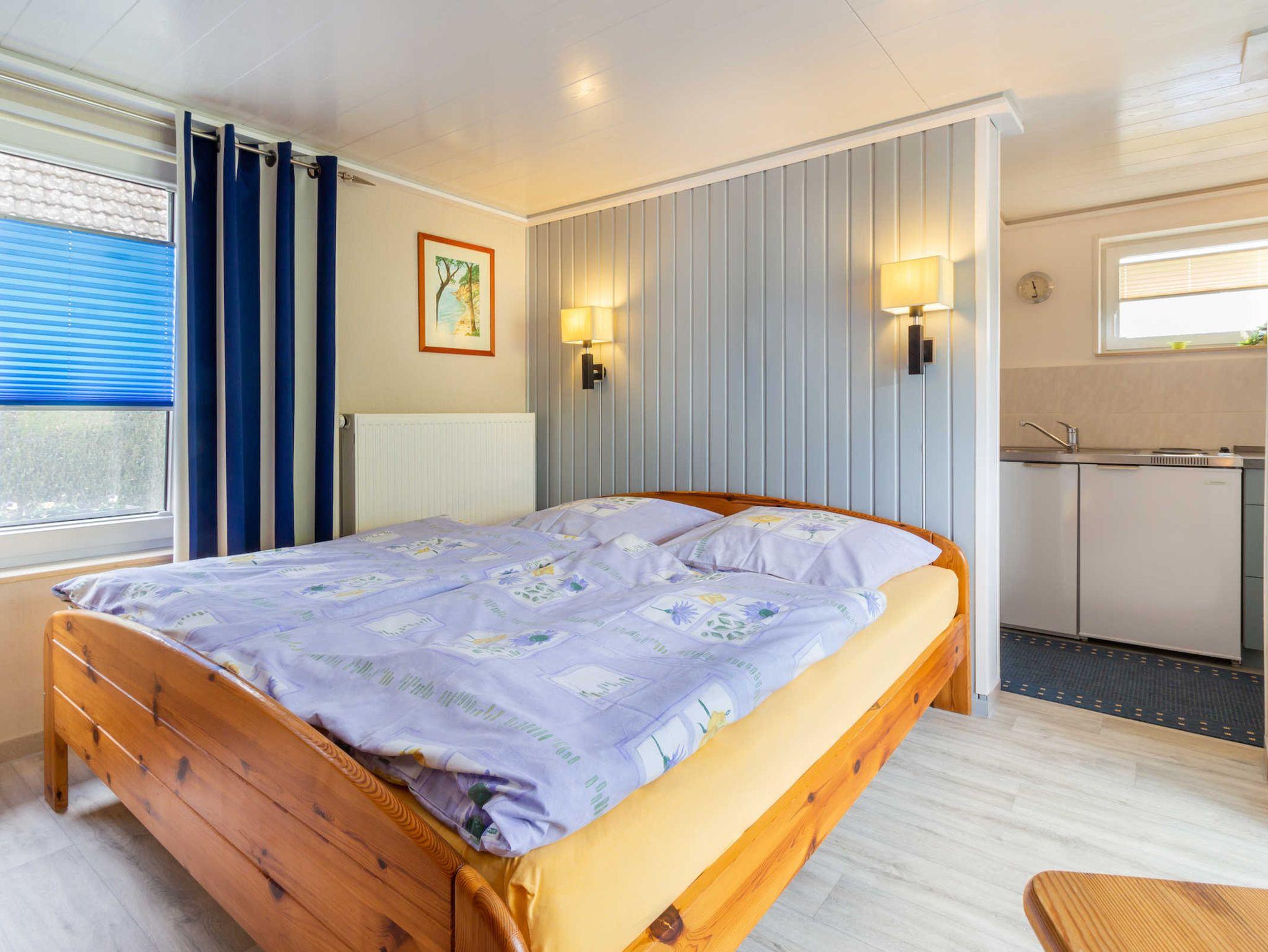 • ein kombiniertes Wohn-/ Schlafzimmer mit einem Doppelbett, Essplatz, Radio, SAT-TV sowie Heizung