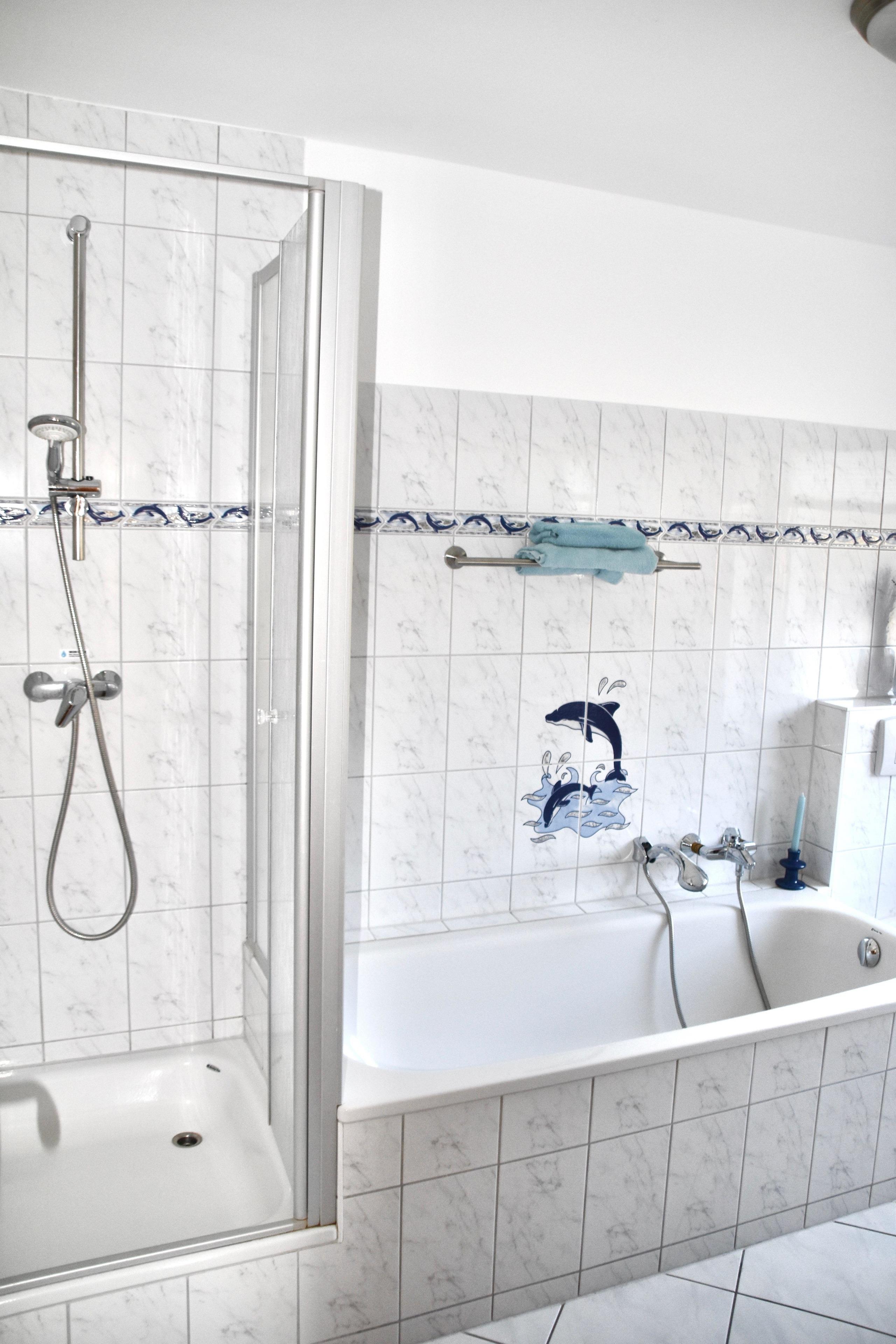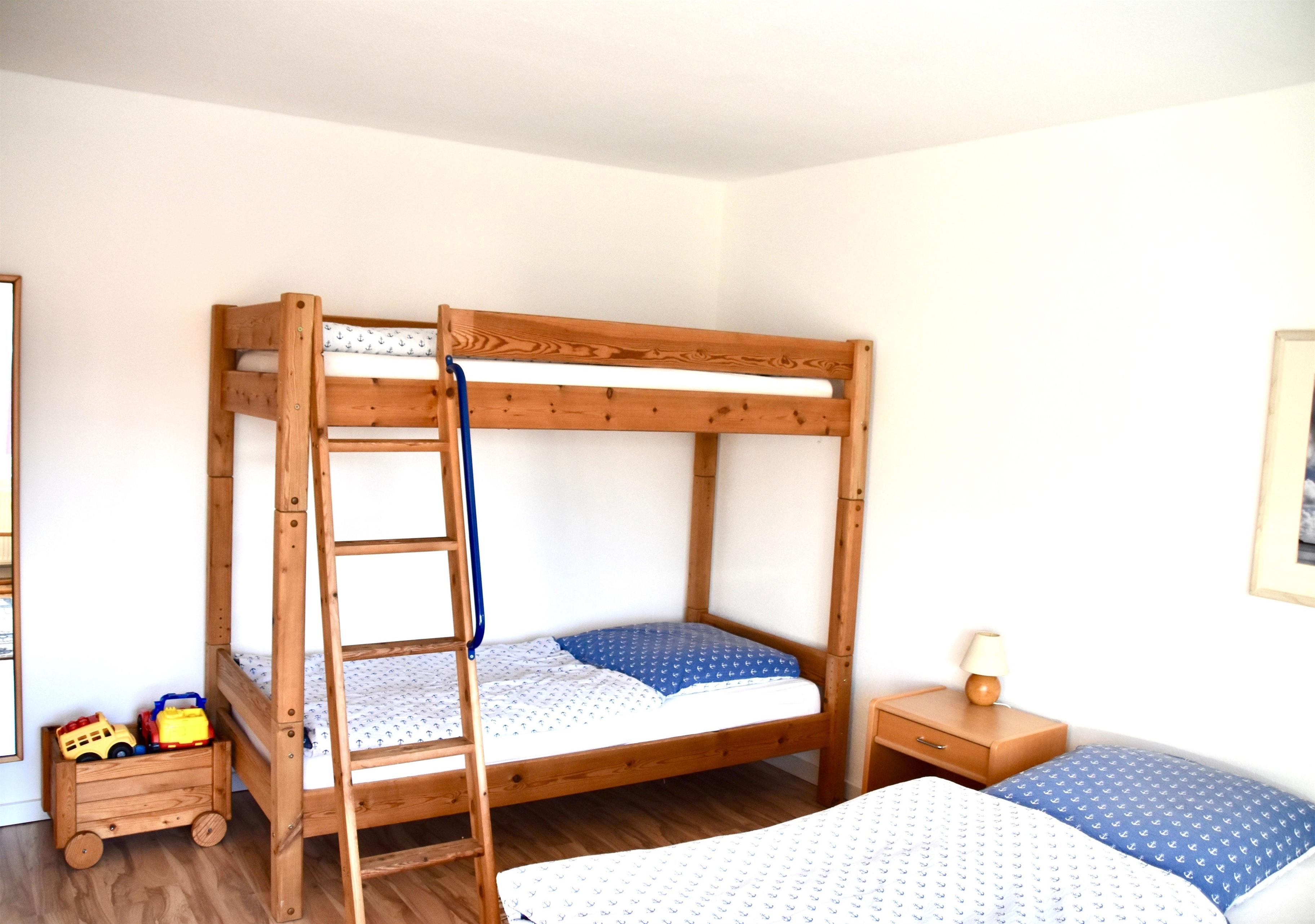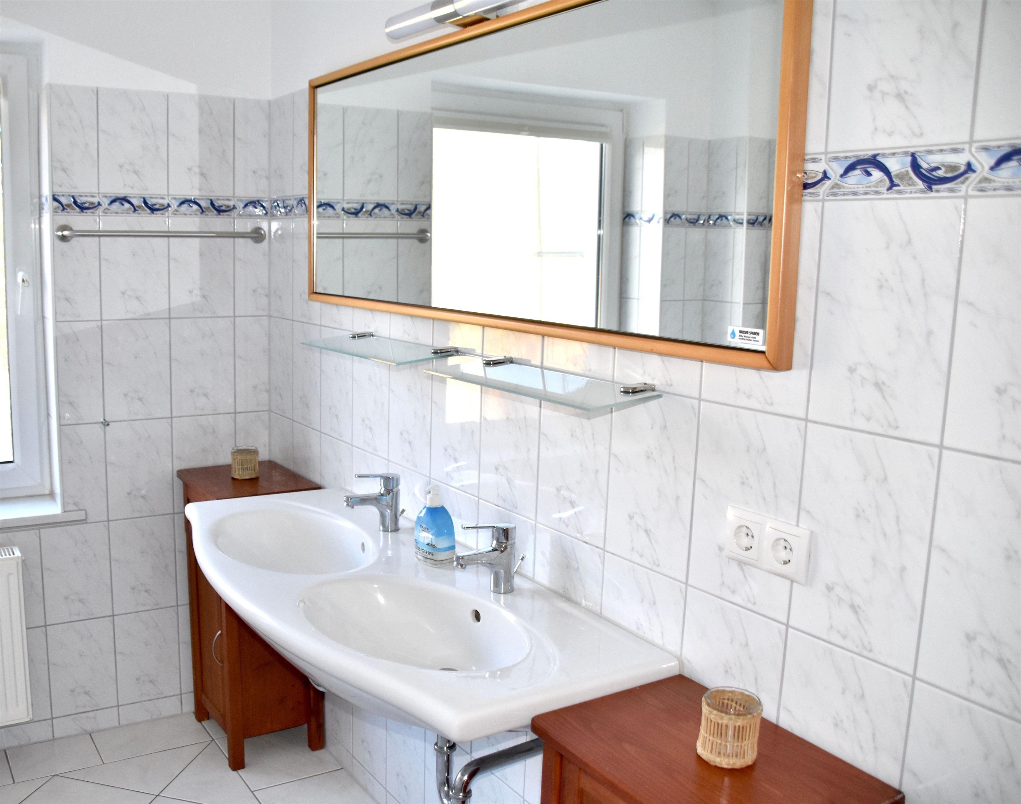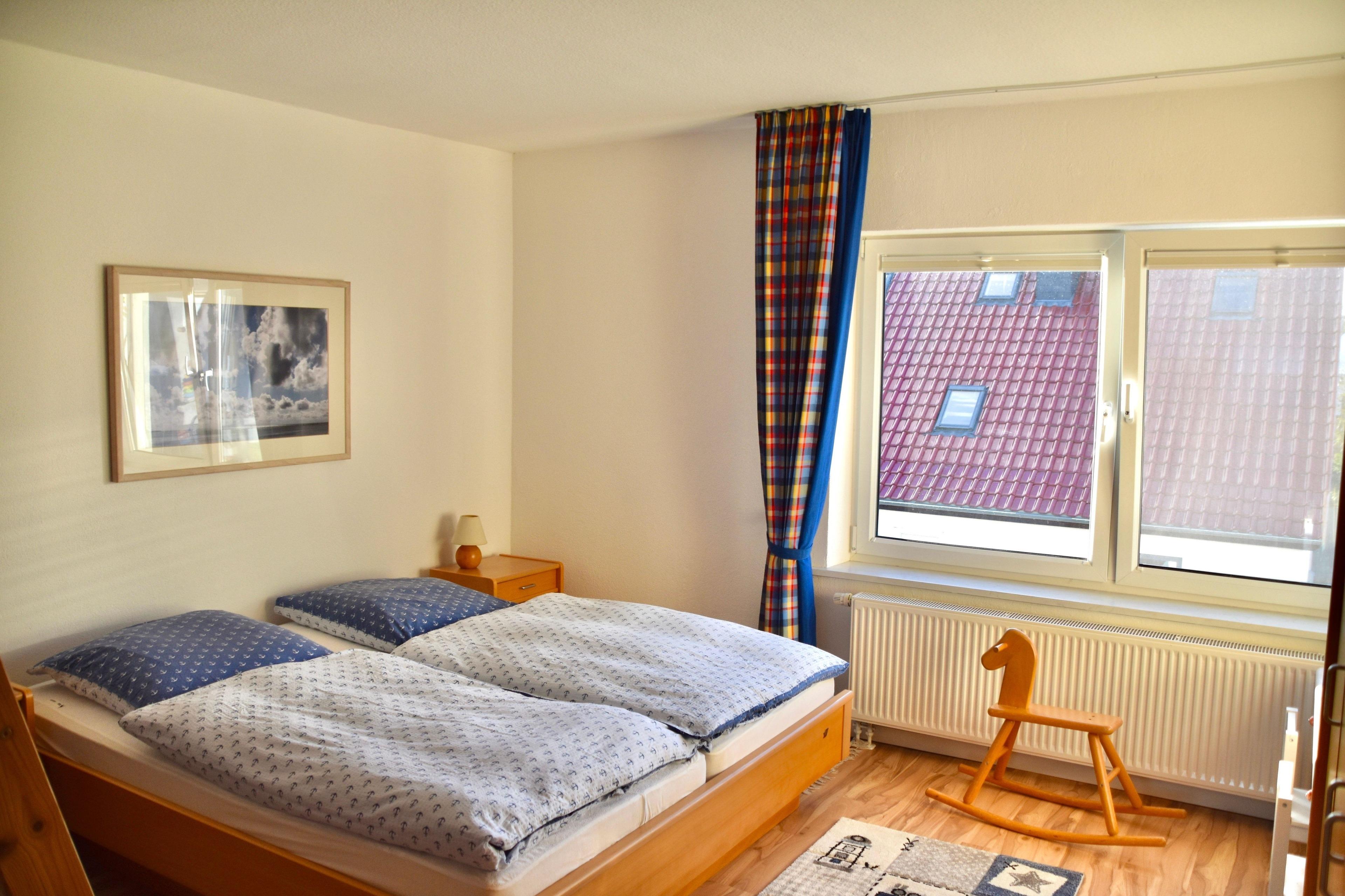 Auf dieser Etage gibt es ein geräumiges Familienschlafzimmer mit zwei Einzelbetten (Fiete 1) bzw. einem Doppelbett (180x200 cm) (Fiete 2) und jeweils einem Etagenbett (2x90x200cm). Ein weiteres Elternschlafzimmer ( Doppelbett 180x200 cm) mit Blick in den Garten Richtung Parkanlage "Brunnenaue". Ein weiteres Schlafzimmer für weitere zwei Gäste (Doppelbett 180x200 cm) mit einem weiteren Fernseher. Auch haben Sie ein großes Bad mit Badewanne, Dusche, zwei Waschbecken und Fön. Alle Wohn- und Schlafzimmer haben Fenster mit Sicht- und Insektenschutz.