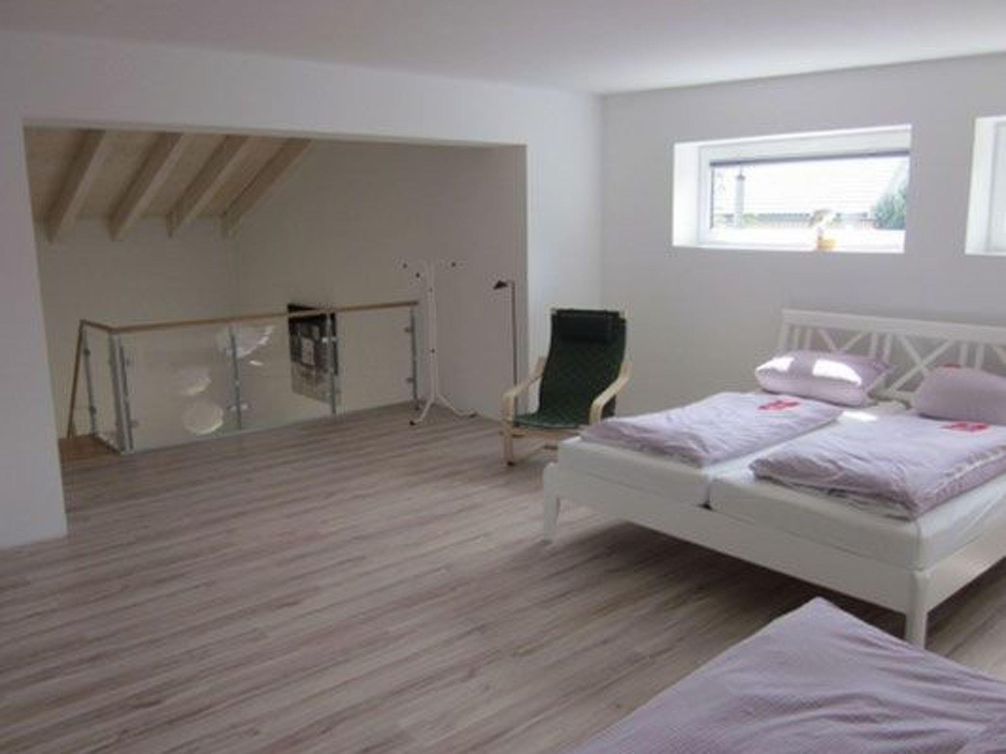 This maisonette holiday flat is located in the first house with two other flats. It has a living space of 55 square metres spread over two levels. Modern and comfortably furnished, it can accommodate up to five people. On the ground floor is the modern, spacious bathroom with walk-in shower, washbasin, WC, window and underfloor heating. The open-plan kitchen, which is equipped with an electric cooker, fridge, dishwasher, kettle, coffee machine and toaster, as well as a seating area with a table and four chairs, plus a sofa bed and sofa bed, are also located in the lower living area. From here, a staircase takes you directly to the open-plan, spacious sleeping area on the upper floor. Here you sleep in a double bed (180 x 200 cm) and on a double sofa bed. The room is also furnished with a small seating area, a wardrobe and a flat-screen TV. Underfloor heating allows the maisonette to be used all year round.