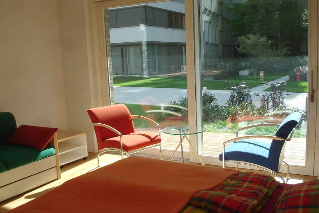 Die Ferienwohnung befindet sich in den Choriner Höfen, einem Neubauprojekt im Stadtbezirk Mitte. Der Berliner Hof wurde hier neu definiert und mit den neuesten architektonischen und städtebaulichen Konzepten umgesetzt. Die Ferienwohnung befindet sich im Erdgeschoss und verfügt über eine Terrasse und einen kleinen Garten. Das Wohnzimmer geht über in eine großzügige Veranda mit bodentiefen Fenstern und einer Glastür. Neben dem Doppelbett können Sie mit wenigen Handgriffen zwei weitere Schlafplätze aus einem Schlafsofa gewinnen. Fußbodenheizung, Eichenparkett, Bad mit Badewanne und hochwertigen Fliesen und Armaturen sind selbstverständlich. Darüber hinaus gibt es eine Luxusküche, hochwertige Designmöbel, WLAN und Telefonflat innerdeutsches Festnetz.