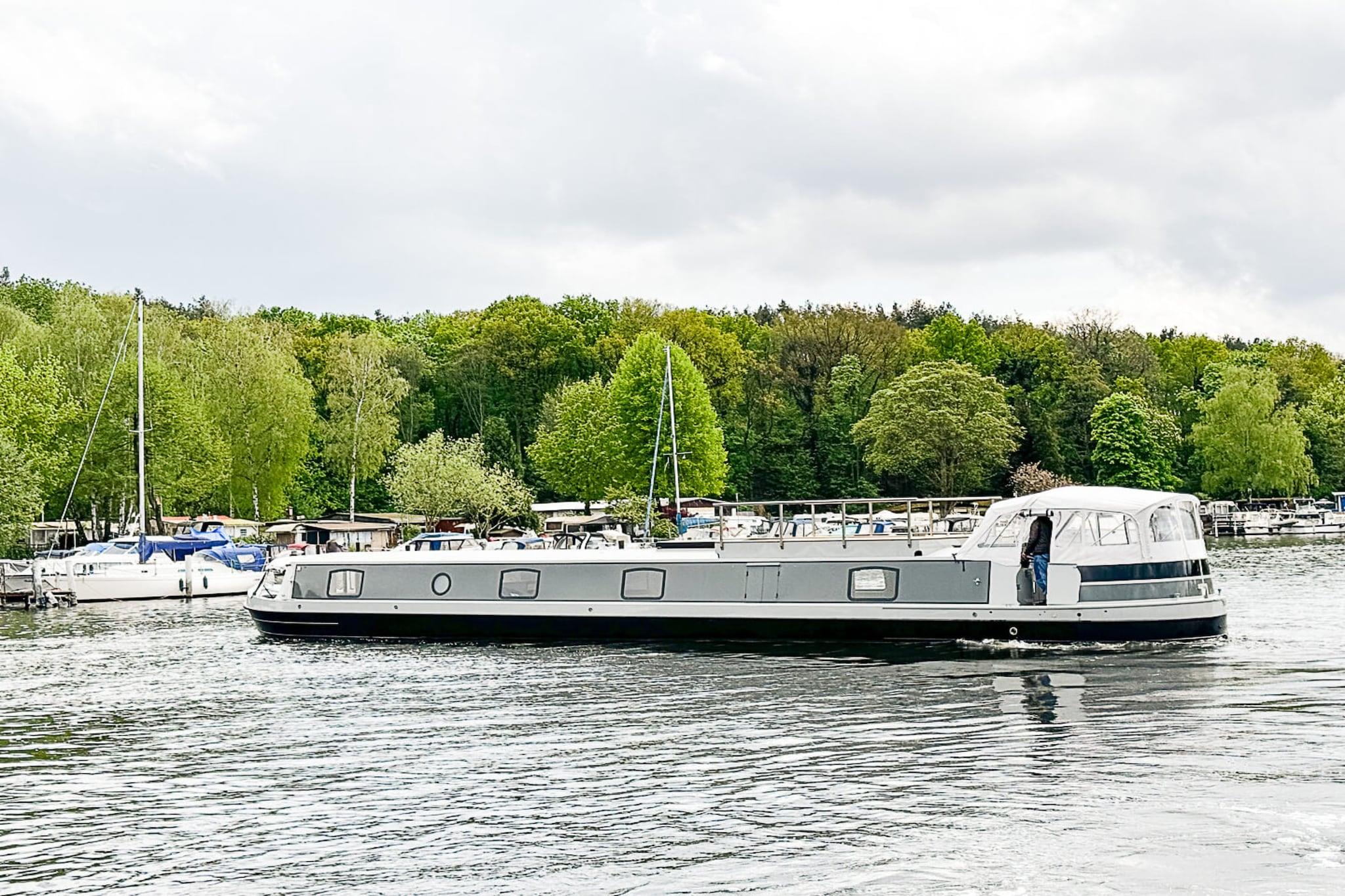 Oplev en unik ferie på den største husbåd, der nogensinde er blevet udbudt til leje i Tyskland. Dette 21 meter lange fartøj, der blev færdiggjort i december 2023, imponerer med sin moderne arkitektur, materialer af høj kvalitet og gennemtænkte layout, der harmonisk blander komfort og stil. Den rummelige tagterrasse giver de perfekte rammer for afslapning og solbadning, mens den stilfulde opholdsstue med pejs skaber en hyggelig atmosfære til rolige aftener. To komplette soveværelser, et moderne badeværelse og et fuldt udstyret køkken sikrer, at du har alt, hvad du behøver under dit ophold. Husbåden ligger fortøjet i den charmerende Passion Yachts-marina ved Pichelsee i Berlin. Det omkringliggende område byder på adskillige muligheder for aktive eller afslappende fritidsaktiviteter: tag på bådture, svøm eller fisk direkte fra dækket, eller udforsk det grønne landskab på en cykeltur. Populære destinationer som Charlottenburg Slotspark og Olympiastadion ligger også i nærheden - ideelt til udflugter på land. Et ophold på denne permanent fortøjede husbåd lover særlige øjeblikke væk fra hverdagens travlhed. Den blide gyngen på vandet, den rolige beliggenhed ved Pichelsee og følelsen af frihed skaber et sted med afslapning og eksklusivitet. Hver dag ombord kan skræddersys til dine individuelle behov – perfekt til par, familier eller små grupper.