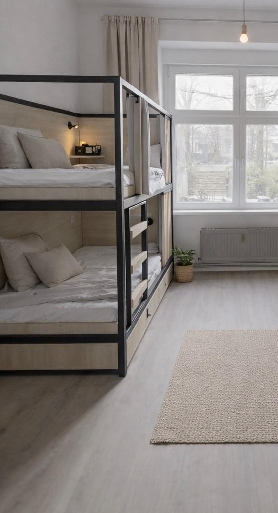 Das Bett im Mixed Dorm 8 bietet die ideale Kombination aus Preis, Komfort und urbanem Hostelgefühl. Moderne Etagenbetten mit persönlicher Beleuchtung, Stromanschluss und praktischer Ablage sorgen für angenehmen Schlafkomfort. Perfekt für Gäste, die Berlin entdecken und gleichzeitig modern sowie unkompliziert wohnen möchten.