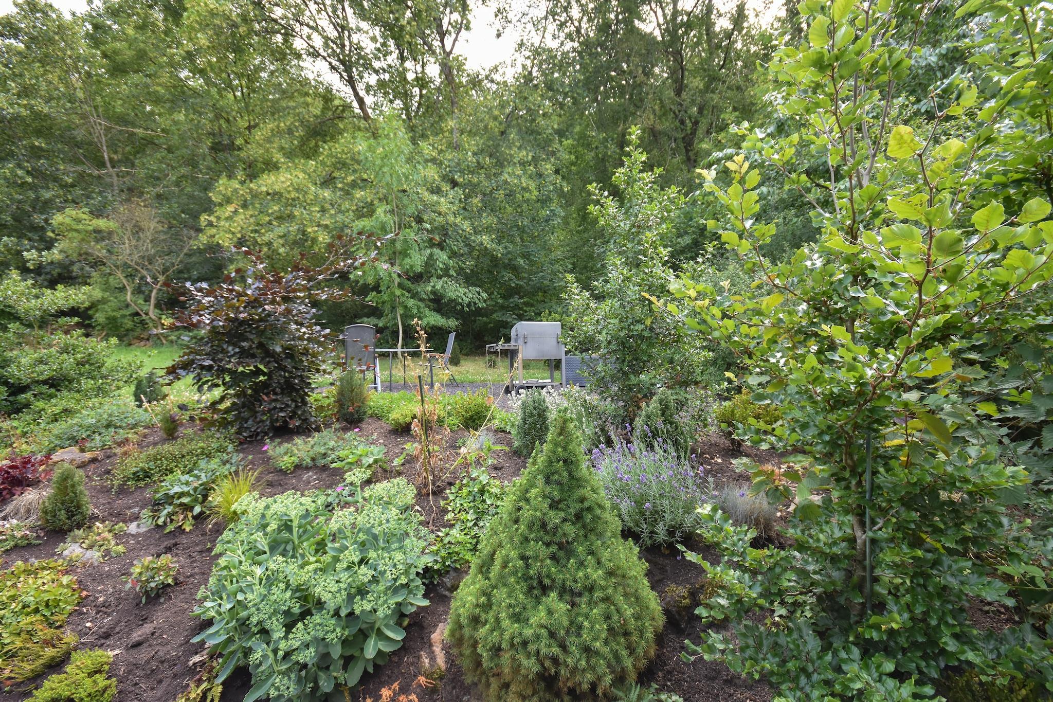 Stue/soveværelse(Køkken, dobbeltseng, spisebord, kakkelovn, sofahjørne, elkedel, kaffemaskine, ovn, køleskab), badeværelse(bruser, håndvask, toilet), pejs, terrasse, havemøbler, grill, parkering