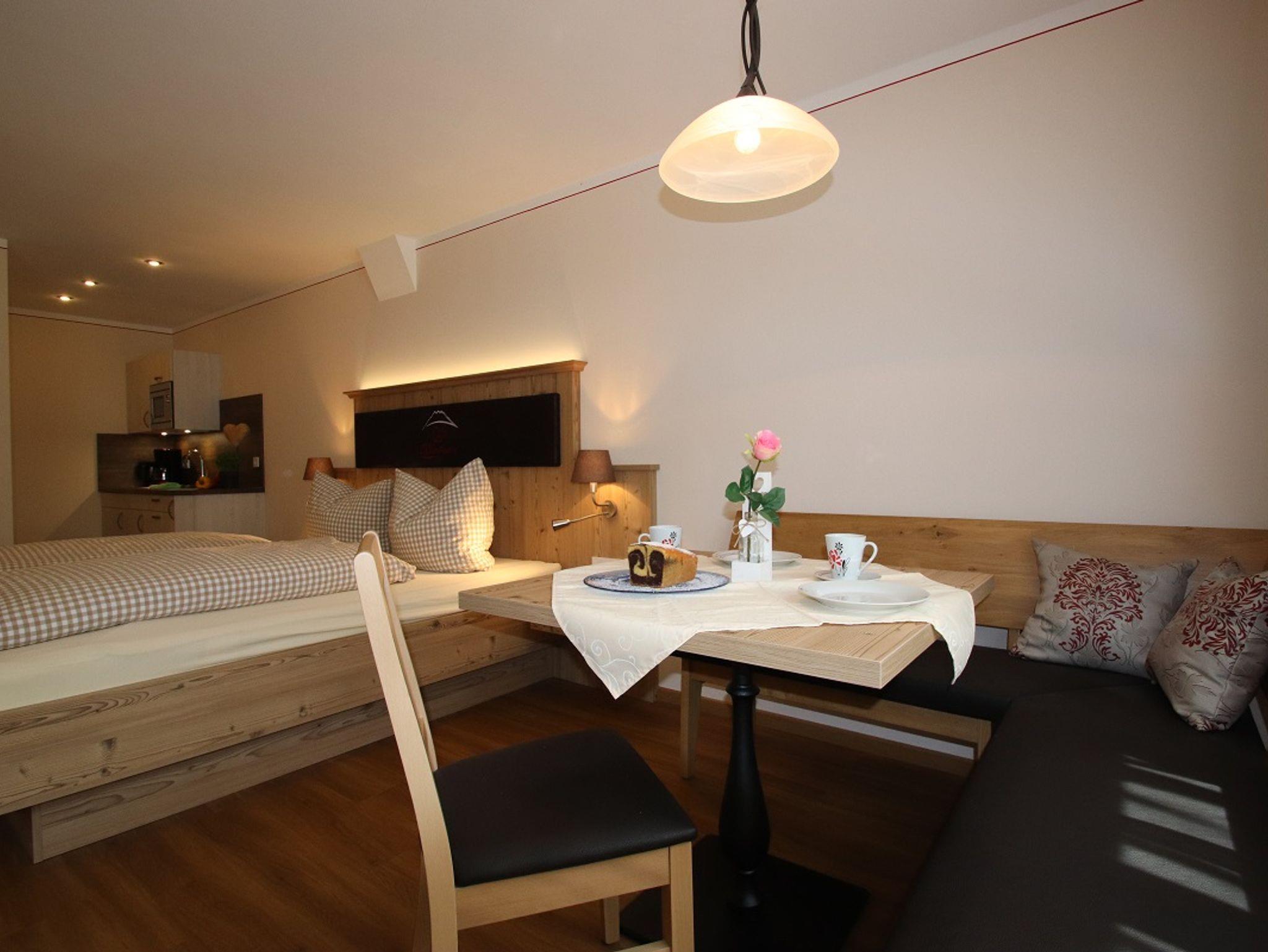 Unser neues Deluxe Doppelzimmer mit ca. 40 qm, bieten für 2 bis 4 Personen genügend Wohnfläche. Ein Babybett ist auch möglich. Eine komplett ausgestattete Küche befindet sich im Zimmer. Der großzügige, kombinierte Wohn-Schlafbereich mit einer Eckbank und ausziehbarem Sofa ist sehr hell und geräumig. Das freundliche, großzügige Badezimmer ist mit Dusche/WC ausgestattet. Auf ihrer eigenen Südterrasse können Sie die Ruhe und die Bergwelt genießen. Kostenloses WLAN.