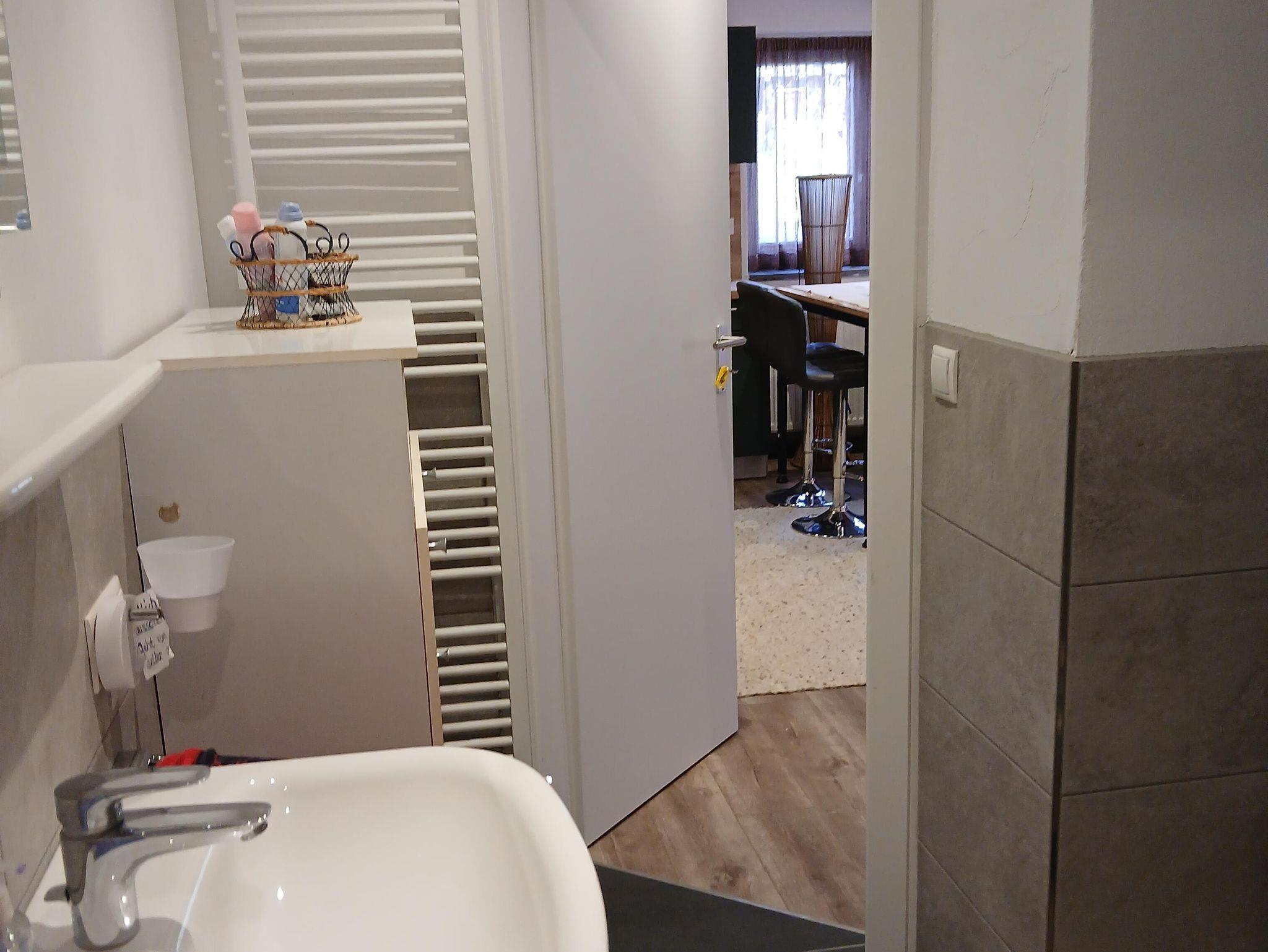 Vom Badezimmer aus geht es direkt in die angrenzende Wohnküche.