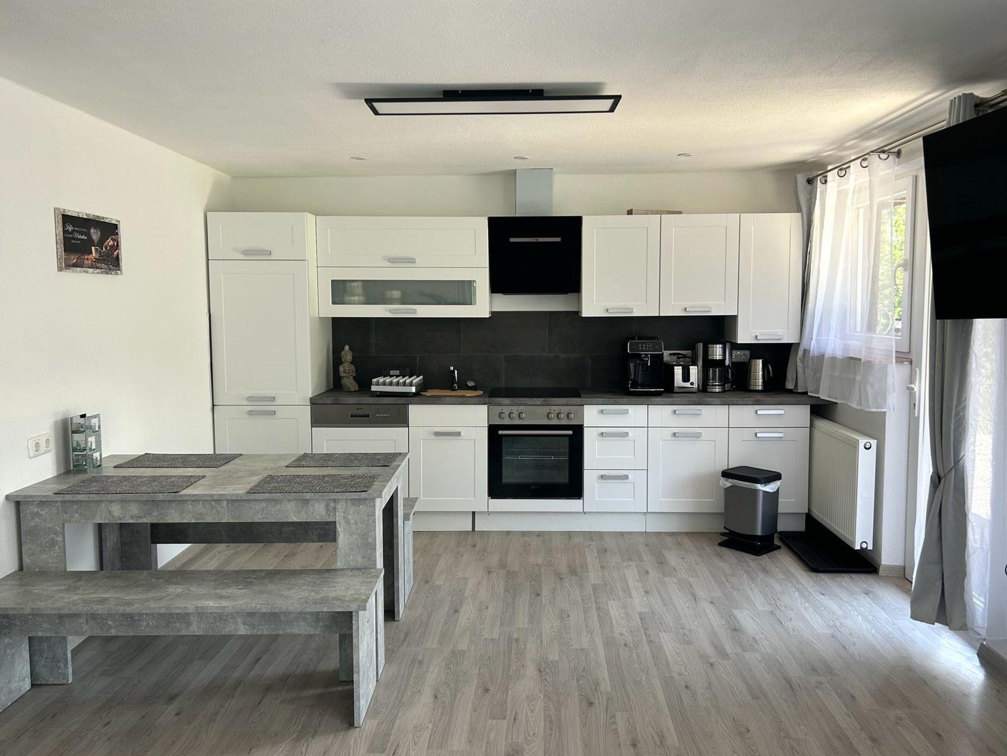 Essecke, Wohnzimmer mit großem Flat-TV und Sofa und einer Küche mit Spülmaschine, Kaffeevollautomat, Backofen, Kühlschrank mit kleinem Gefrierfach und weiteren Elektrogeräten wie Toaster, Wasserkocher, Kaffeemaschine; ein kleineres Zimmer mit einem Doppelbett; ein großes Schlafzimmer mit einem Doppelbett in L-Ausführung; ein Badezimmer mit