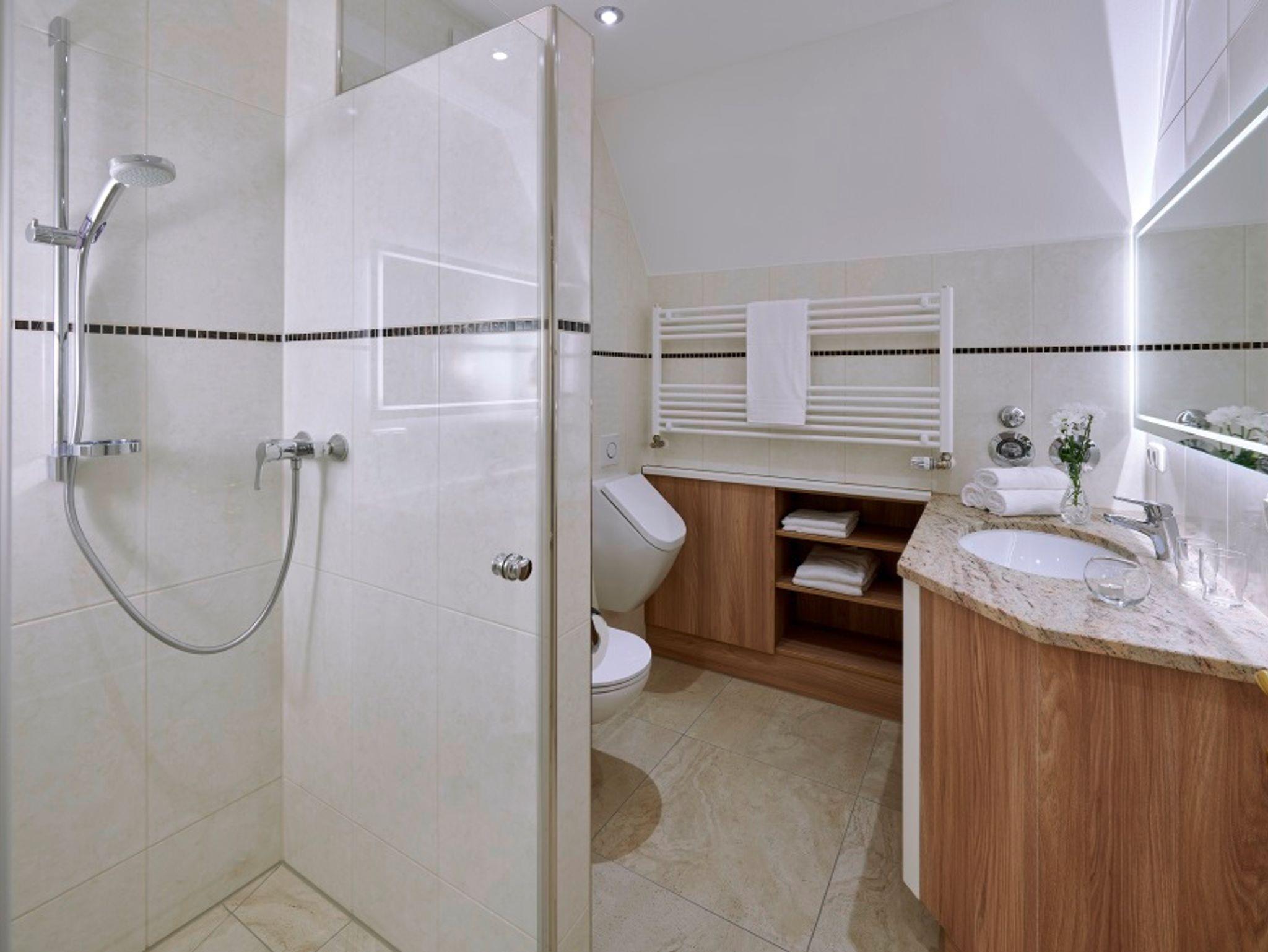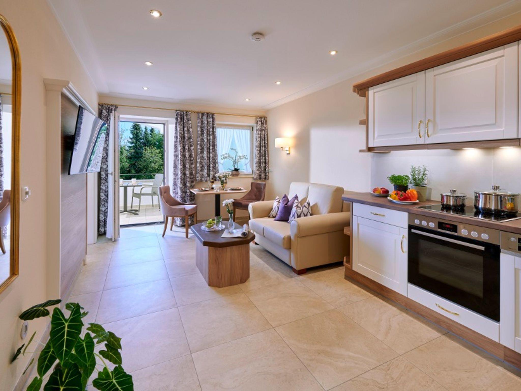 Die Ferienwohnung ist in Richtung Nord-Ost zur Kirche und zum Kurpark ausgerichtet. Der Balkon befindet sich an der Ostseite. Alle Fewos sind ausgestattet mit Flachbild-Fernseher 40 bzw. 43 Zoll, Herd mit Backofen, Spülmaschine, Kühlschrank mit Gefrierfach, Kaffeemaschine, Toaster, Kochgeschirr, Geschirr, Safe, Föhn, WLAN, Geschirrtücher, Bettwäsche und Handtücher.Für alle Gäste: Aufzug, Aufenthaltsraum im EG, Waschmaschine und Trockner im EG, Terrasse im EG, Park (5000 m²) mit Liegen, ausreichend Parkplätze, abschließbare Fahrradgarage und Sauna.