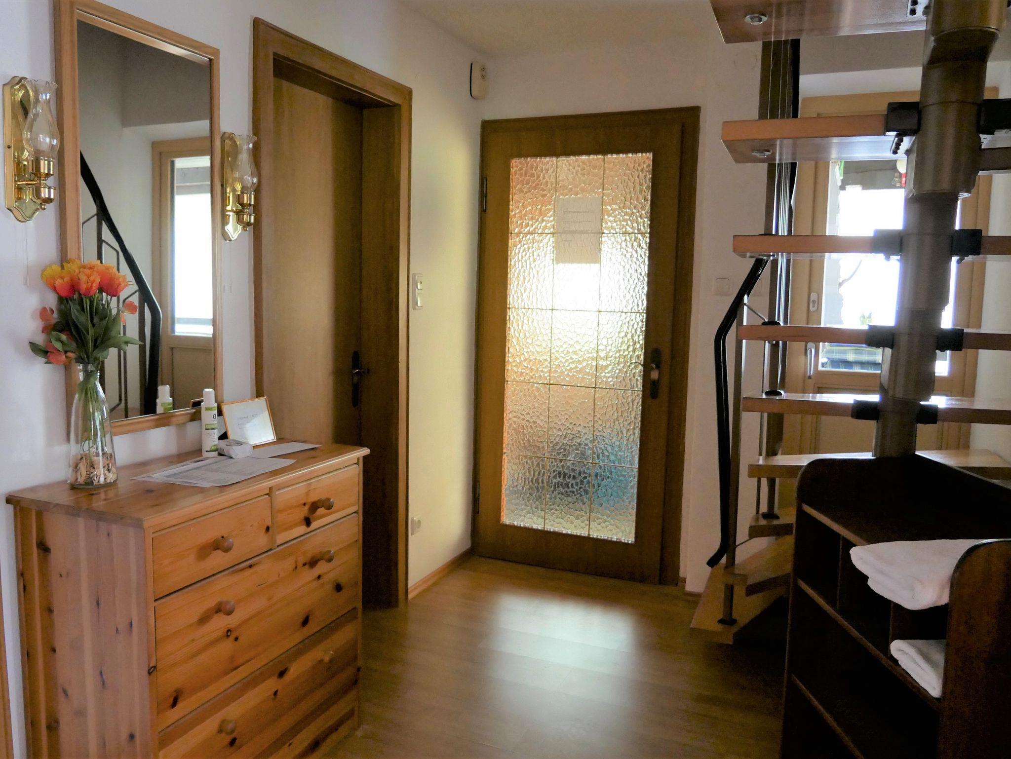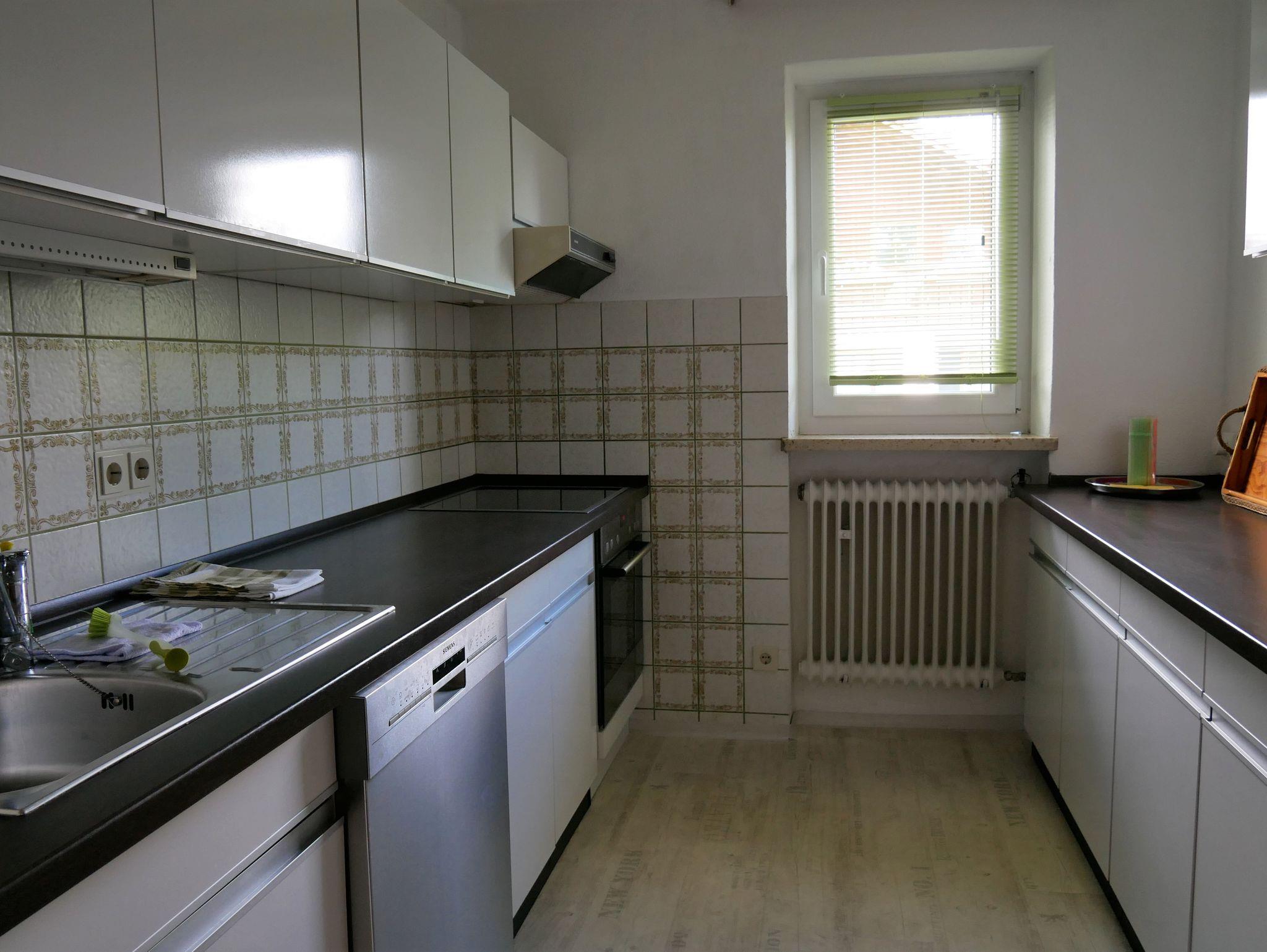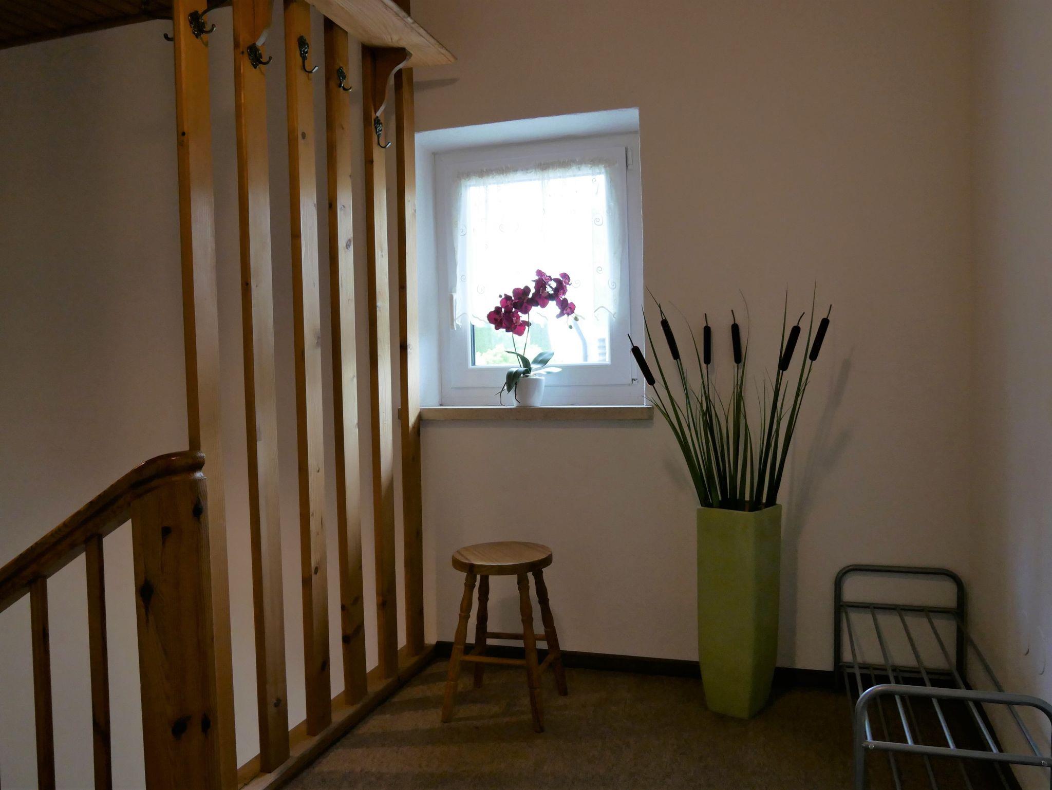 Rustikal eingerichtete Ferienwohnung im 1. Stock eines Zweifamilienhauses : Separates Schlafzimmer mit Doppelbett und großem Kleiderschrank; sehr geräumiges Wohnzimmer mit Eckbank, Sitzgruppe, offenem Kamin , Sat-TV, Radio; separate Küche mit Backofen, Geschirrspüler, Toaster, Kaffeemaschine, Wasserkocher, Mikrowelle; Bad/WC; grosser überdachter Balkon nach Osten/Süden. Zweites separates Schlafzimmer mit Doppelbettcouch in der Mansarde (hier zusätzlich kleines Waschbecken, separates WC und eigener TV-Anschluss). Die 6. Person darf nur ein Kind mit dem Höchstalter von ca. 3 Jahren sein, da nur ein Kinderreisebett vorhanden ist.