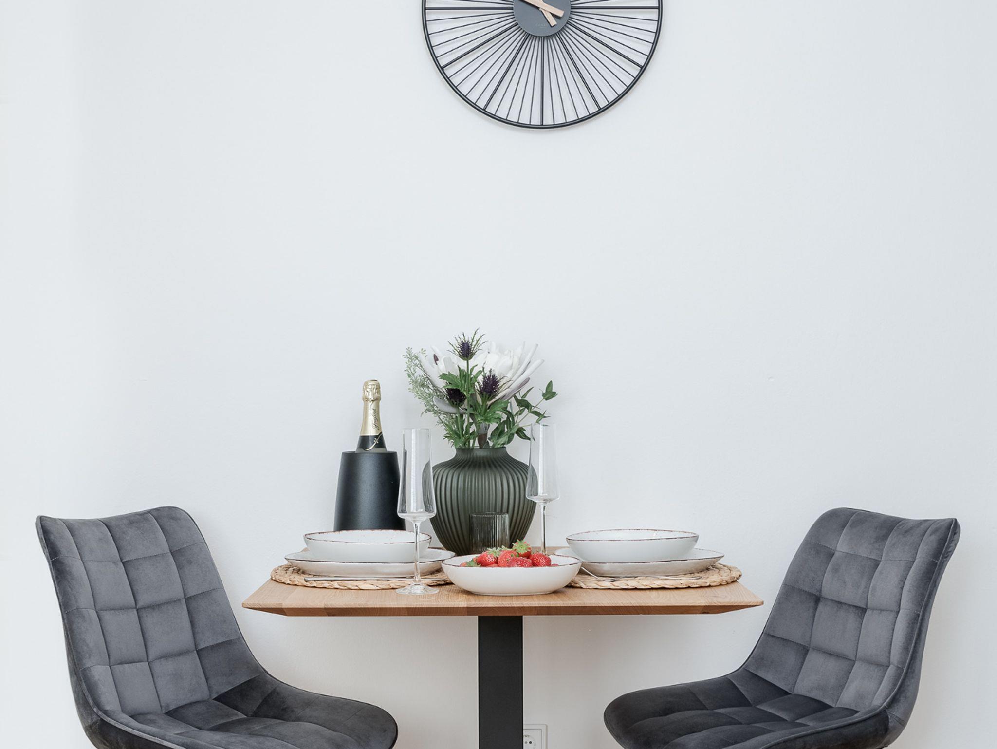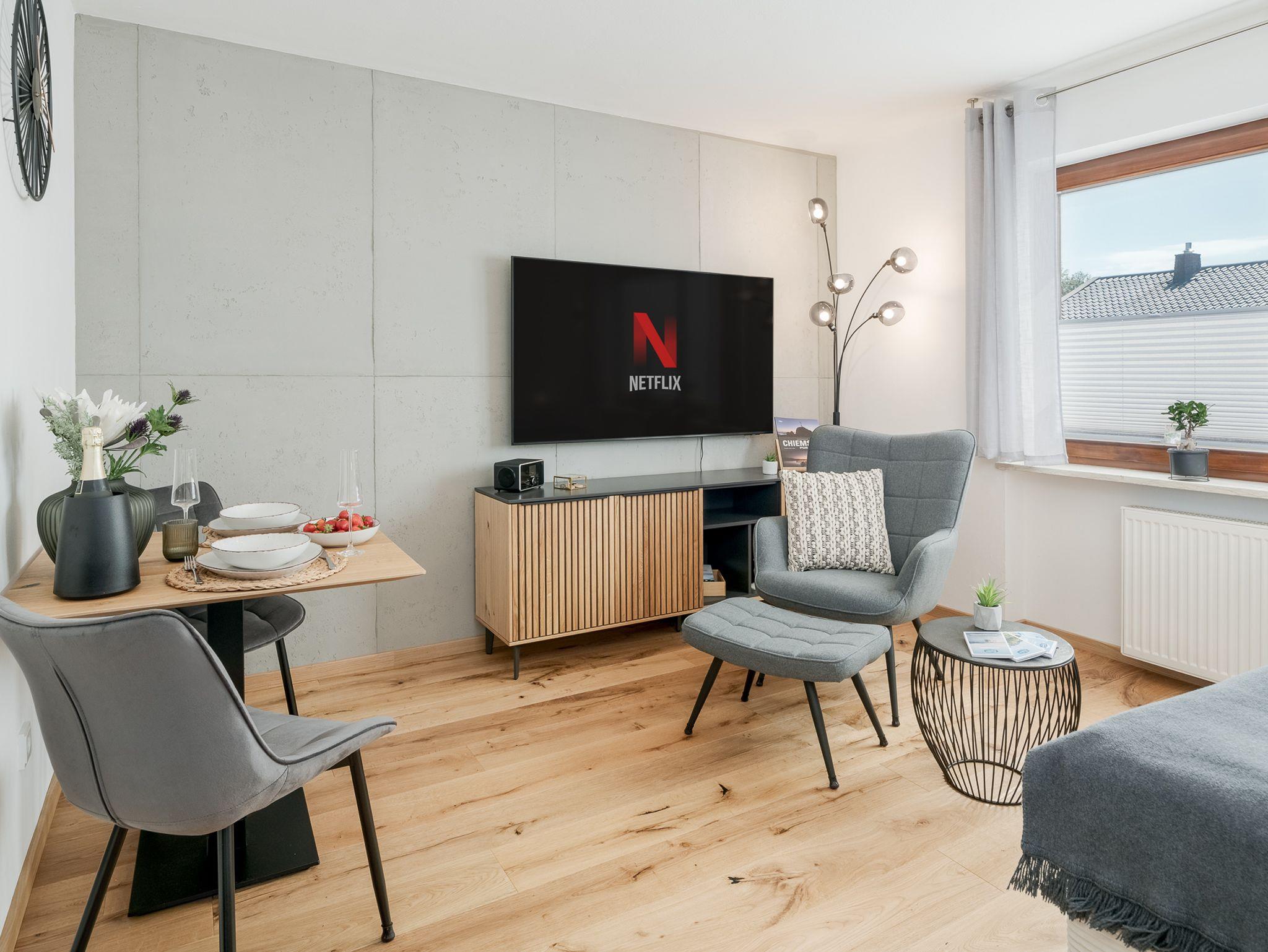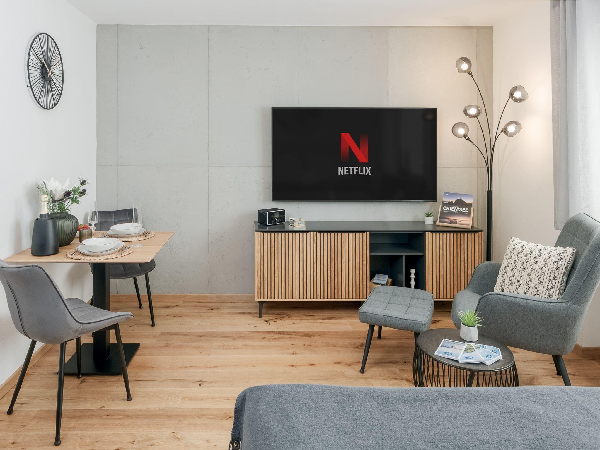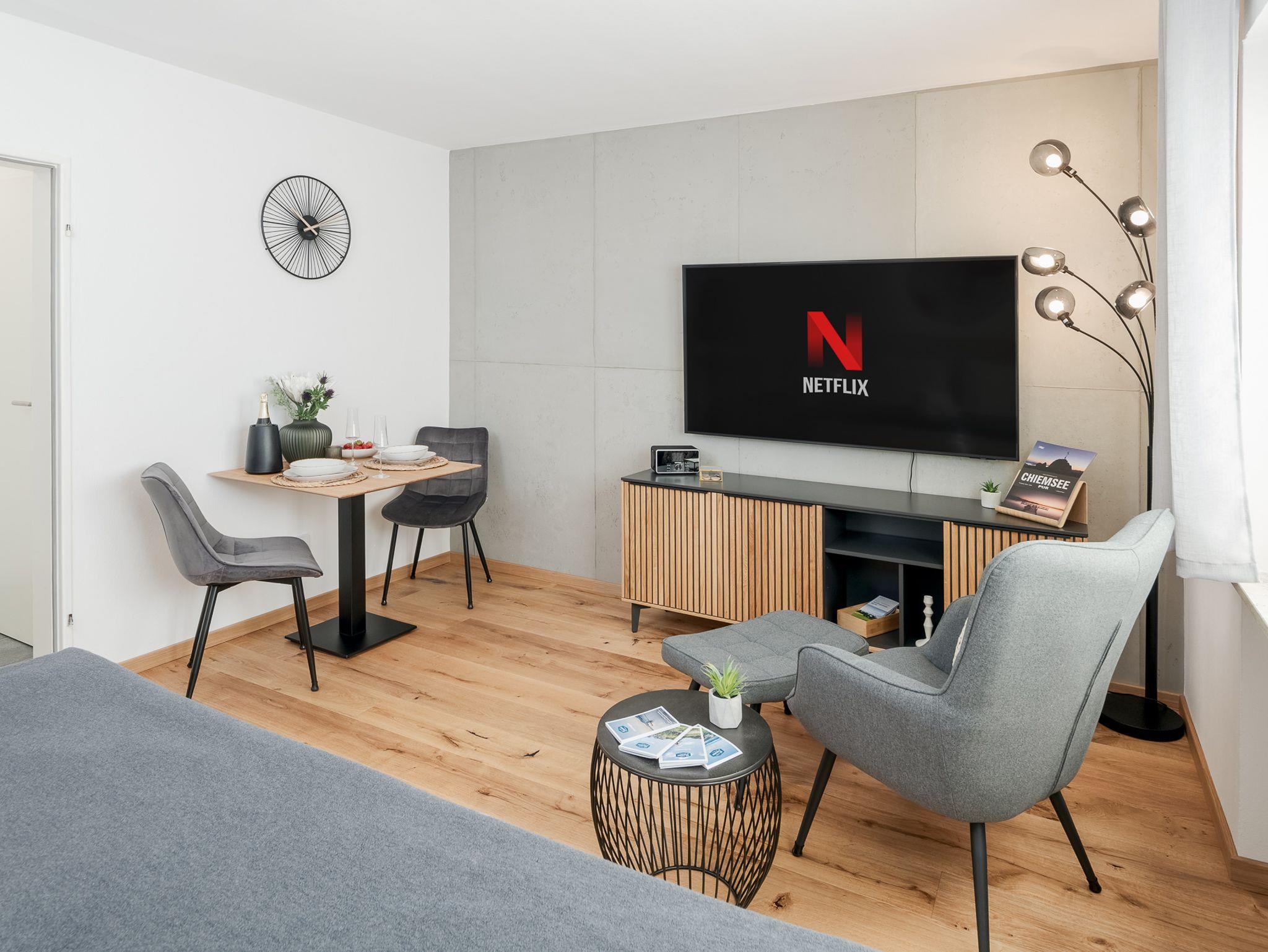 Darüber hinaus verfügt die Wohnung über einen Essbereich für 2 Personen. Entspann Dich anschließend im gemütlichen Ambiente, das mit einem 65-Zoll-Smart-TV inkl. NETFLIX und Internet-TV in UHD-Qualität ausgestattet ist. Genieße Deine Lieblingssendungen und Filme in bester Bildqualität.